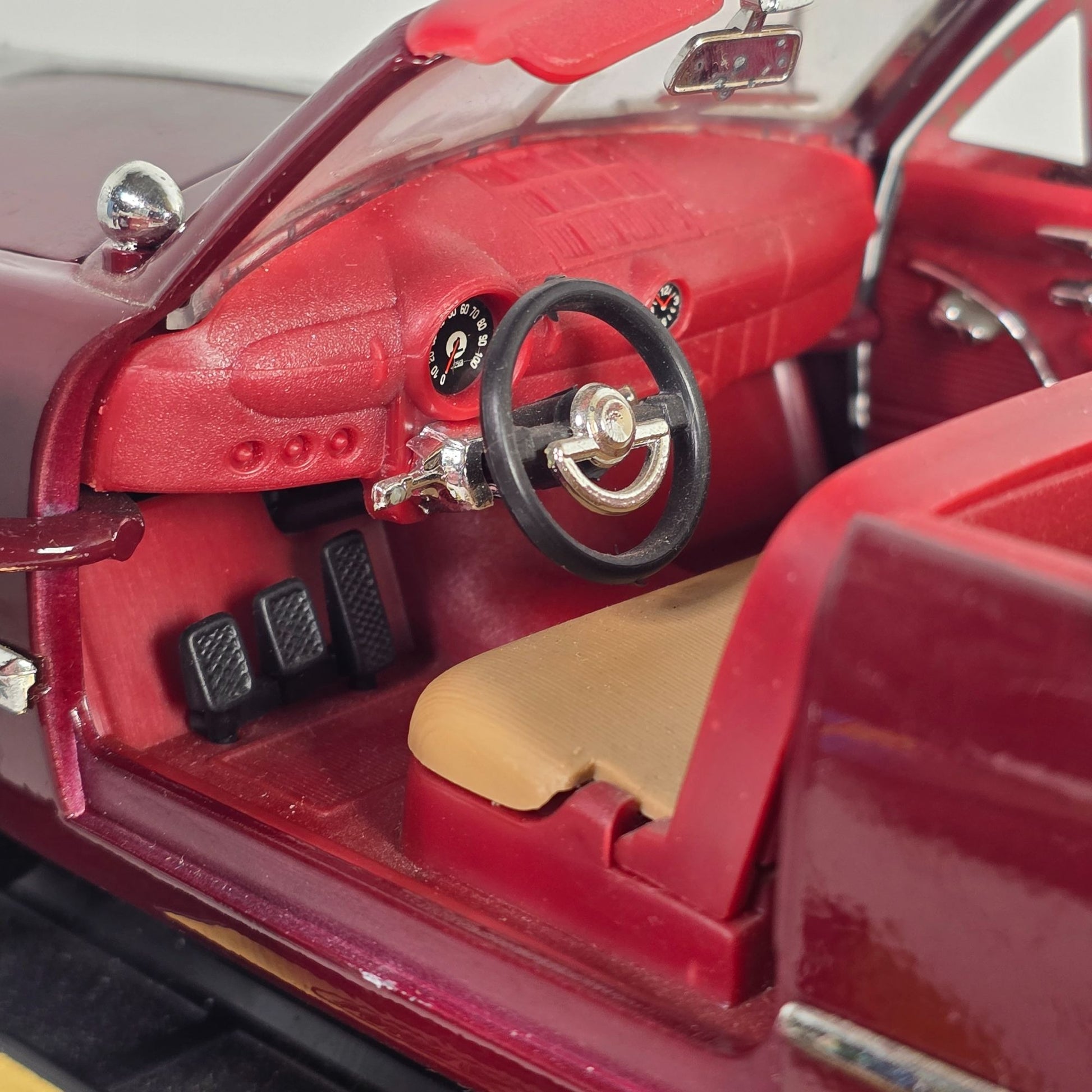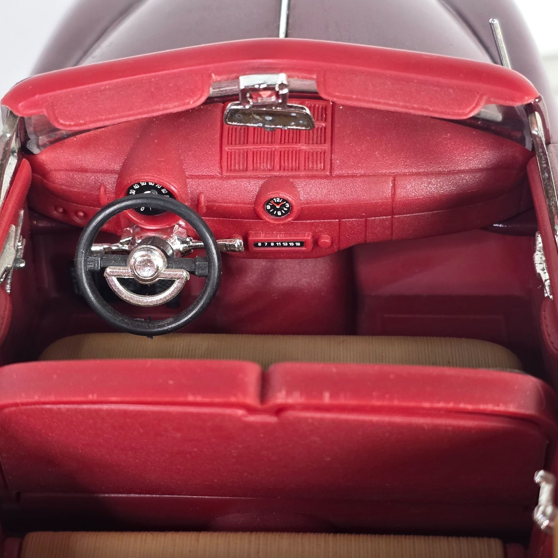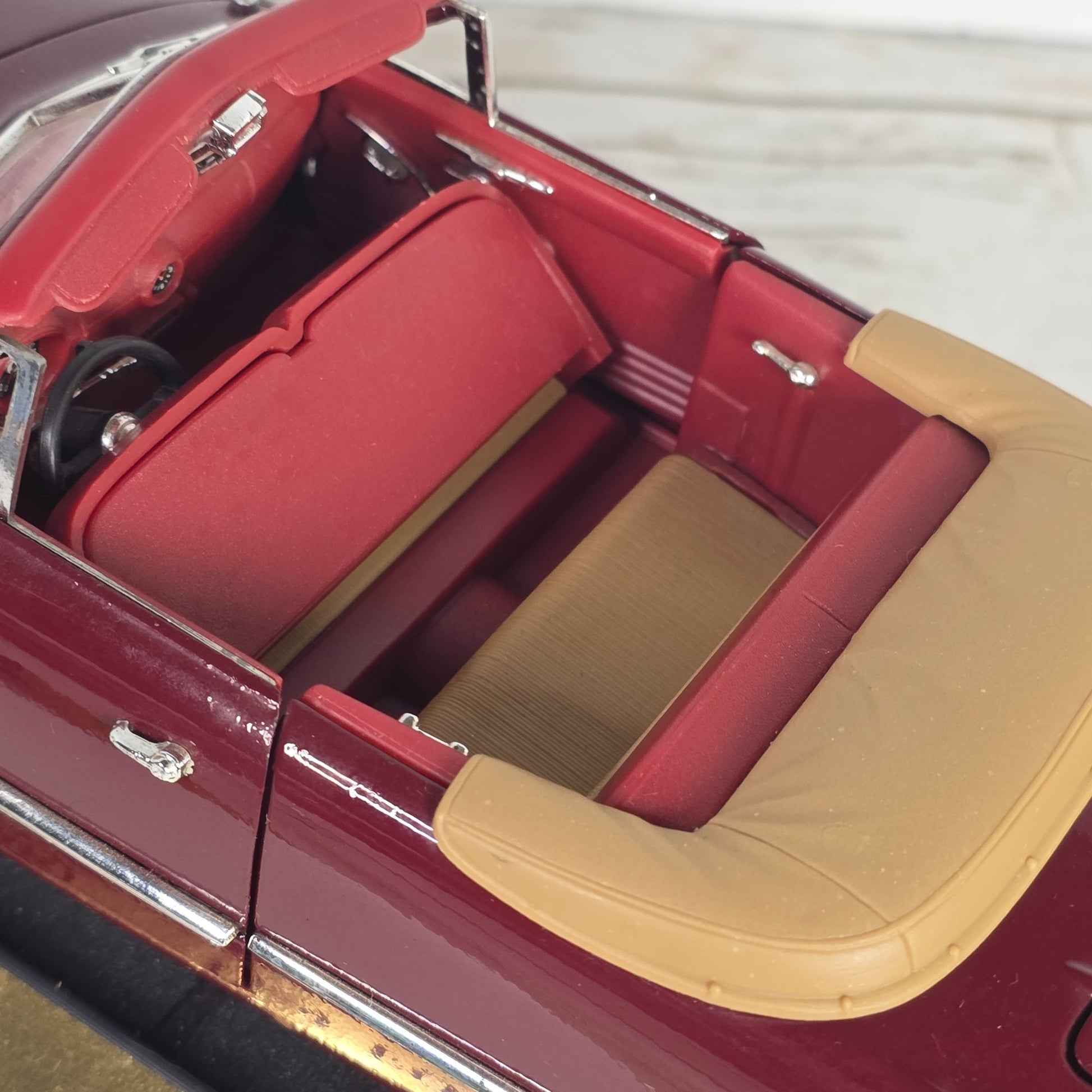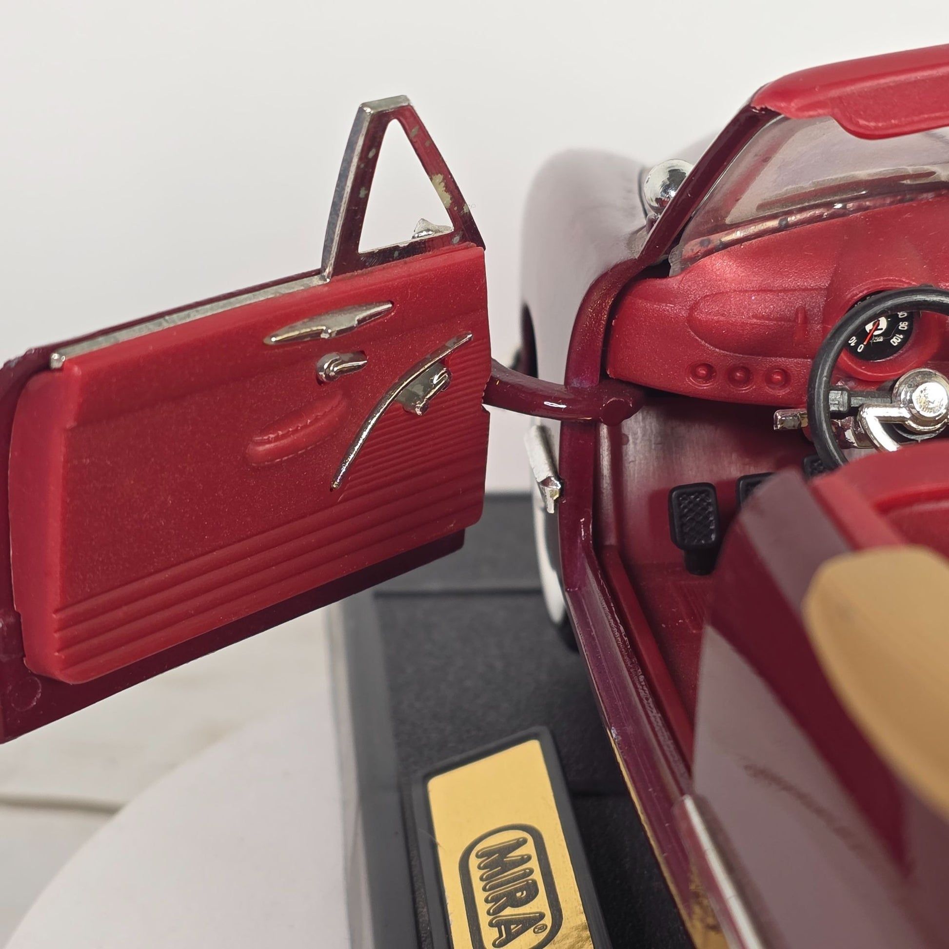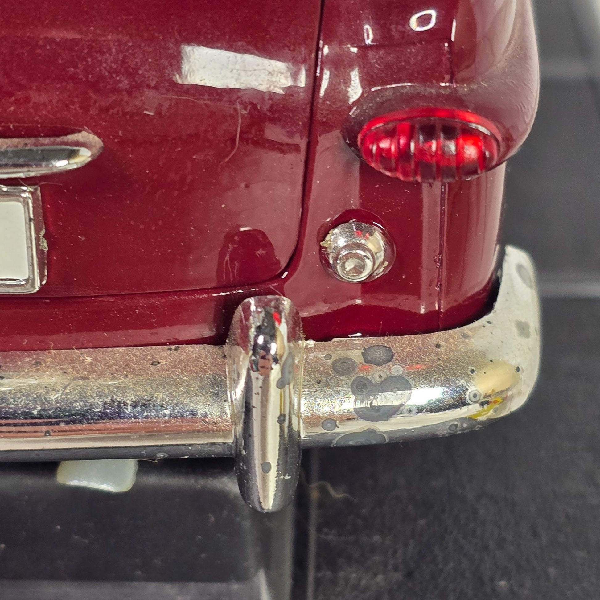 This meticulously crafted 1949 Ford Convertible diecast model by MIRA captures the essence of vintage automotive design. The rich maroon hue is complemented by a contrasting tan interior, presenting a striking visual contrast. Despite its charming aesthetics, the model's box is in poor condition, missing its protective plastic shell, which adds a unique vintage touch to its overall appeal. An ideal collectible for car enthusiasts, it embodies nostalgia and craftsmanship associated with the golden age of automobiles.