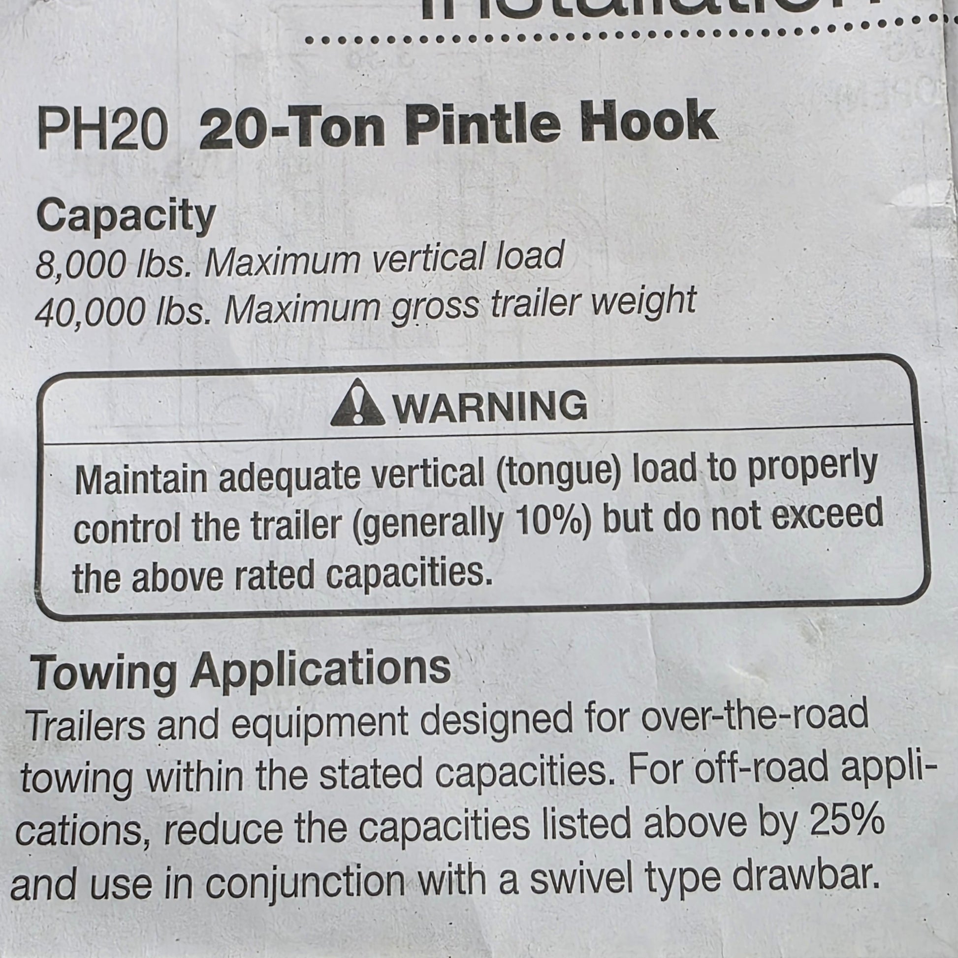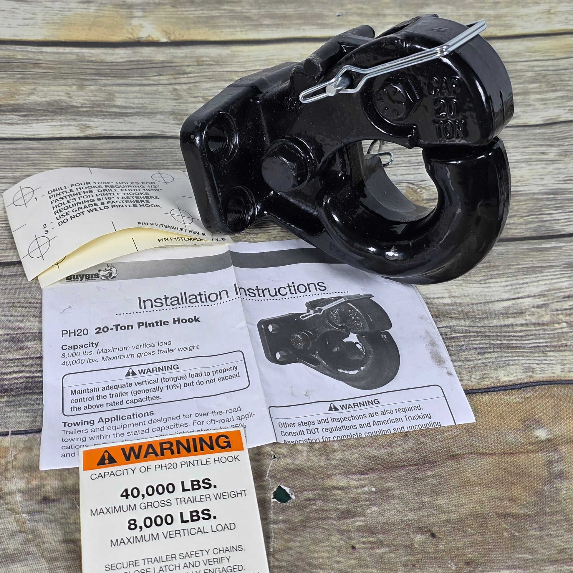 Introducing the Buyers Products PH20 20 Ton Pintle Hook, capable of handling a MGTW of 40,000 pounds and an 8,000 pound vertical load. This heavy-duty pintle hitch comes with a separate mounting kit and is designed for maximum strength and durability. Perfect for heavy-duty towing needs.
