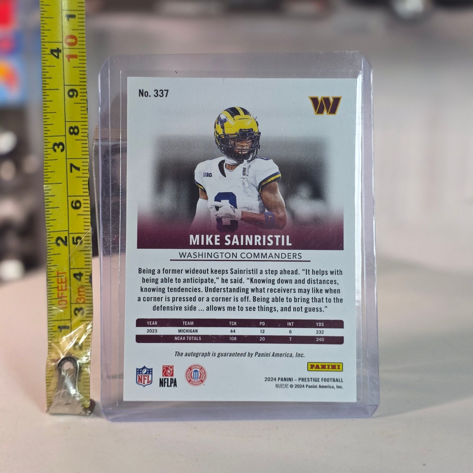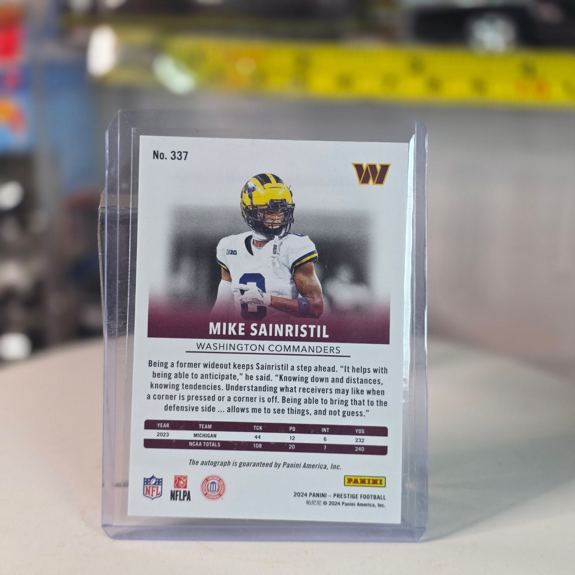 This 2024 Panini Prestige #337 rookie card showcases Mike Sainristil in his Washington Commanders uniform. A limited-edition card, numbered 35/50, it features a stunning Xtra Points holographic design with a certified autograph. Encased in a protective loader, this card is a highly sought-after gem for collectors.