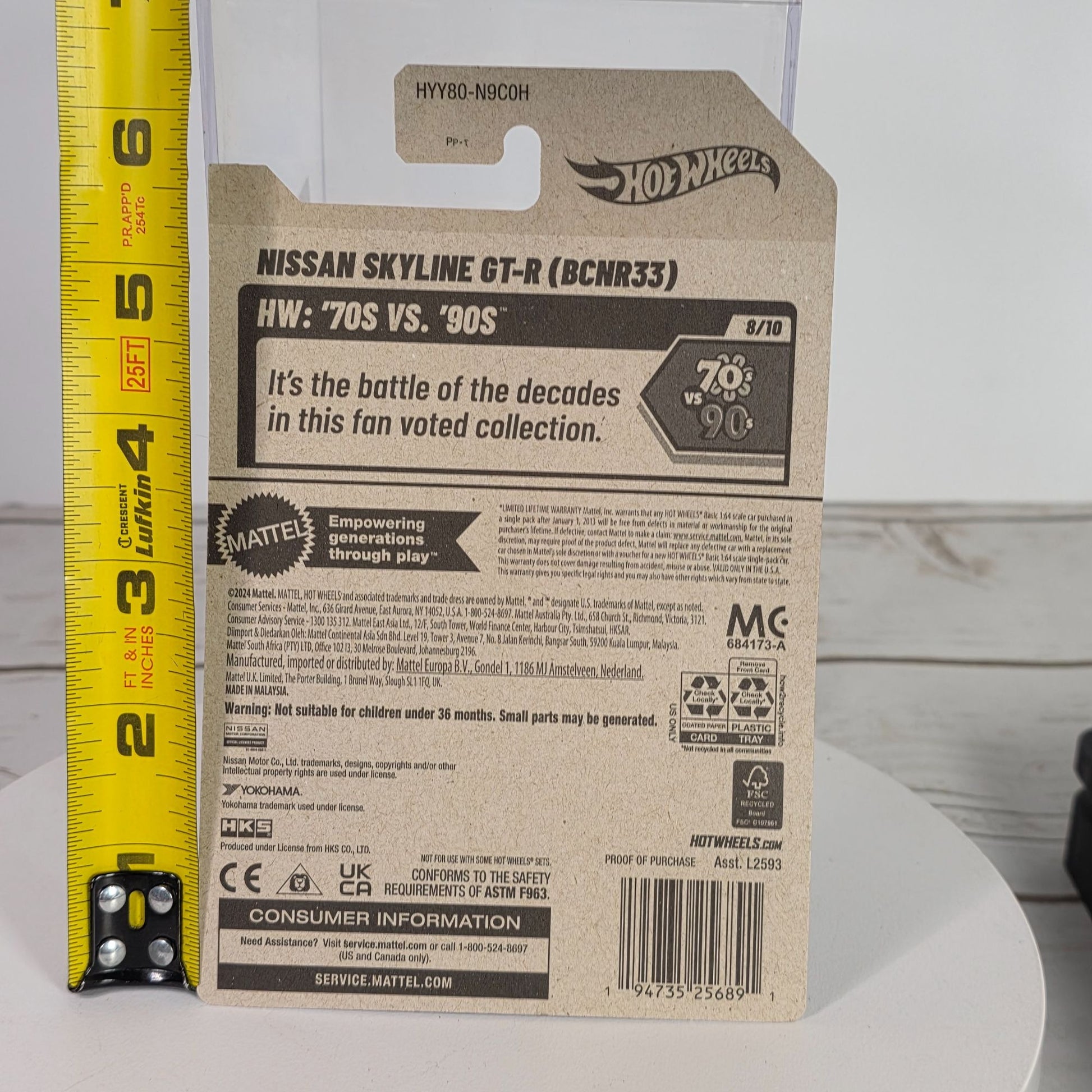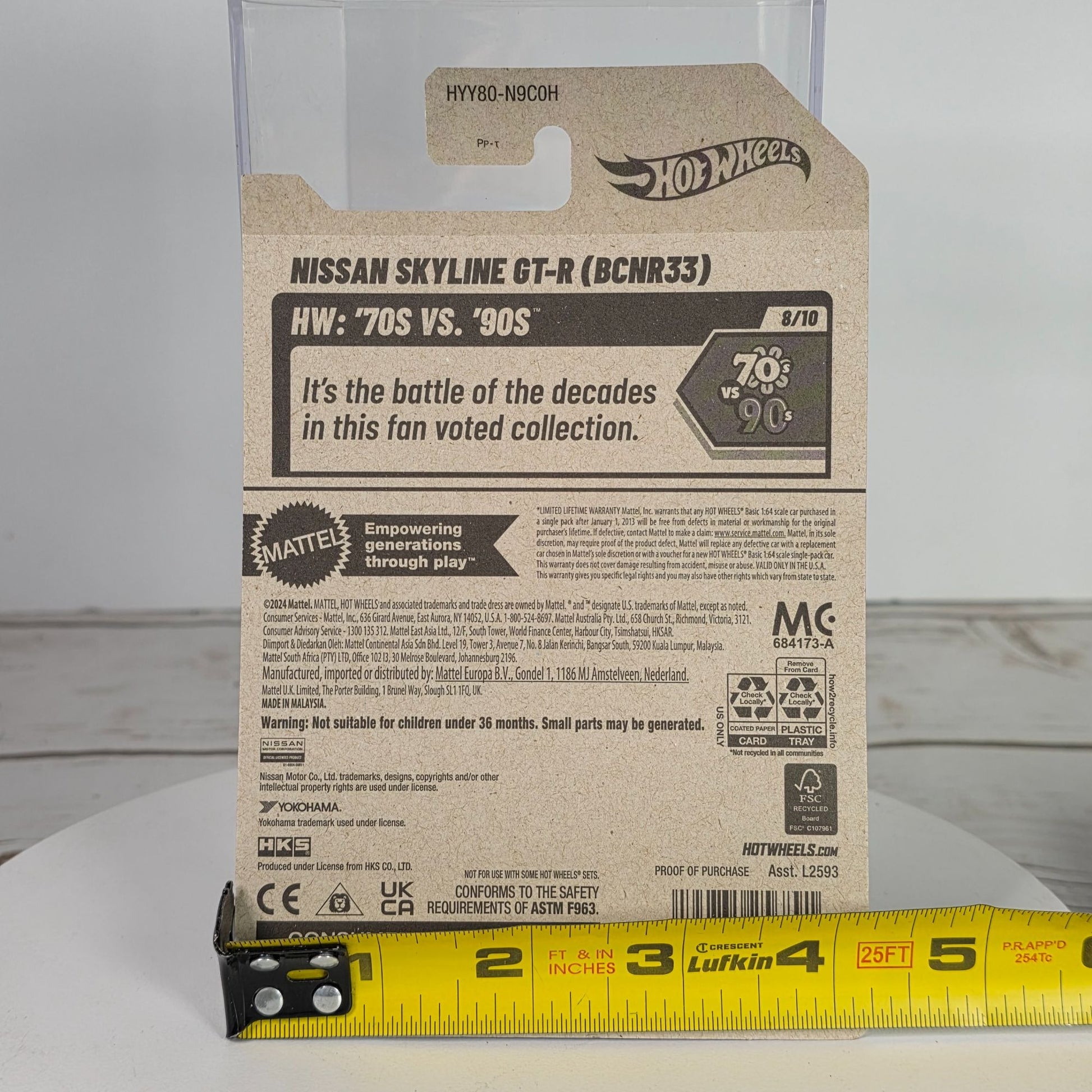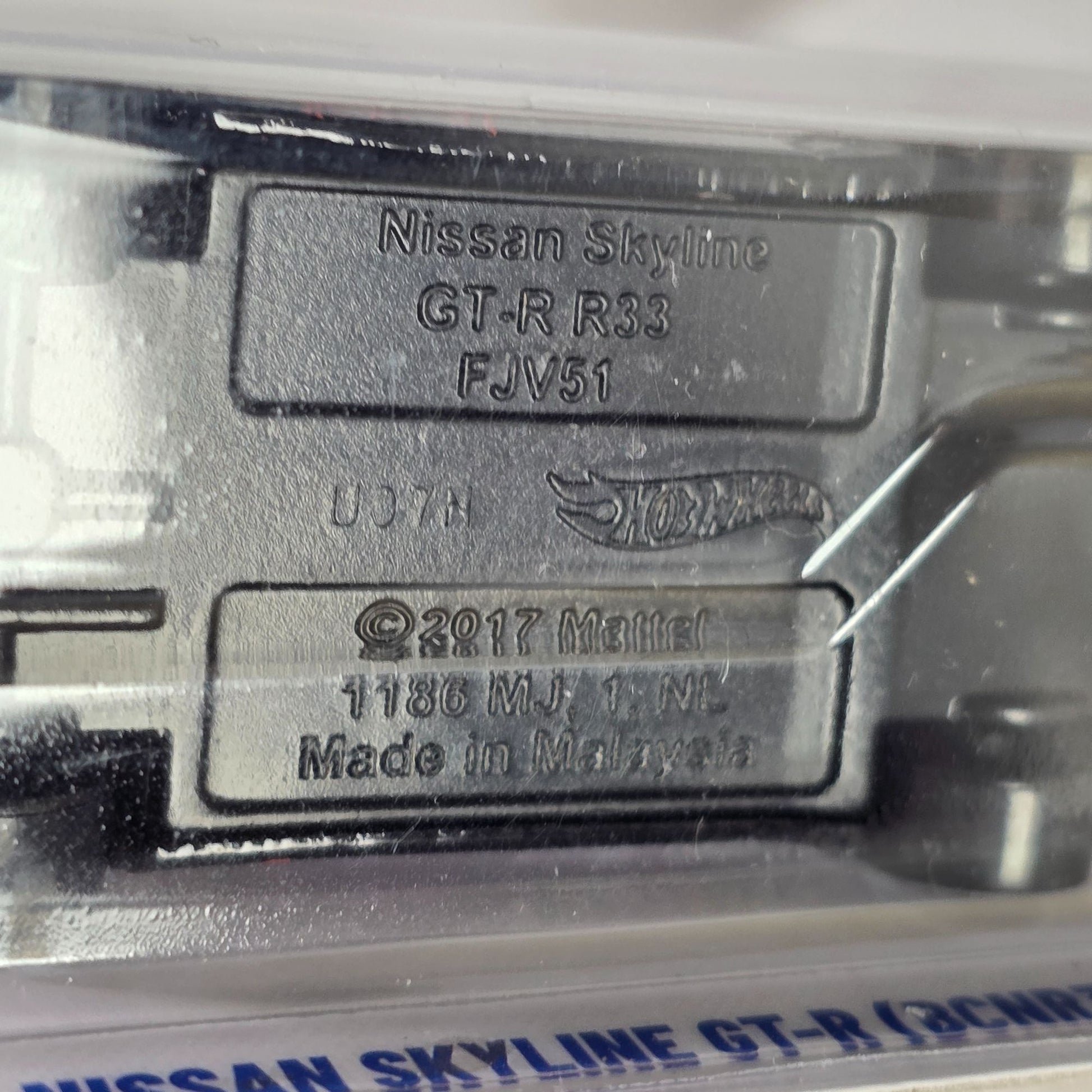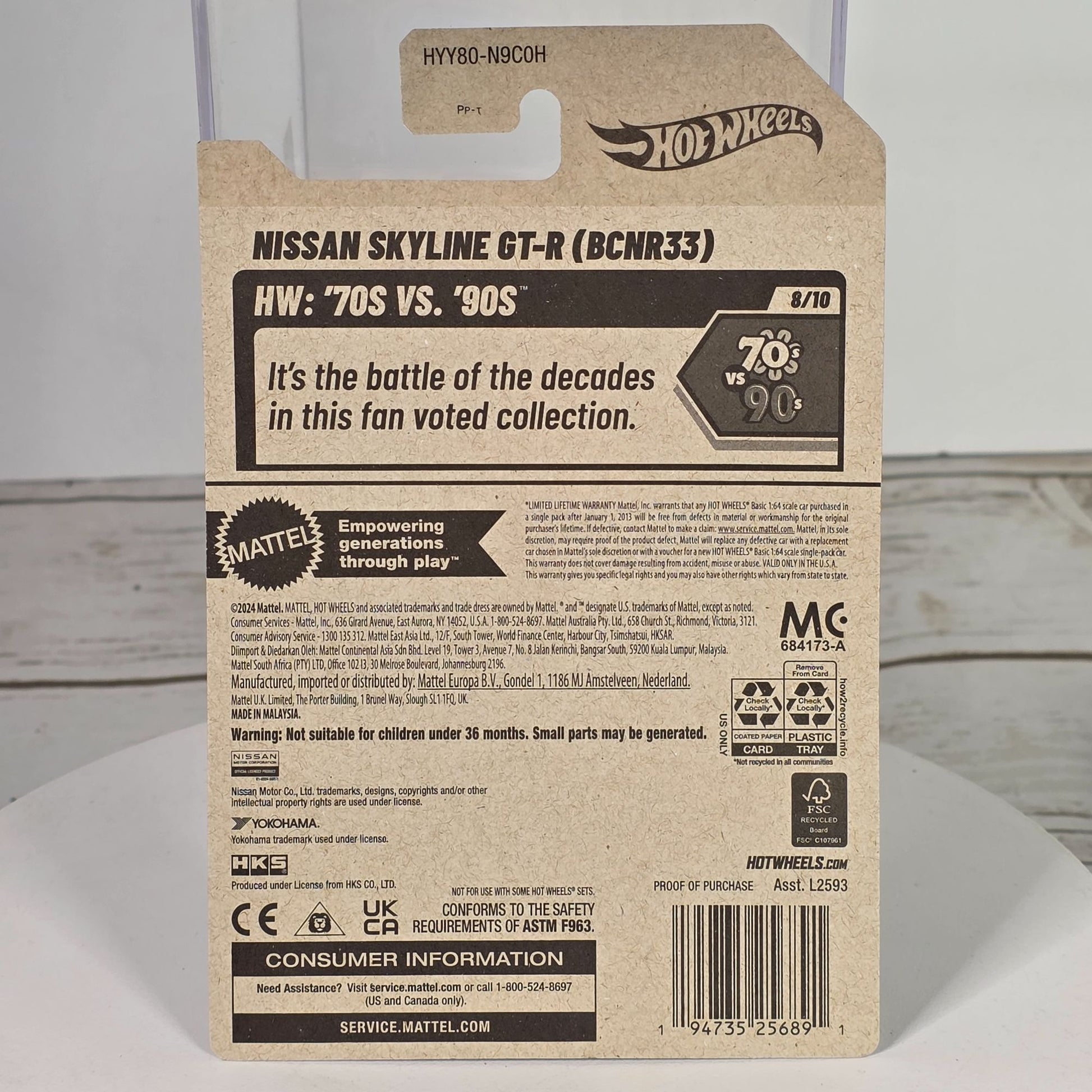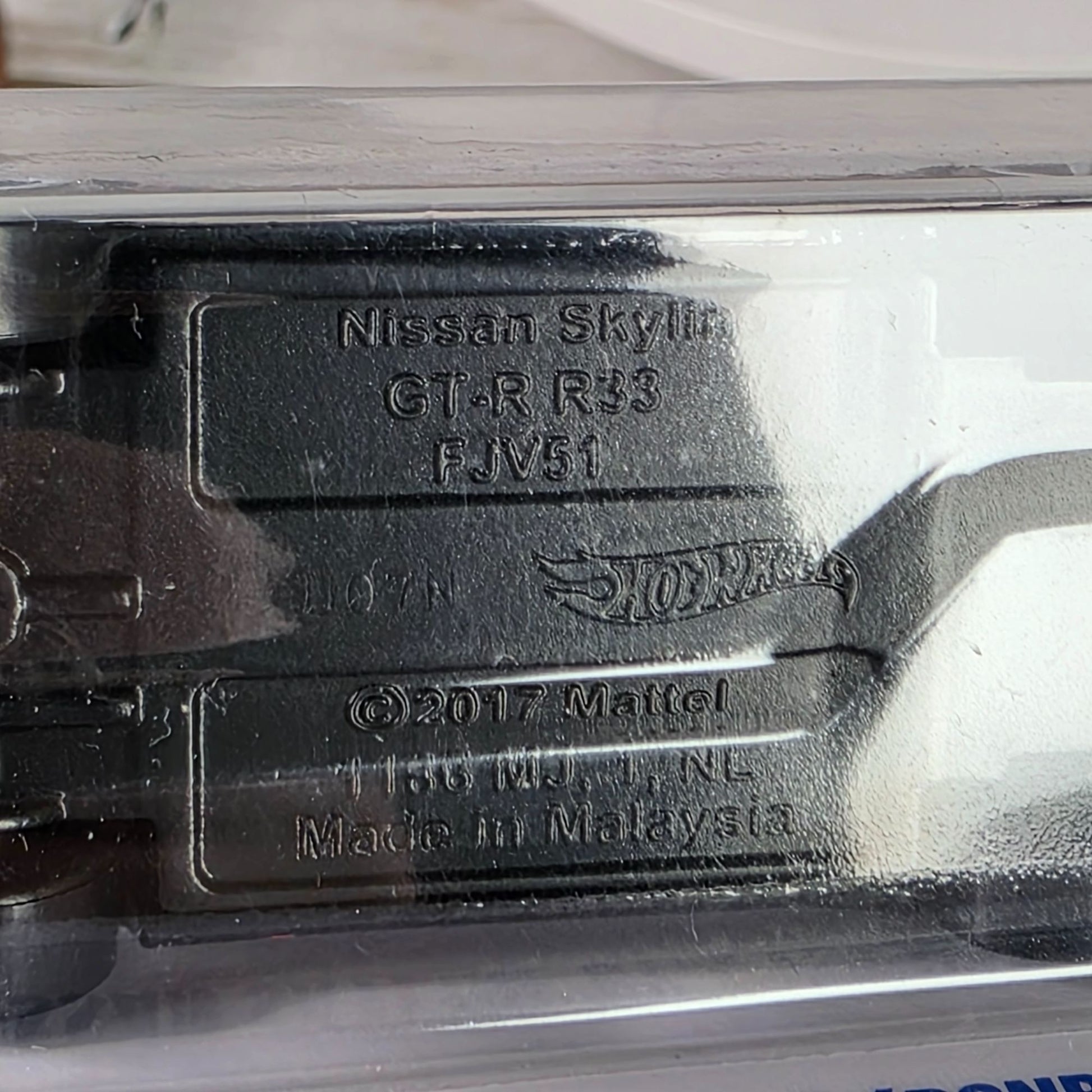 This miniature Nissan Skyline GT-R (BCNR33) by Hot Wheels captures the essence of the iconic car in a compact die-cast form. Adorned with intricate detailing and bold graphics, it exudes a nostalgic 90s vibe. Packaged securely and boasting a lifetime warranty, this collectible is a testament to careful craftsmanship and enduring appeal.
