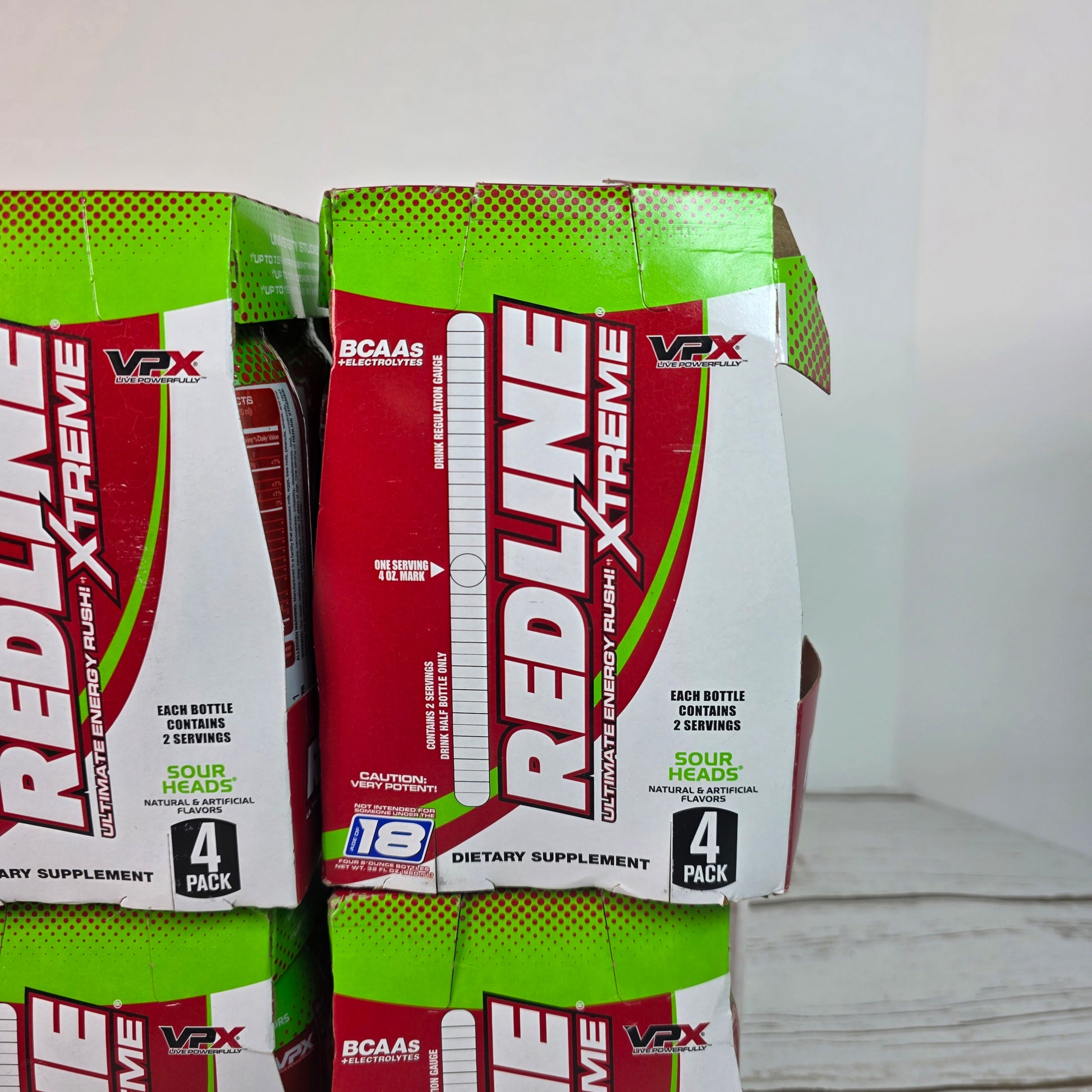Take a risk and experience the ultimate energy rush with our NEW REDLINE Xtreme dietary supplement! With its rare and discontinued Sour Heads flavor, fuel your adventurous spirit and push your limits with 16 bottles (4 packs) of 8oz of pure power. Don't wait, this is your chance to try something bold and daring!Increase your energy and reach new limits with REDLINE Xtreme Ultimate Energy Rush. The Sour Heads flavor will give you a burst of bold, intense flavor while you tackle your daily challenges. Each pack comes with 16 8oz bottles, perfect for those who love to take risks and push themselves to the extreme!