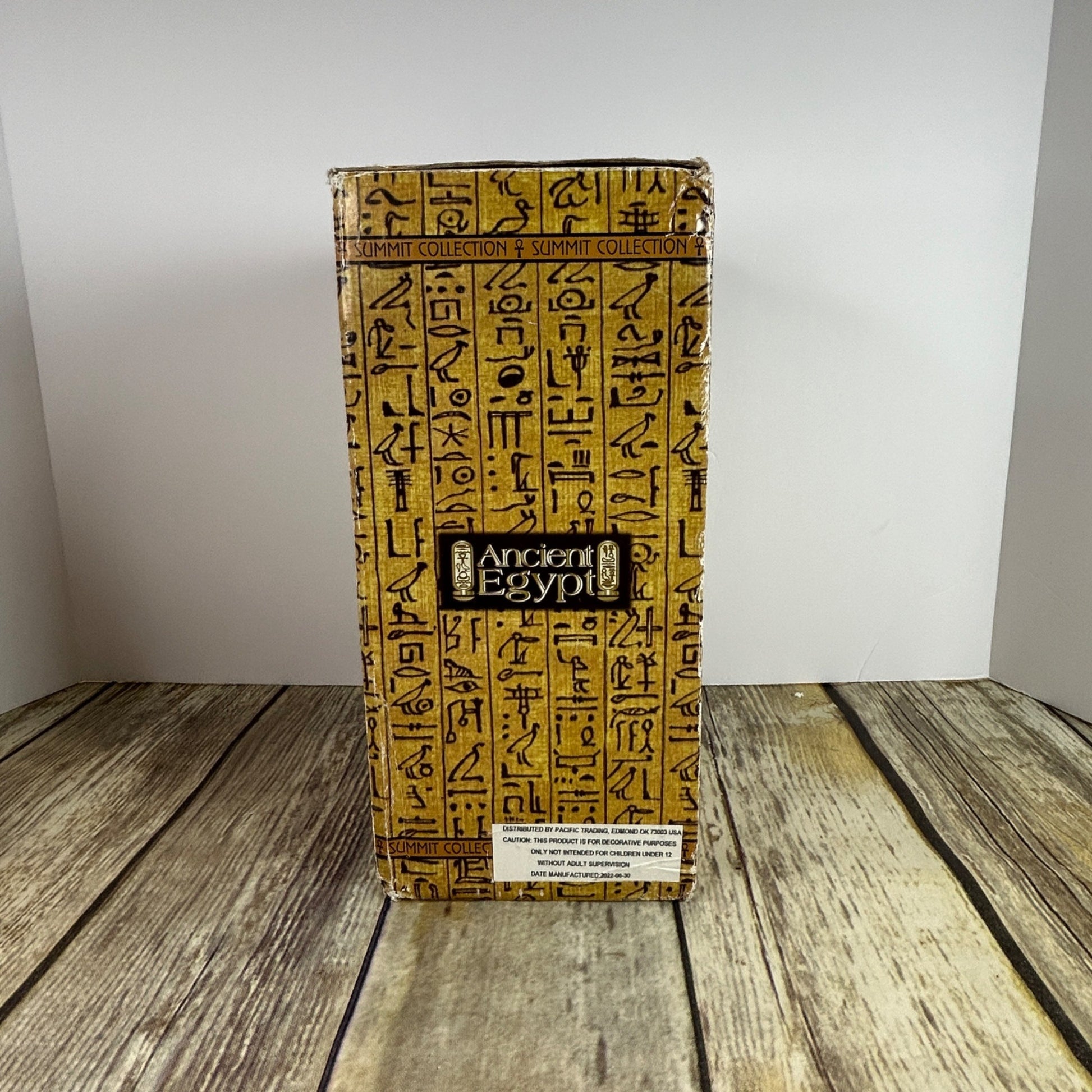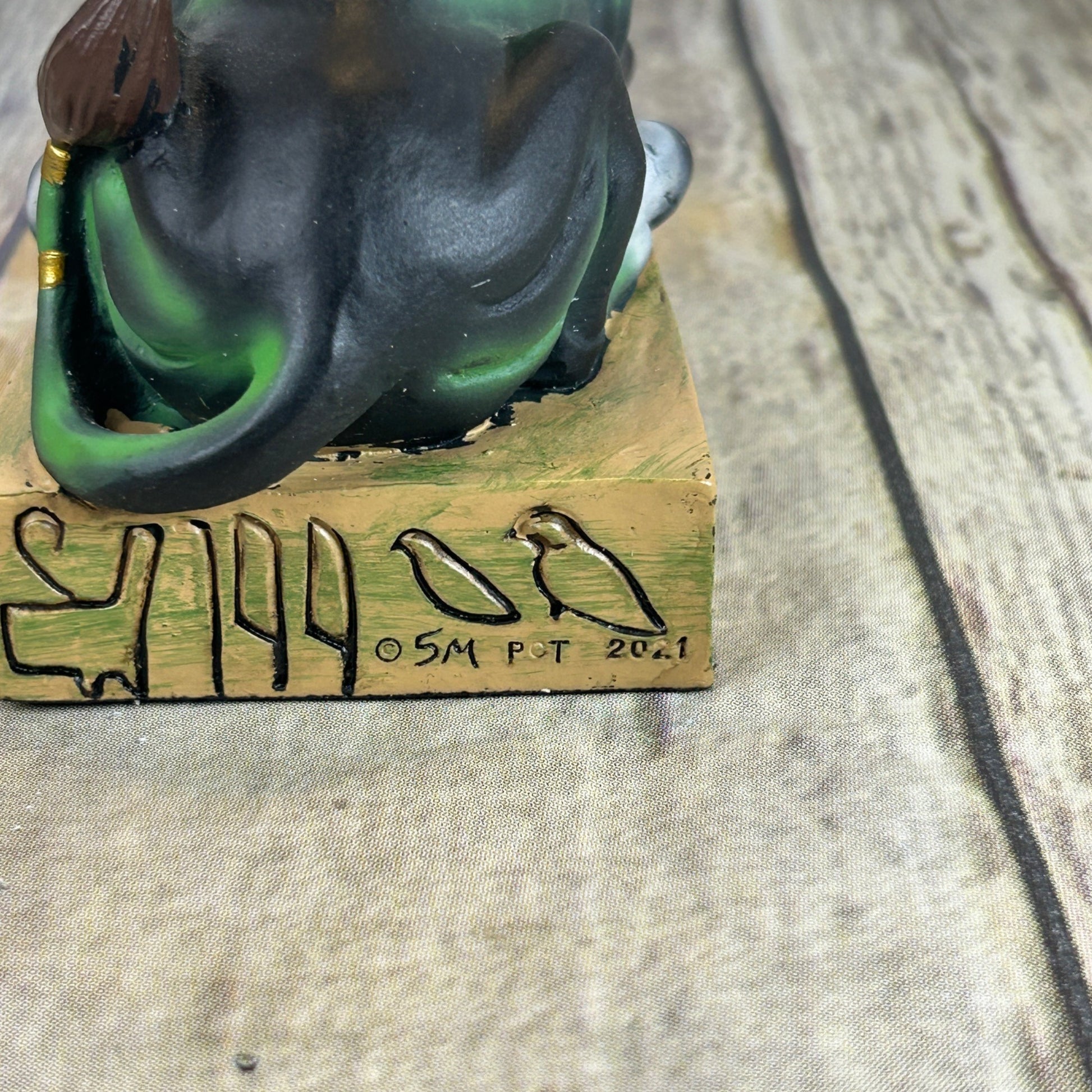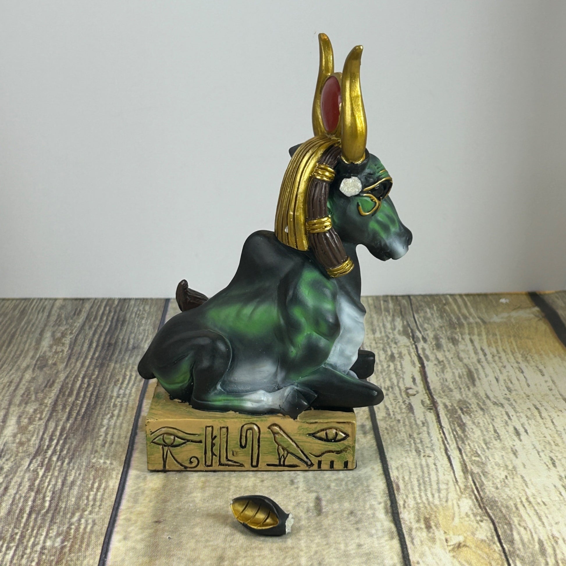 This exquisitely detailed Apis Bull statue, inspired by ancient Egyptian culture, embodies historical elegance. Its vibrant green finish and golden accents evoke the mystique of Pharaohs and sacred rituals. A captivating blend of artistry and symbolism, it makes a distinctive centerpiece or collector's treasure. Includes original packaging for added authenticity.