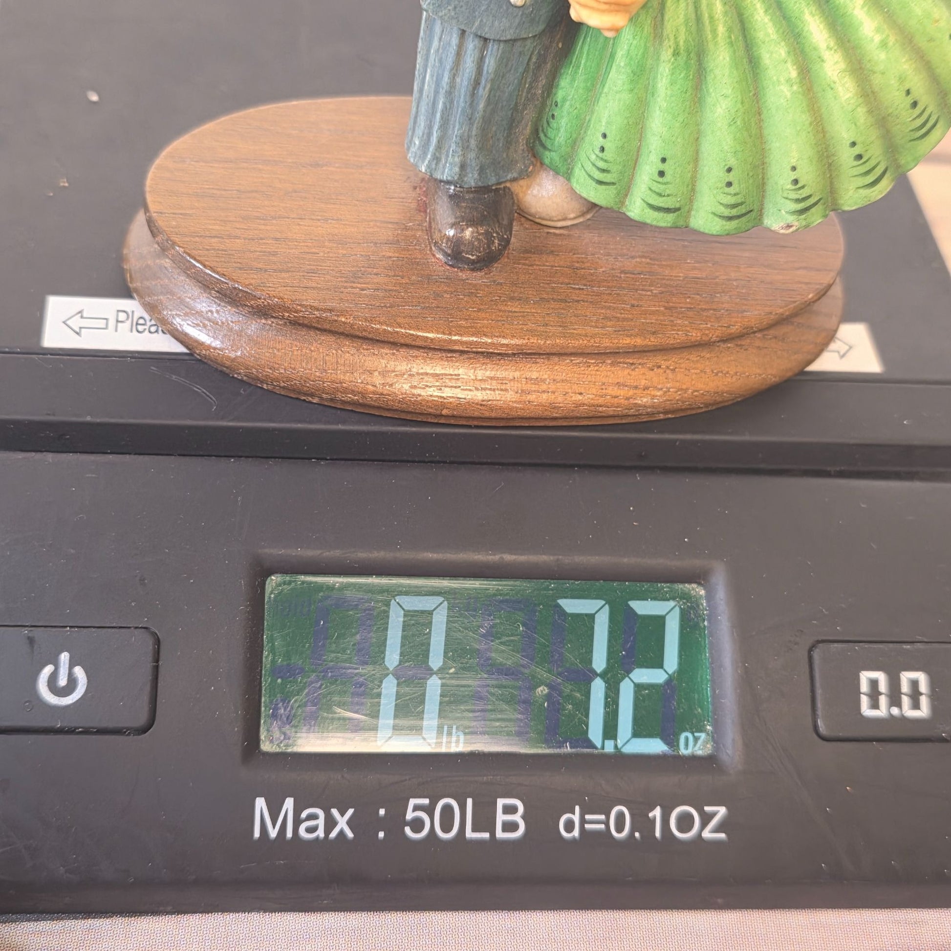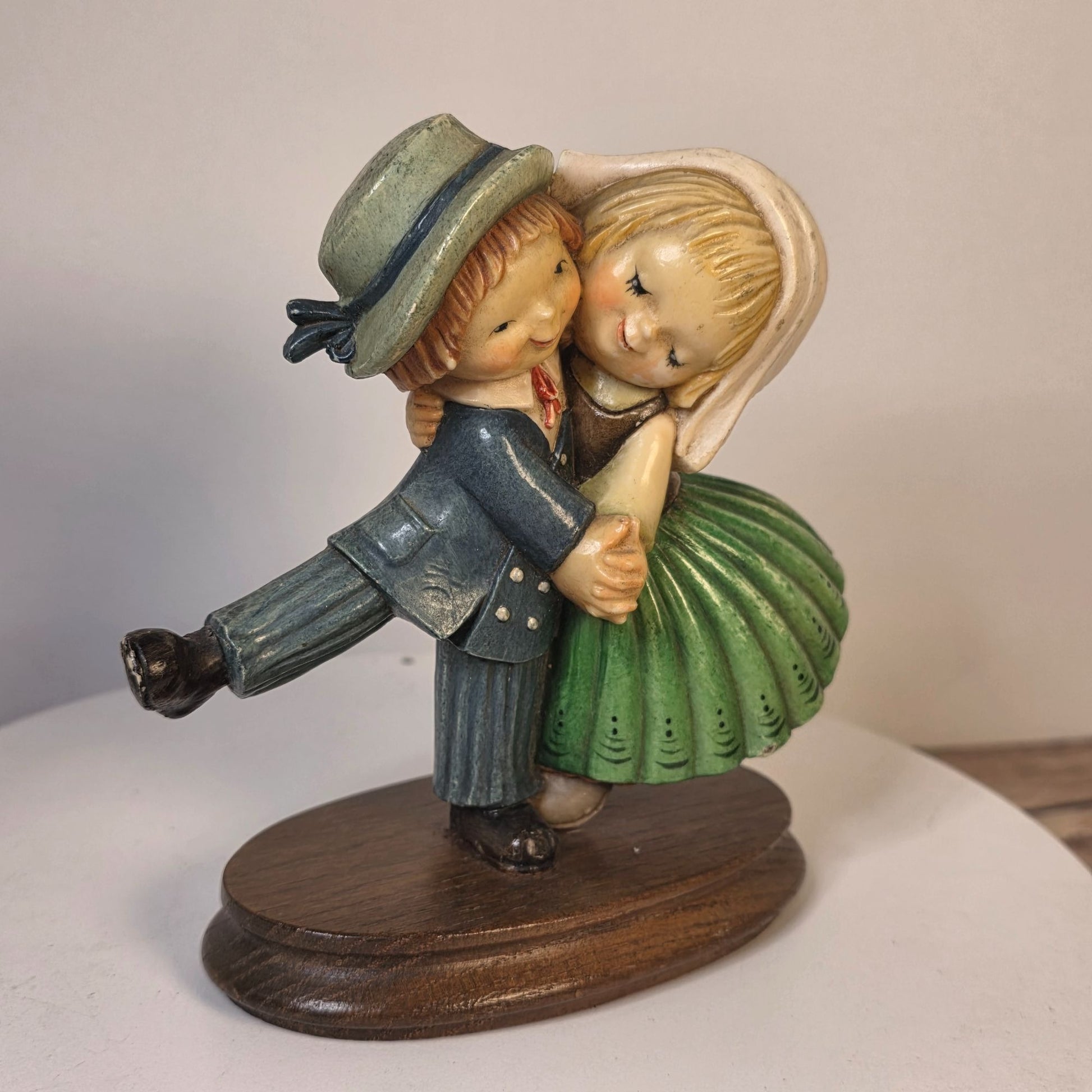 This enchanting figurine captures the essence of love and joy, showcasing a dancing couple in a tender embrace. Carefully crafted from wood, the piece radiates nostalgia and charm. Although it no longer rotates or plays music, it remains a delightful keepsake. The intricate details and vibrant colors add a touch of whimsy, making it a superb addition to any collection or display.