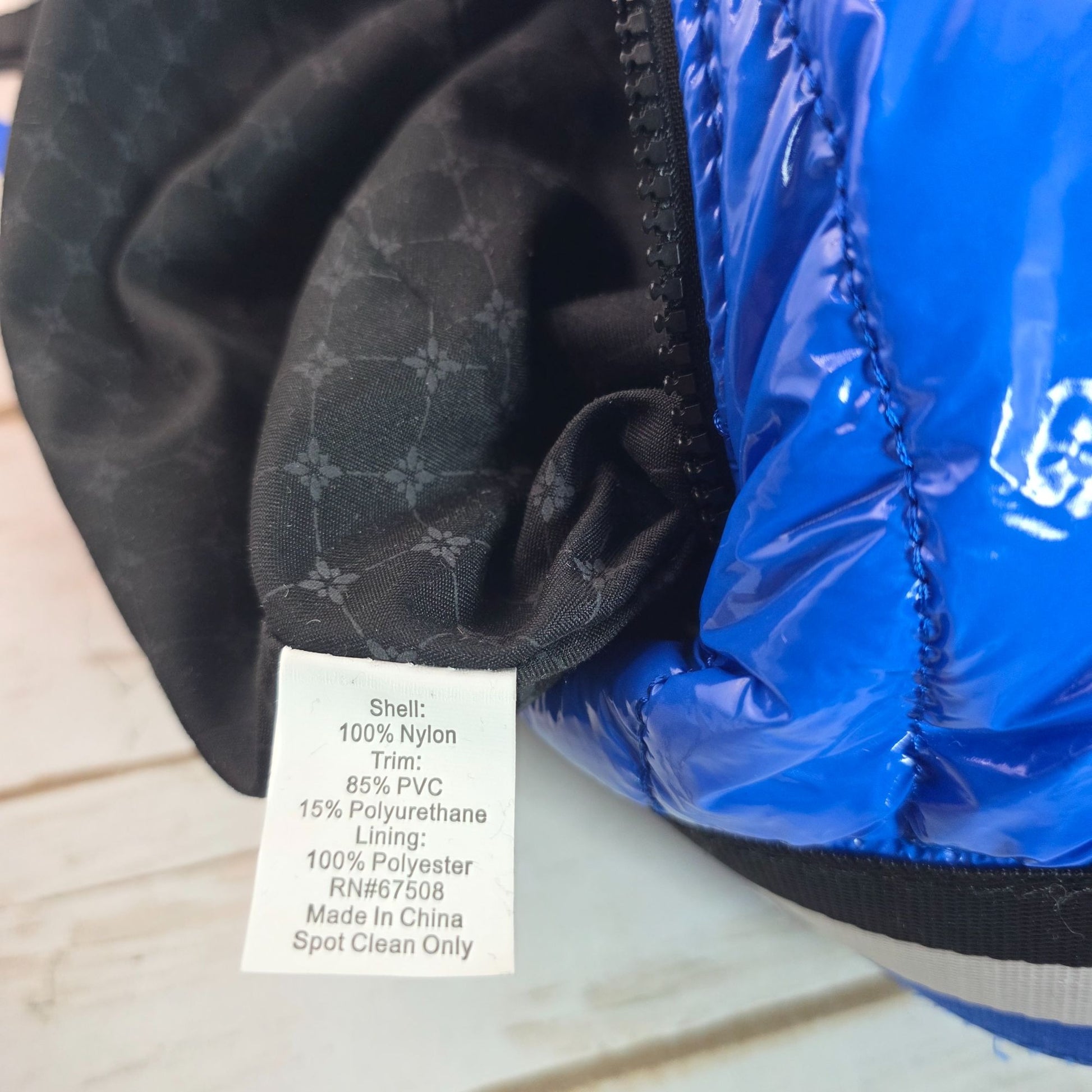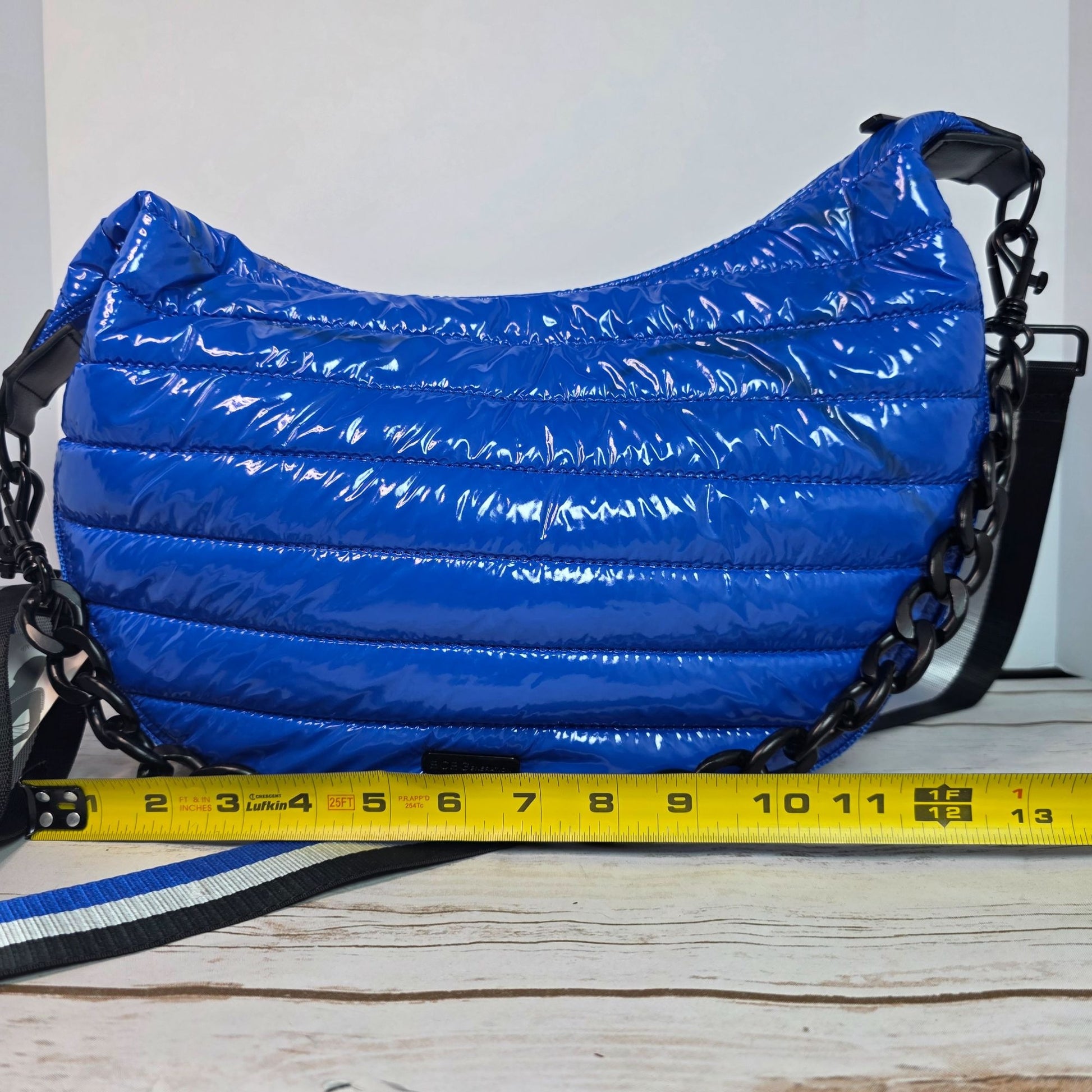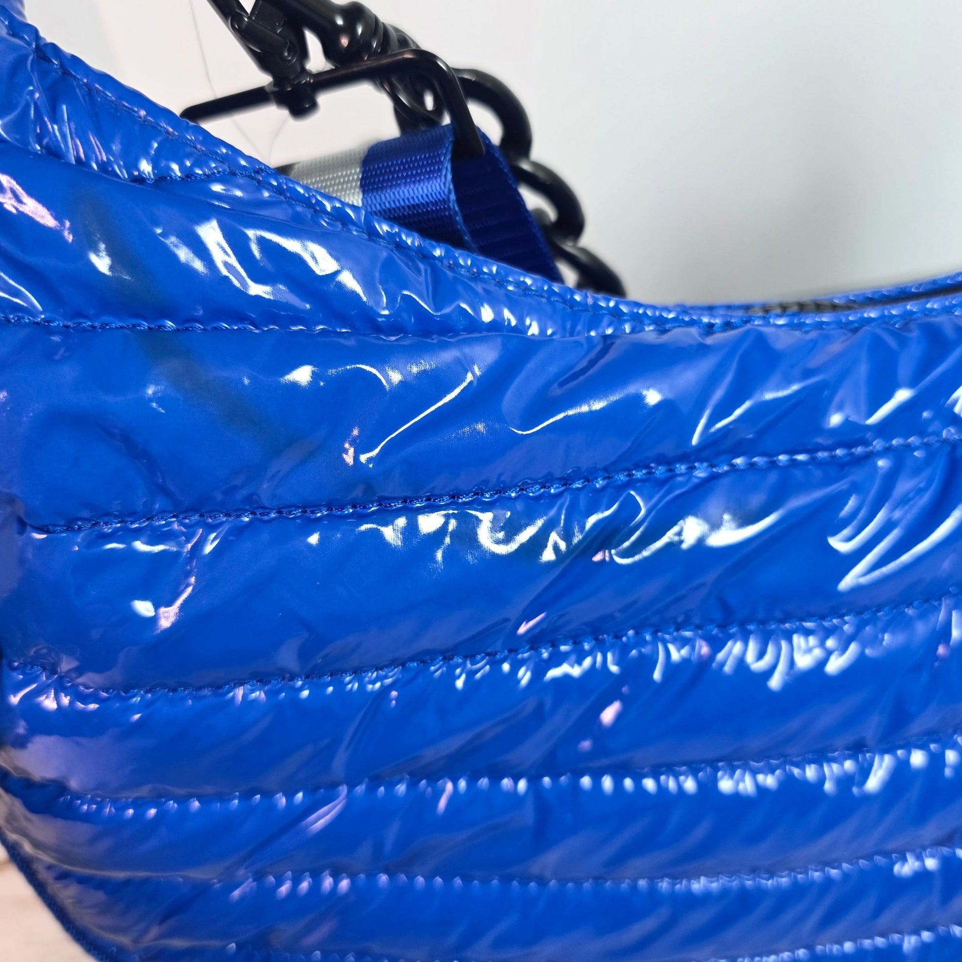 Designed for versatility, this chic blue quilted bag shifts seamlessly between crossbody and shoulder wear. The glossy finish and striped strap add a modern flair. Though minor discoloration near the top exists, it blends into the vibrant design, ensuring a stylish and functional addition to your wardrobe.