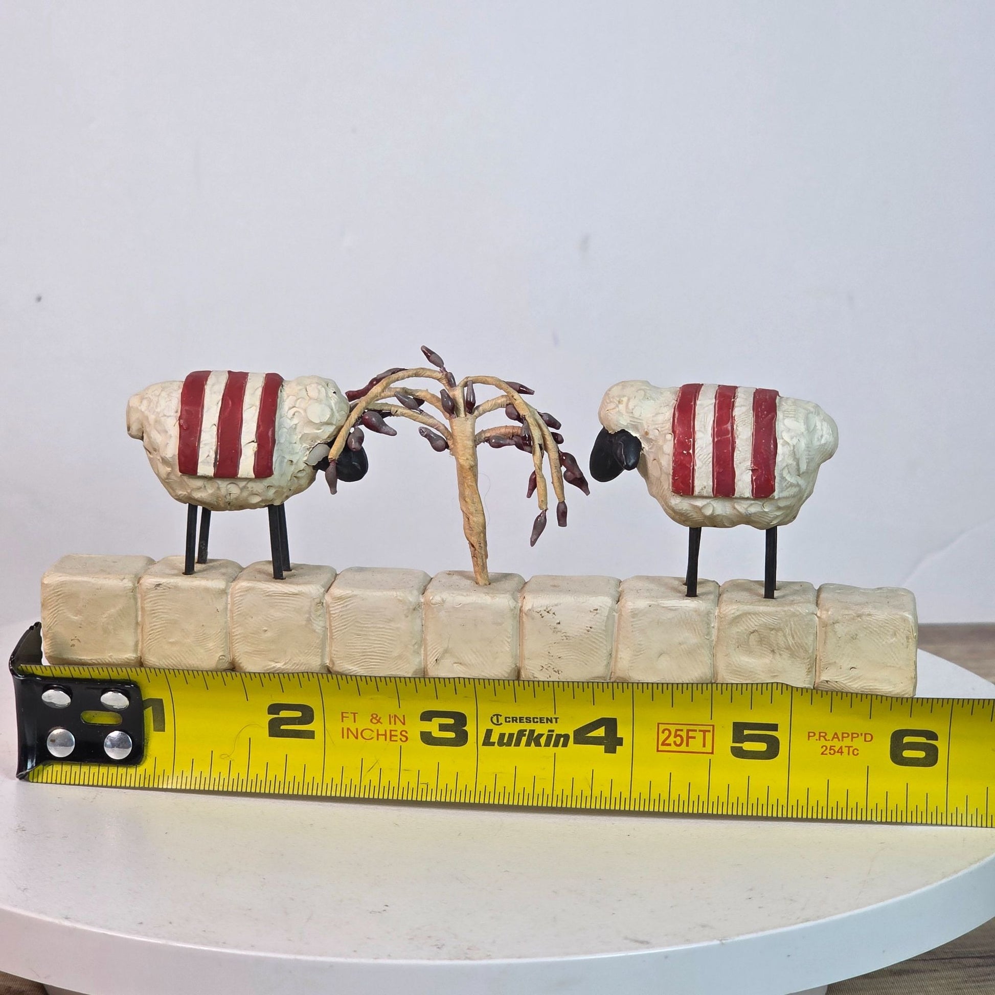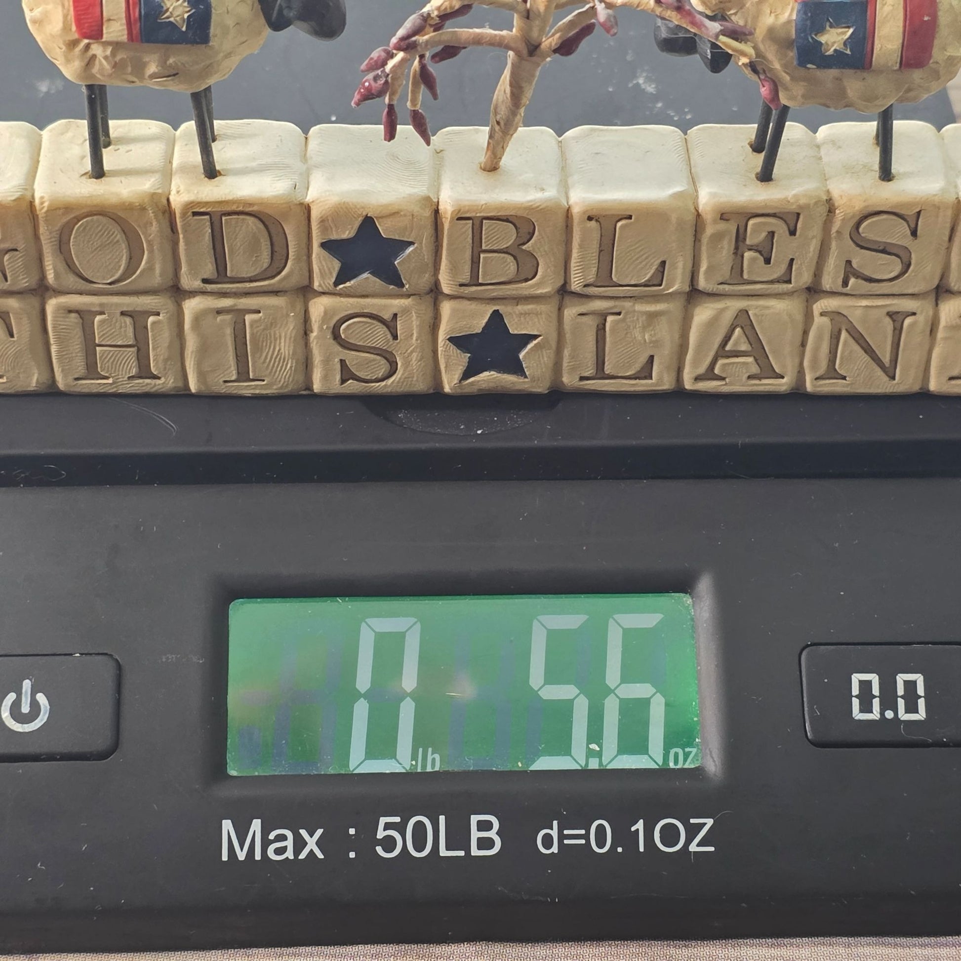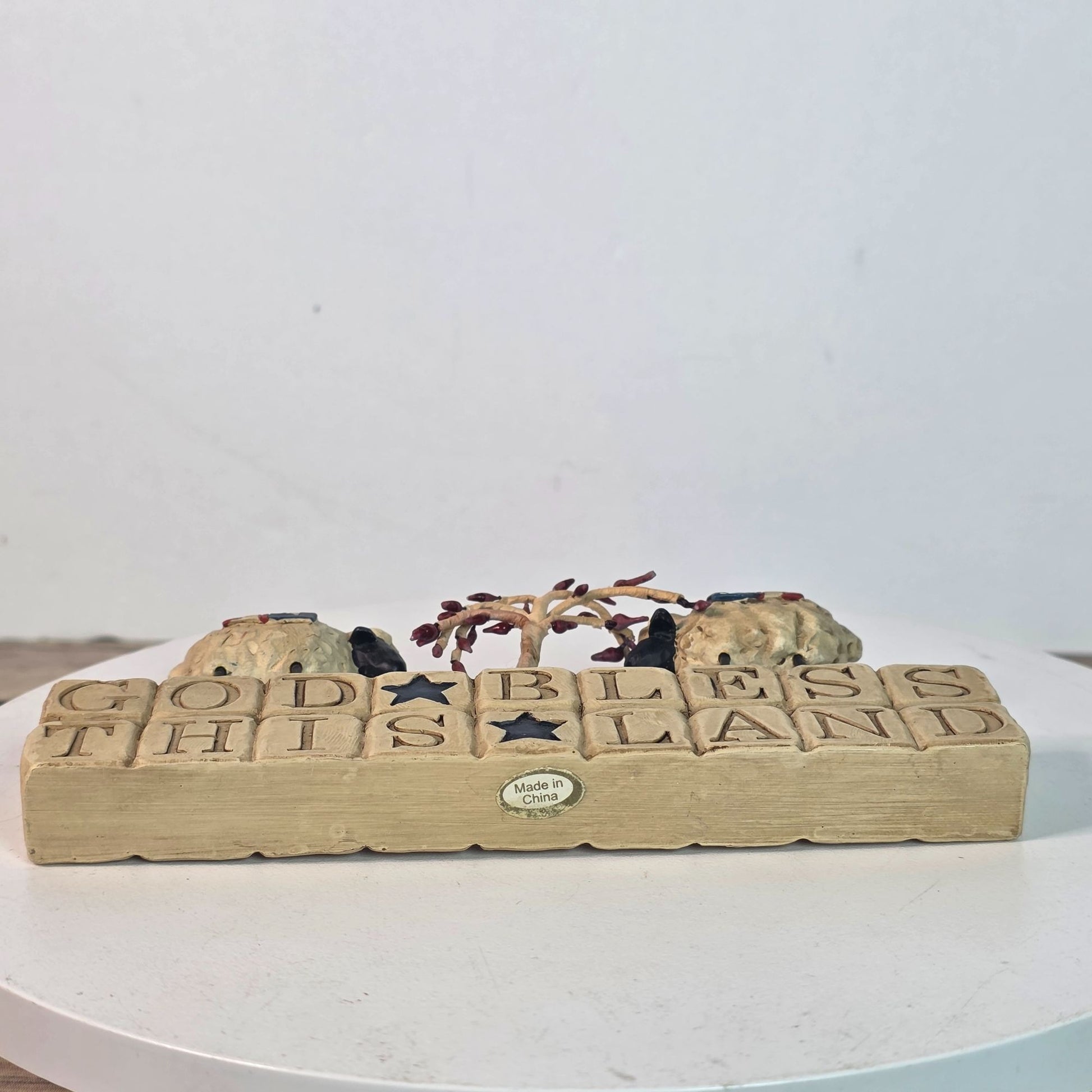 • • Designed by Suzi Skoglund • Two sheep with American flags • Made of durable resin • Rustic block lettering