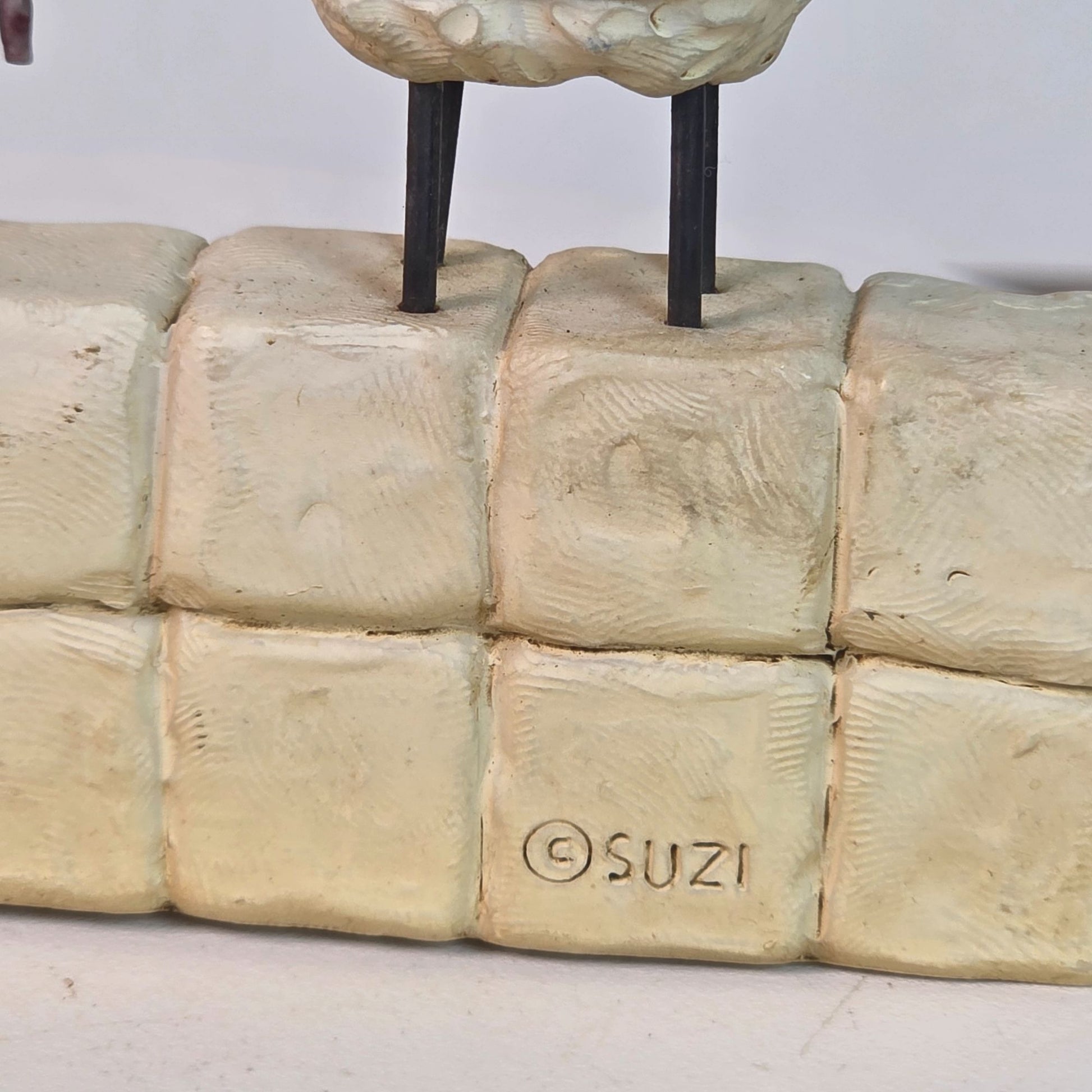 This delightful figurine, designed by Suzi Skoglund, features two charming sheep adorned with American flag motifs, standing proudly atop rustic alphabet blocks spelling out a patriotic message. The intricate detailing of the sheep and the delicate tree between them create a captivating visual that embodies a heartfelt sentiment of national pride. A unique addition to any decor, this piece offers a blend of whimsy and patriotism, making it a cherished keepsake.