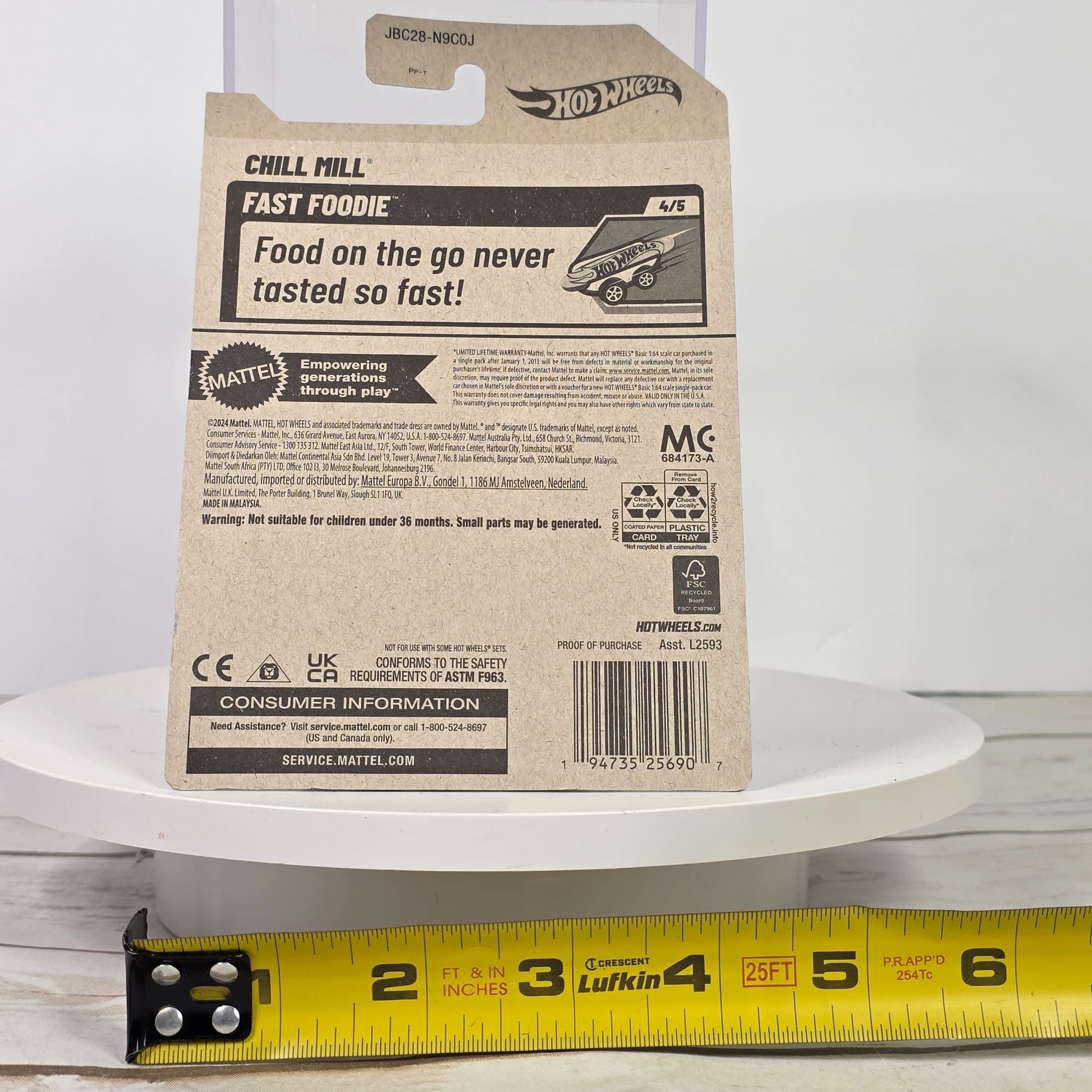 This exclusive Treasure Hunt edition Chill Mill from the Hot Wheels Fast Foodie series (2025) is a unique collectible for enthusiasts. Featuring a vibrant, retro-inspired design with a food truck theme, it showcases exquisite craftsmanship and playful details. A limited 4/5 release, this die-cast car embodies nostalgia and creative artistry, perfect for any collection.