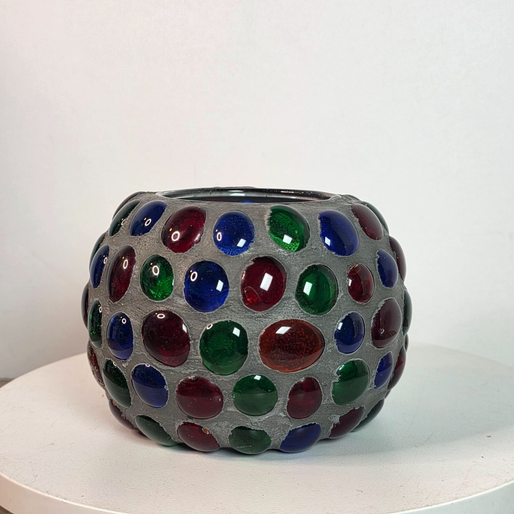 This stunning vase is a delightful piece of artistry, designed to grace any space with its vibrant presence. Its surface is adorned with a mosaic of colorful glass bubbles, each contributing to a harmonious blend of hues. The intricate design captures the imagination, making it a charming focal point in any decor setting. Whether displayed alone or filled with flowers, this vase exudes elegance and charm.