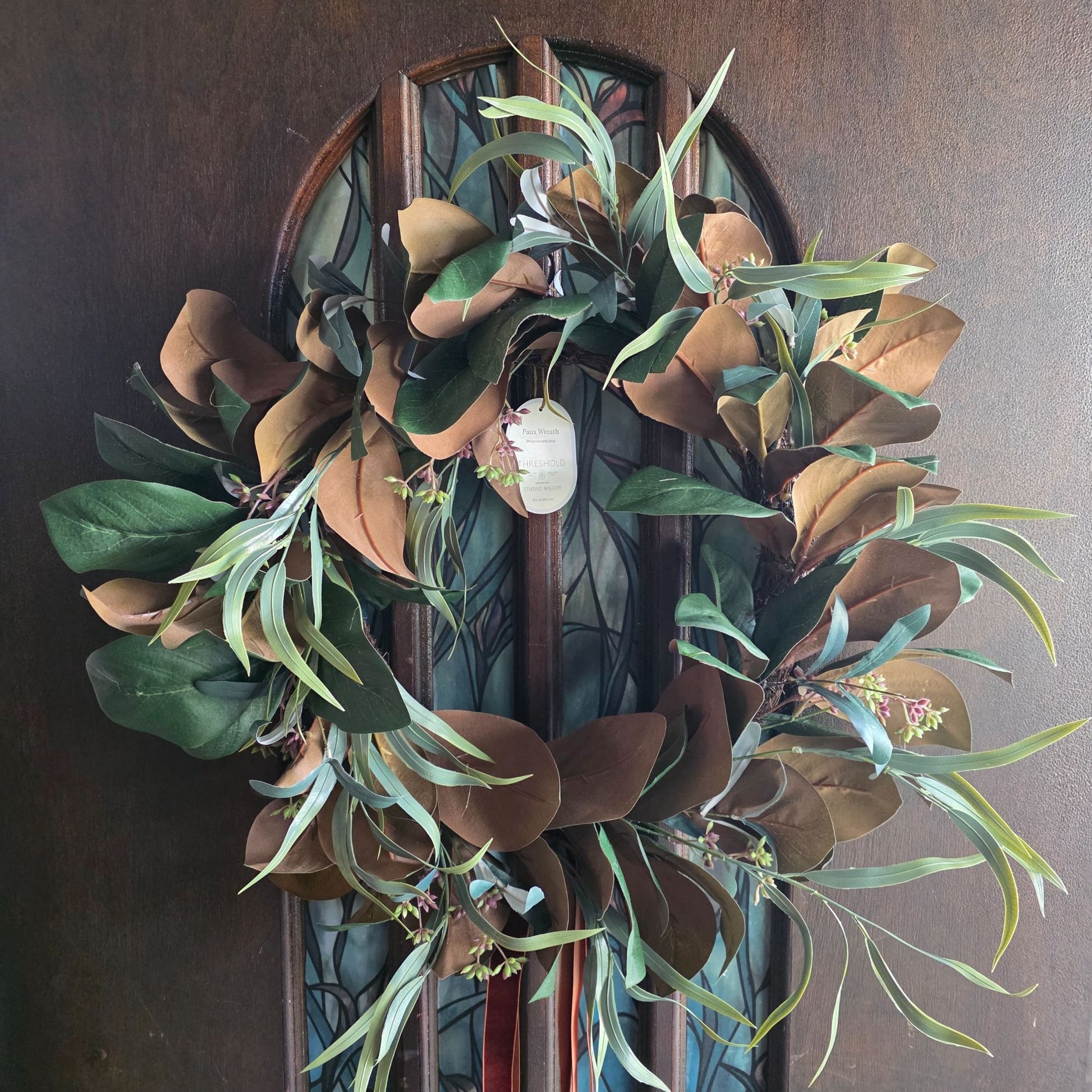 Enhance your space with this beautifully crafted faux wreath featuring magnolia and olive accents. A timeless addition to your home’s décor.