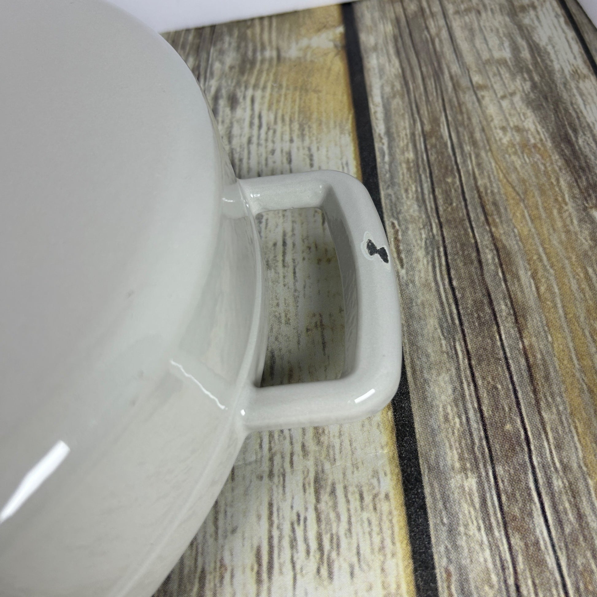 Small chip on handle and slight surface wear visible. Top to bottom = 3.5 inches, diameter = 11.5 inches, handle to handle = 14 inches.