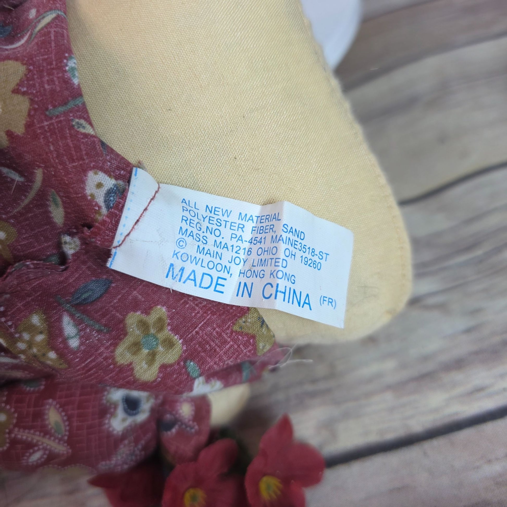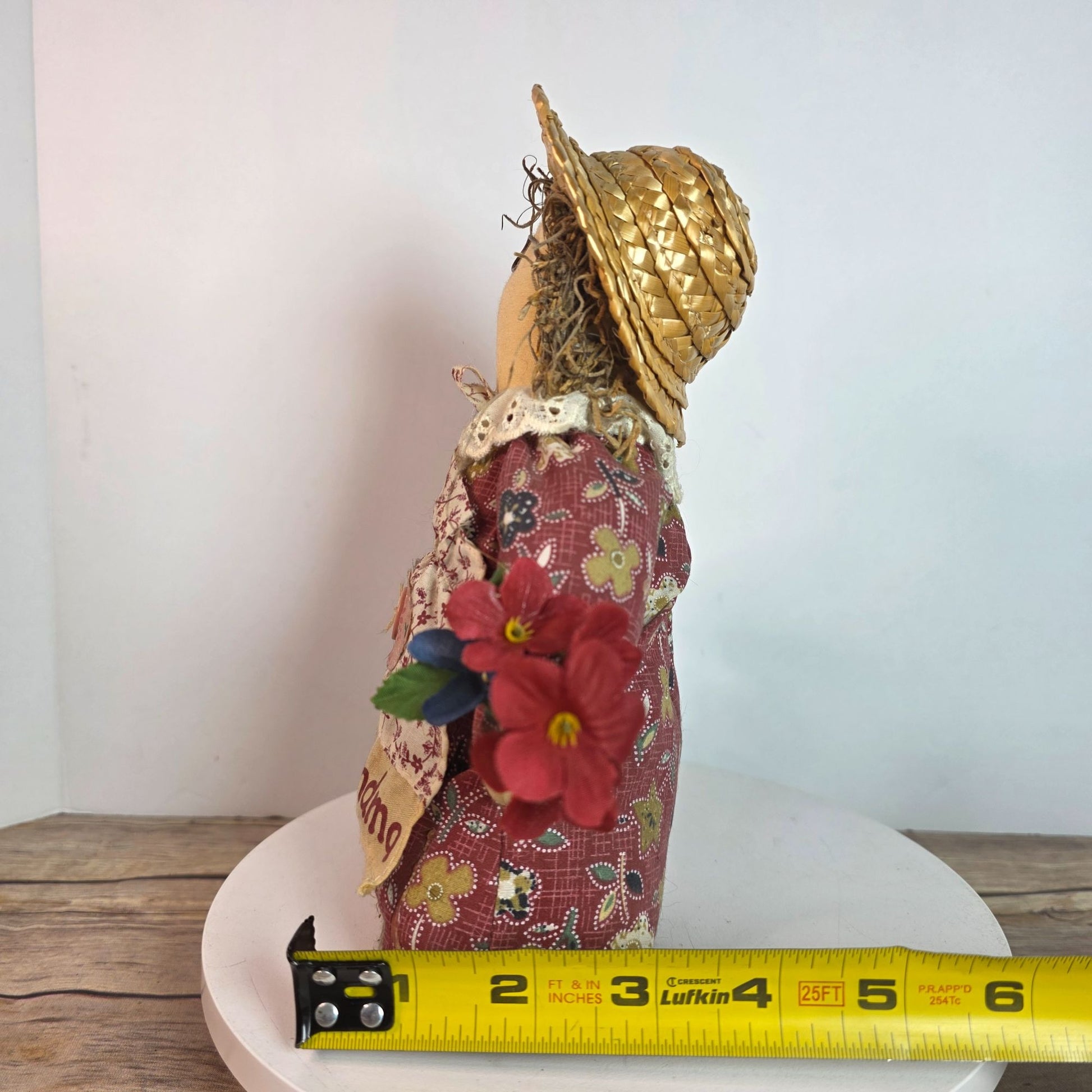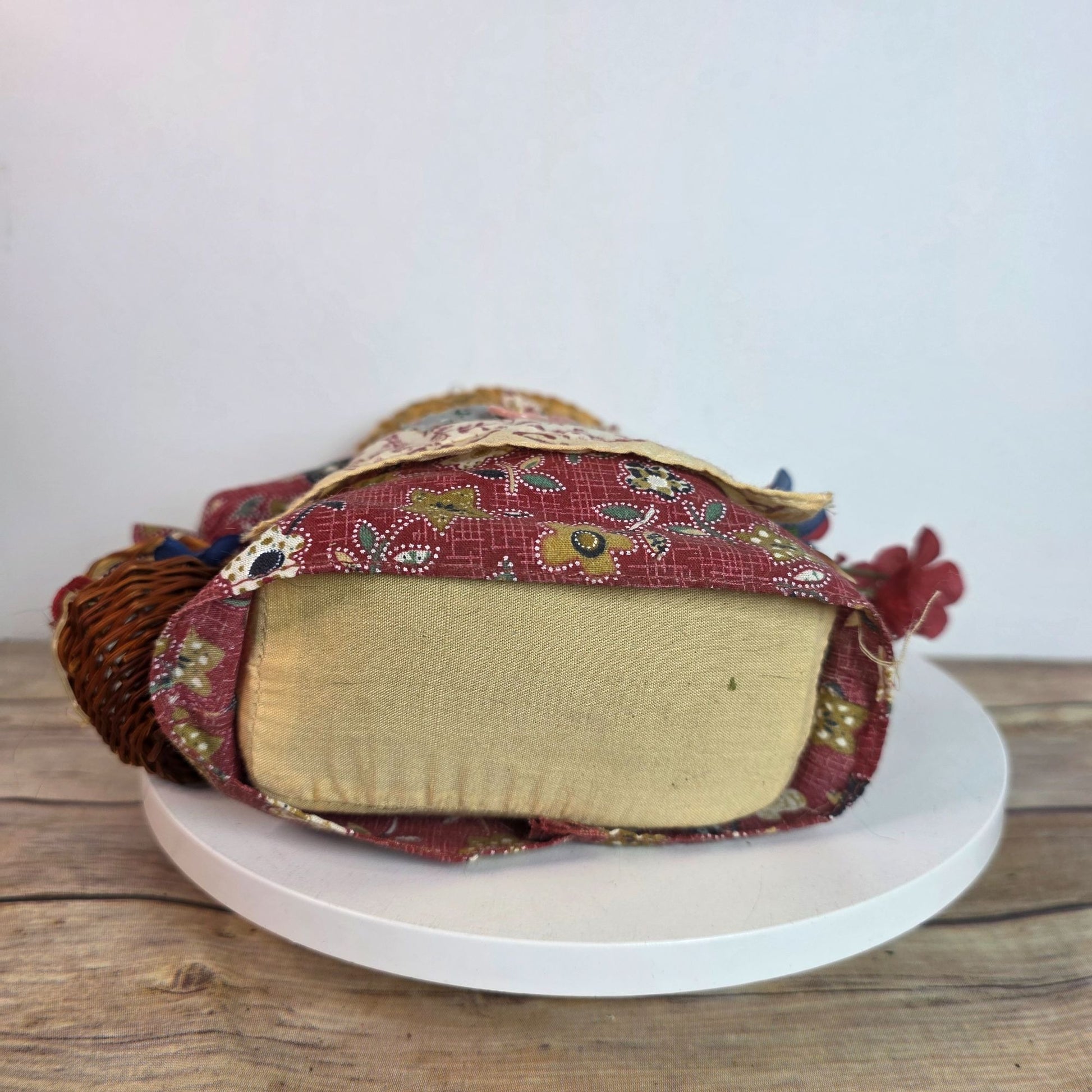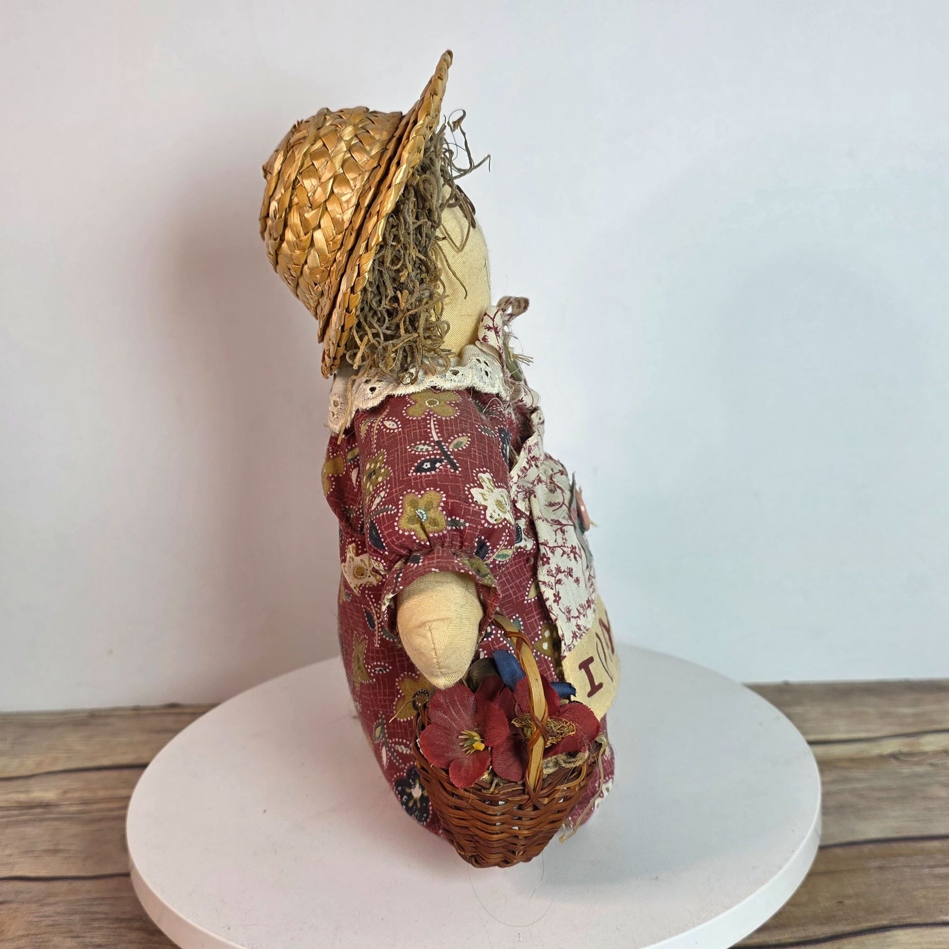 Handcrafted Grandma Rag Doll With Straw Hat & Fabric Dress Holding Basket Of Flowers