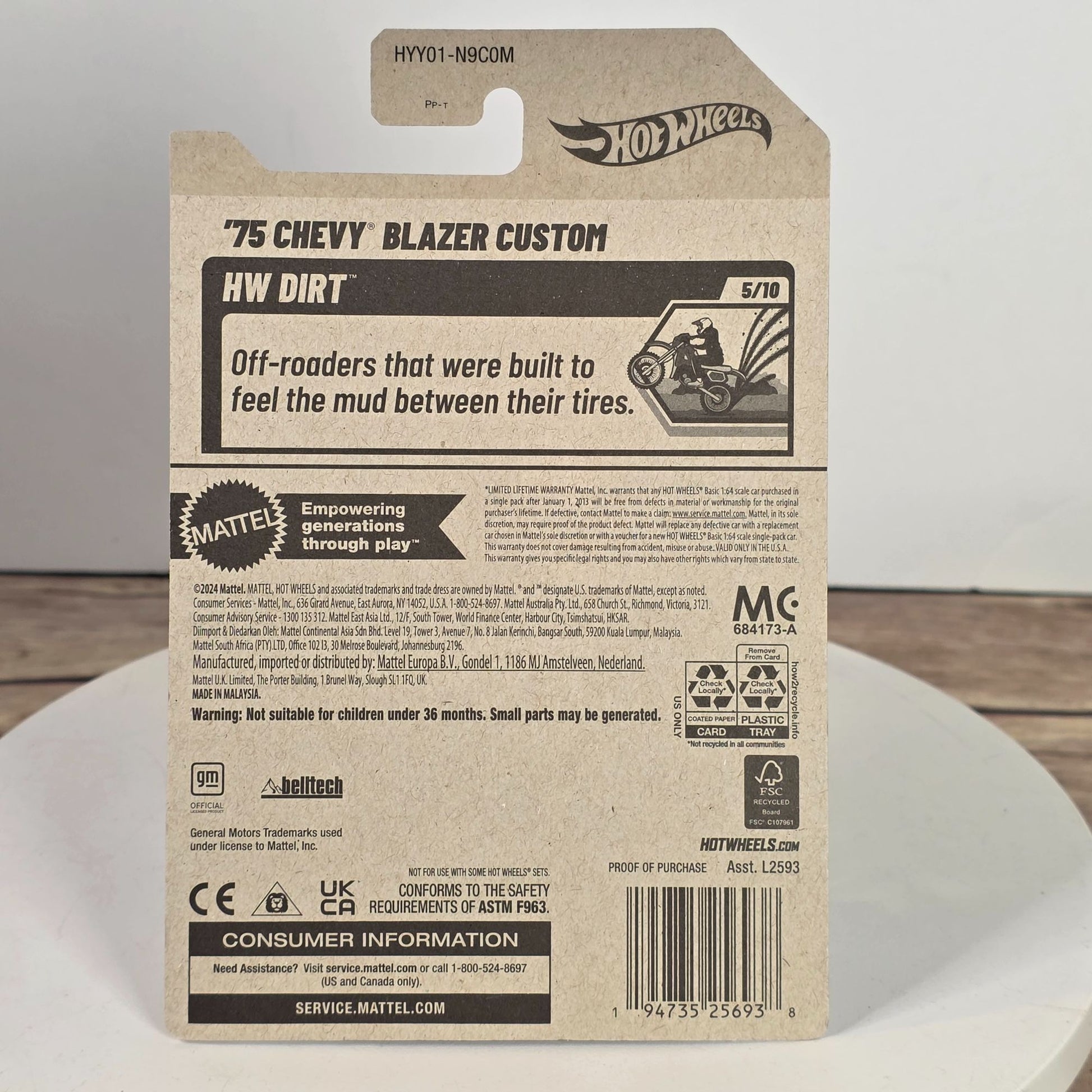 This finely crafted Hot Wheels '75 Chevy Blazer Custom die-cast car is an exemplary piece for collectors and enthusiasts alike. Its vibrant red and white design captures the rugged spirit of off-road adventure, while the detailed construction pays homage to the classic vehicle's iconic form. This model is part of the HW Dirt series, promising a thrilling addition to any collection. Experience the nostalgia and excitement of a timeless automotive classic in miniature form.