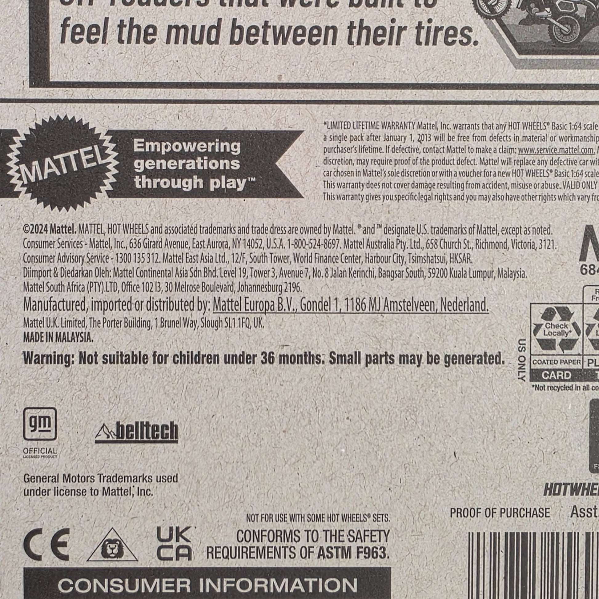 • • Die-cast construction for durability• Detailed Chevrolet Blazer design• Part of the HW Dirt series• Suitable for ages 3+• Includes authentic Hot Wheels packaging