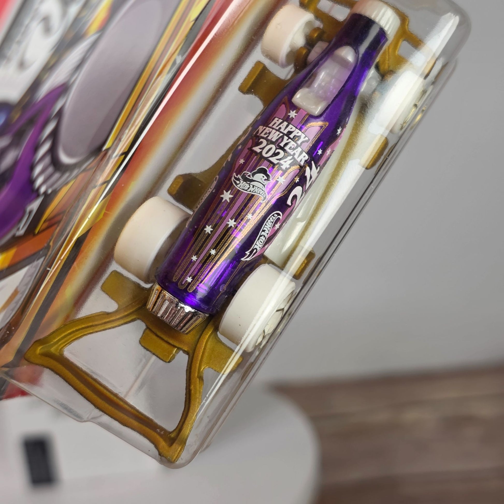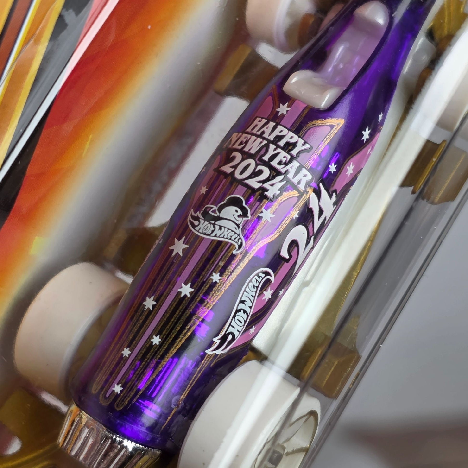 This delightful Hot Wheels creation, the "Carbonator," celebrates the dawn of 2024 with a vibrant design. The miniature car, exquisitely crafted in a 1:64 scale, features an imaginative champagne bottle theme, perfect for collectors and enthusiasts. Encased within its original packaging, the car is adorned with rich purple hues and shimmering accents, promising a splendid addition to any collection.