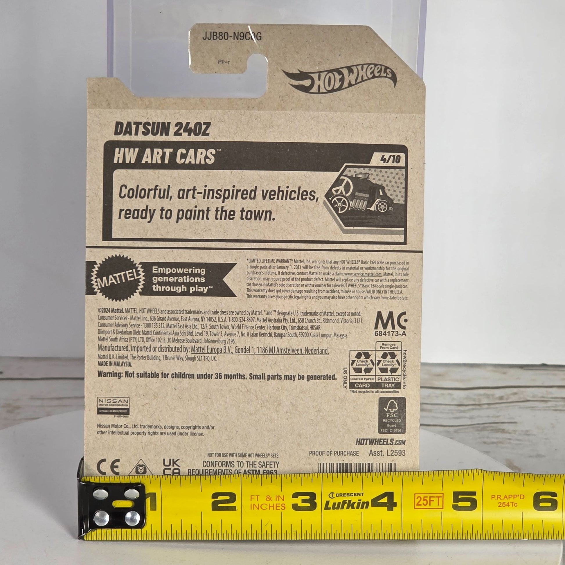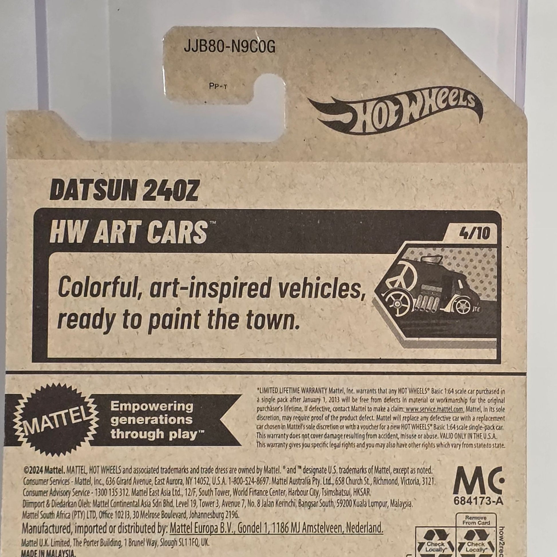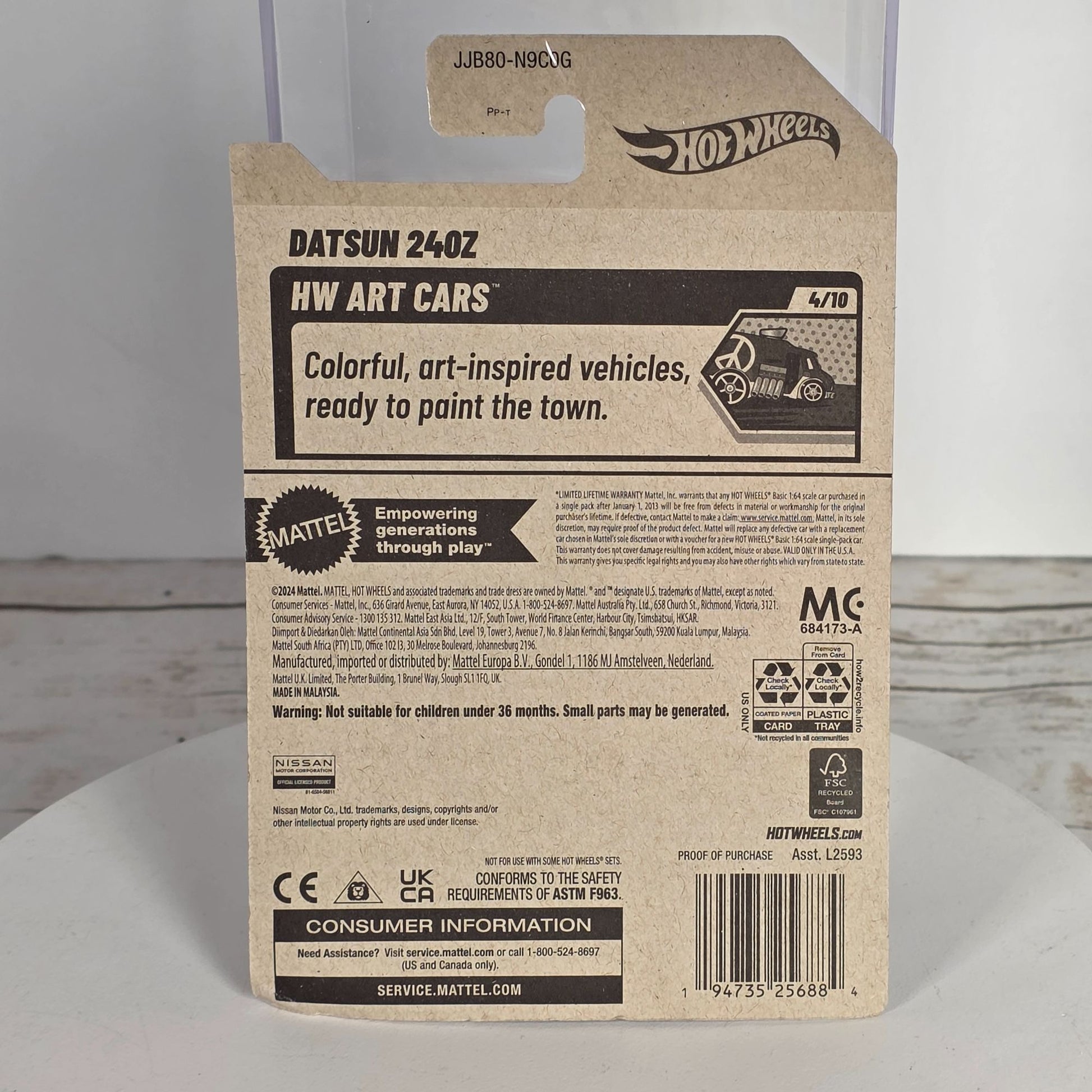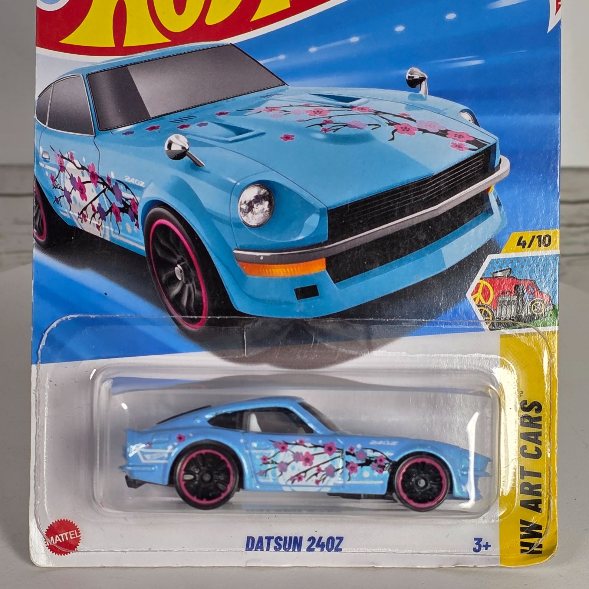 The Hot Wheels Datsun 240Z is an exquisite representation of automotive art, capturing the imagination with its detailed New Art Cars design. Part of a limited edition series, this die-cast model features a vibrant blue finish adorned with cherry blossom accents, reflecting a harmonious blend of style and craftsmanship. Ideal for collectors seeking a unique addition to their prized assortments.
