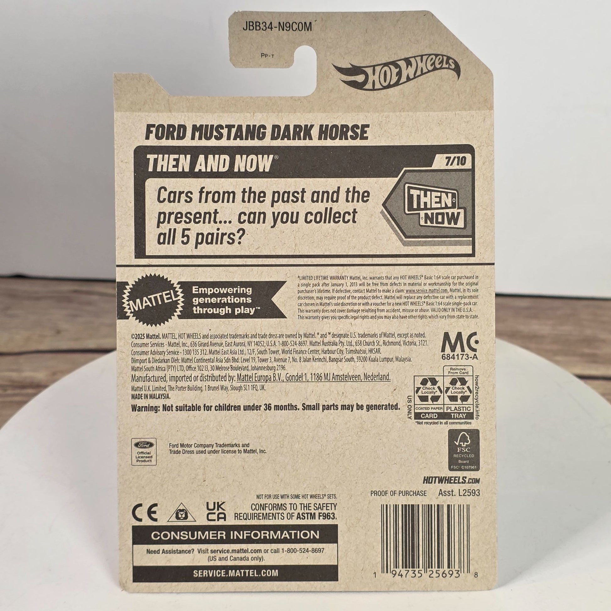 This Hot Wheels Ford Mustang Dark Horse die-cast car, a captivating addition to any collection, is a testament to the enduring allure of miniature automobiles. Crafted with precision in 1:64 scale, it showcases the iconic design and intricate details of its full-sized counterpart. The car is part of the "Then and Now" series, representing a bridge between automotive history and contemporary design. Its compact size makes it a versatile piece, suitable for display or imaginative racing scenarios, capturing the hearts of enthusiasts both young and old.