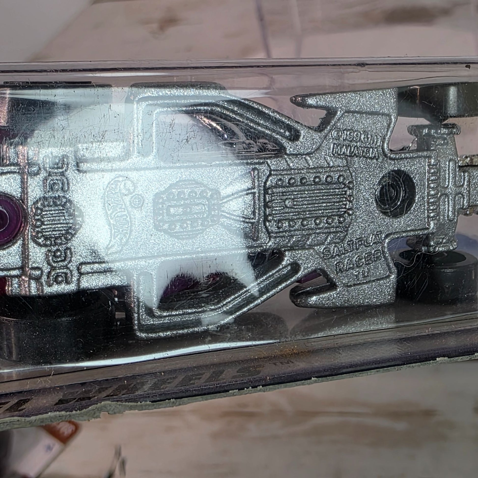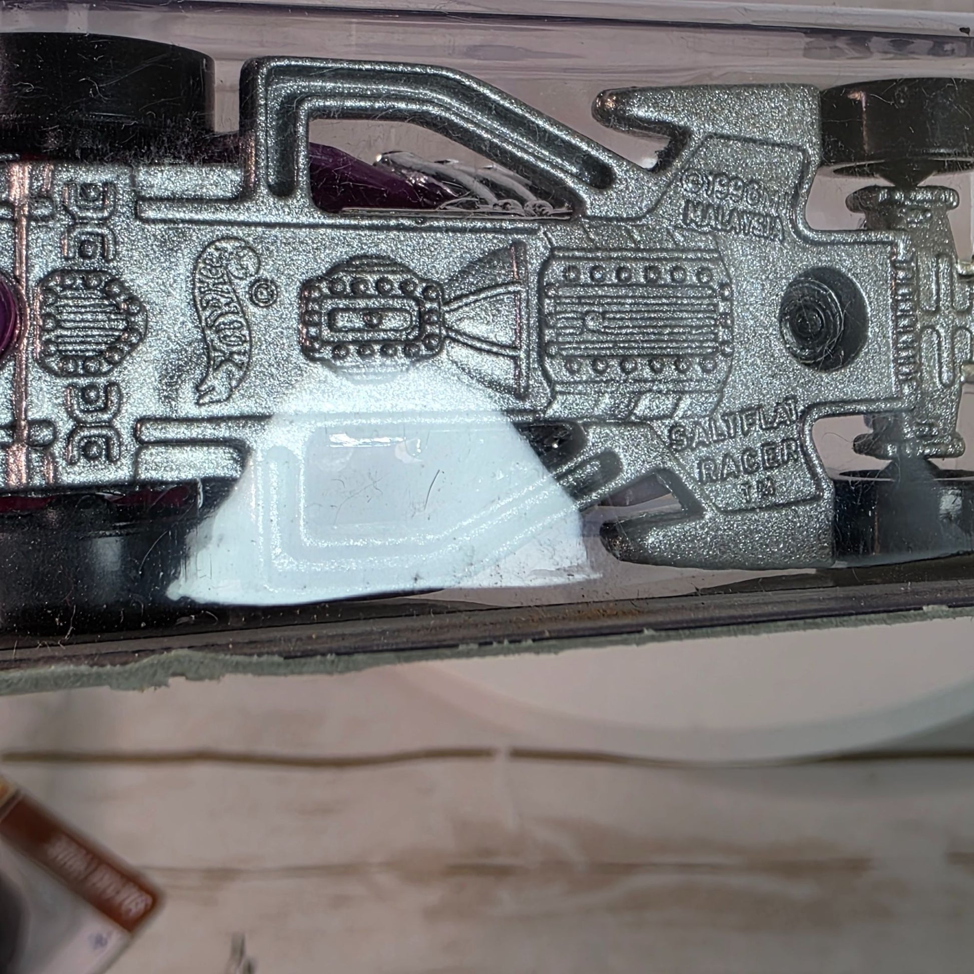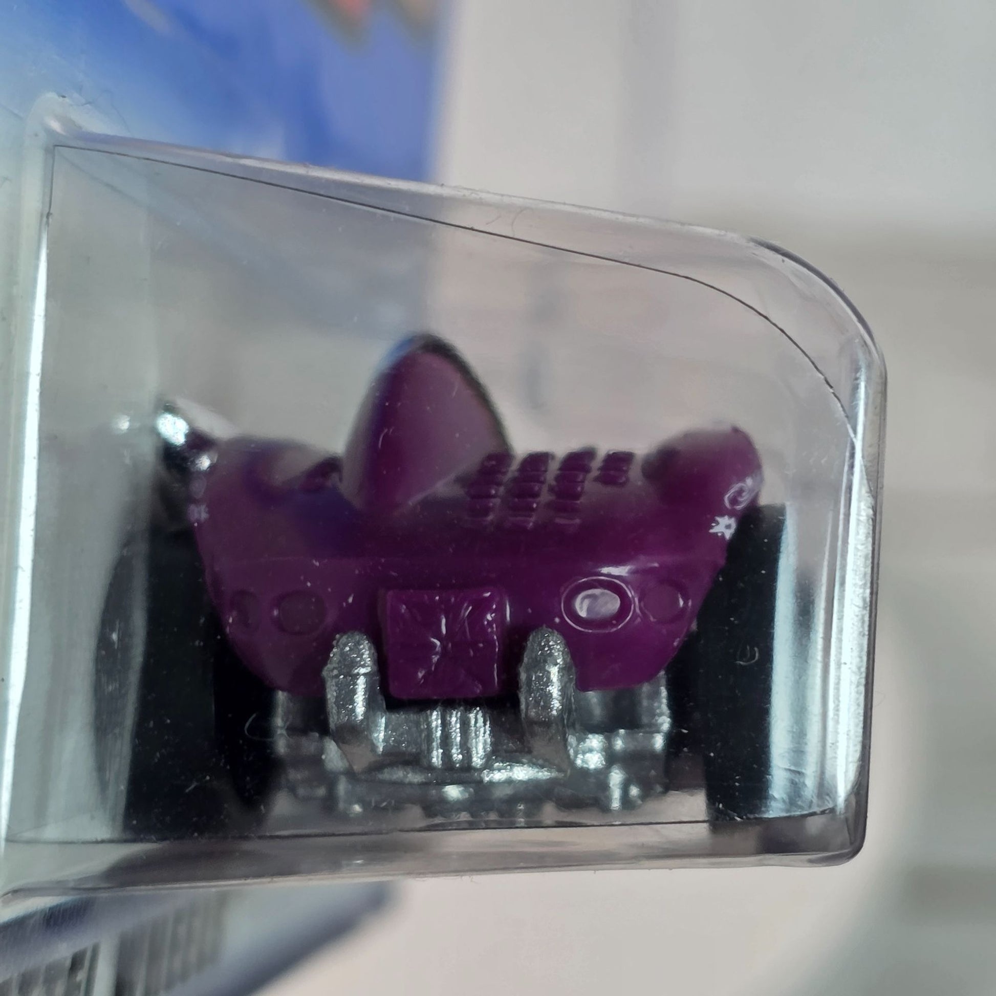 This eye-catching Hot Wheels Saltflat Racer from the Car-Toon Friends Series embodies the nostalgia of classic die-cast collectibles. With its striking purple and silver design, it serves as both a toy and a collector's item. Adorned with a charming character illustration, it is a delightful addition to any collection, capturing the spirit of imaginative play and the thrill of racing.