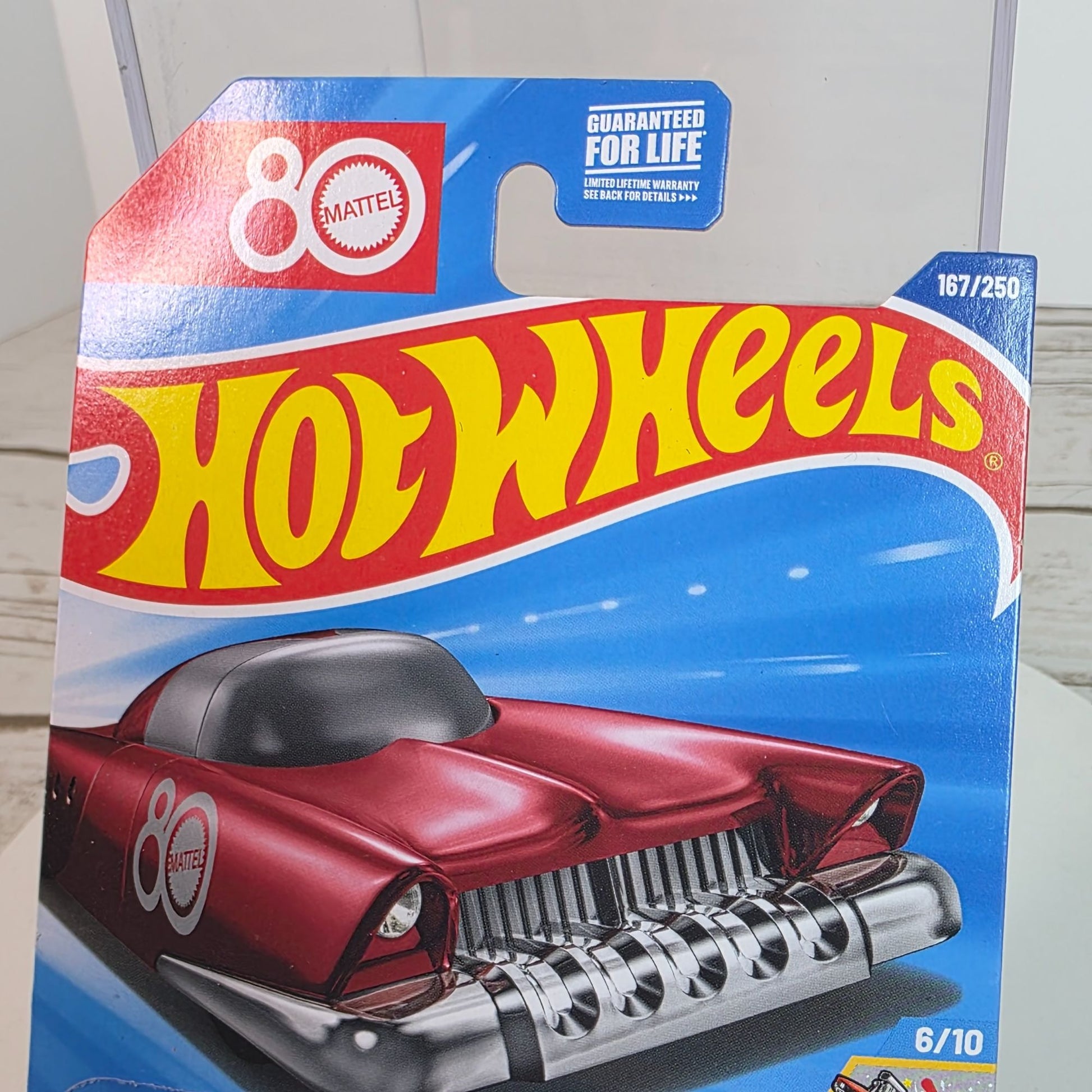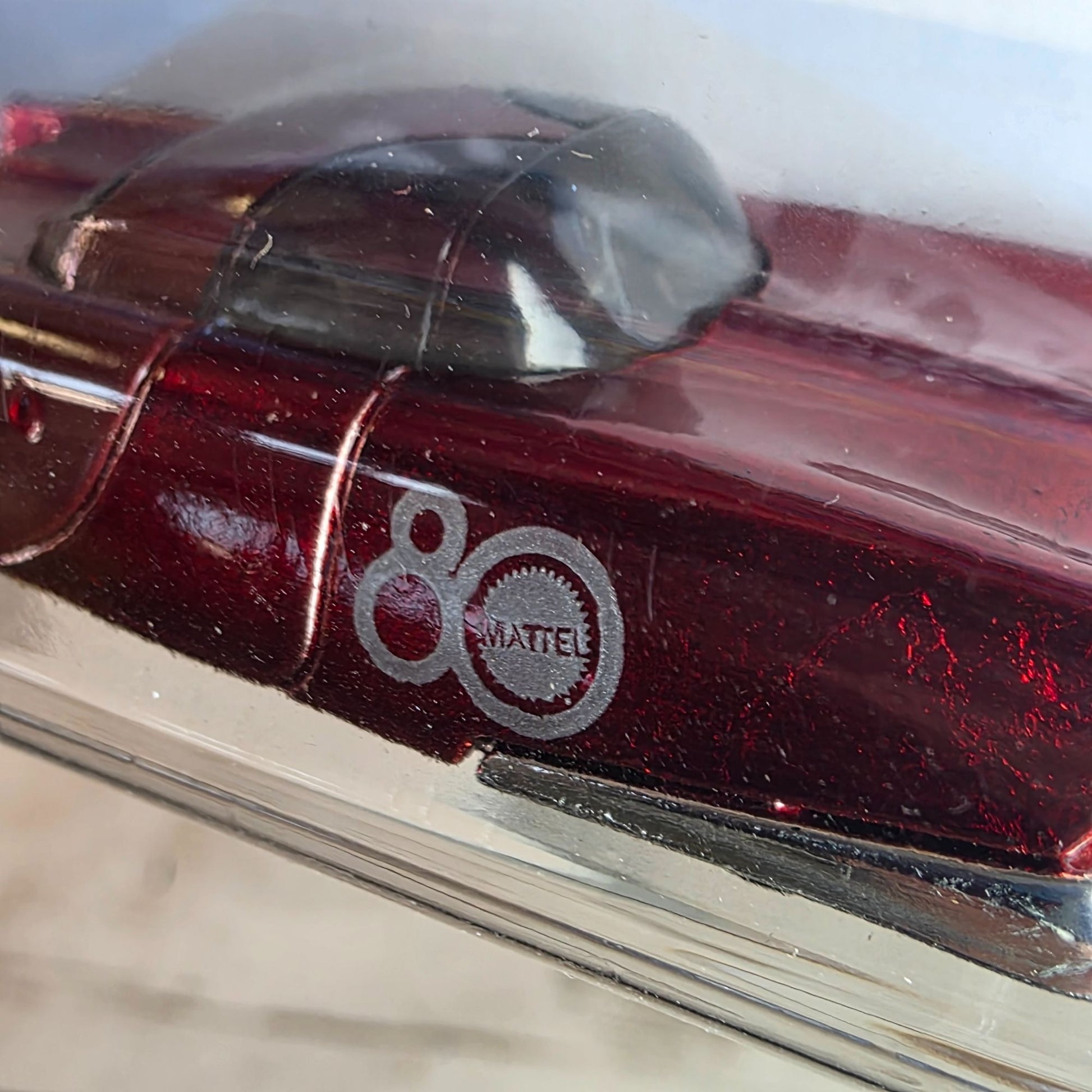 This Mattel Dream Mobile is a celebration of 80 years of Mattel's innovative designs. Its metallic red die-cast structure captures nostalgia and precision, while the custom detailing emphasizes its collectible value. The car is part of the special 167/250 series, making it a unique addition to any collection.