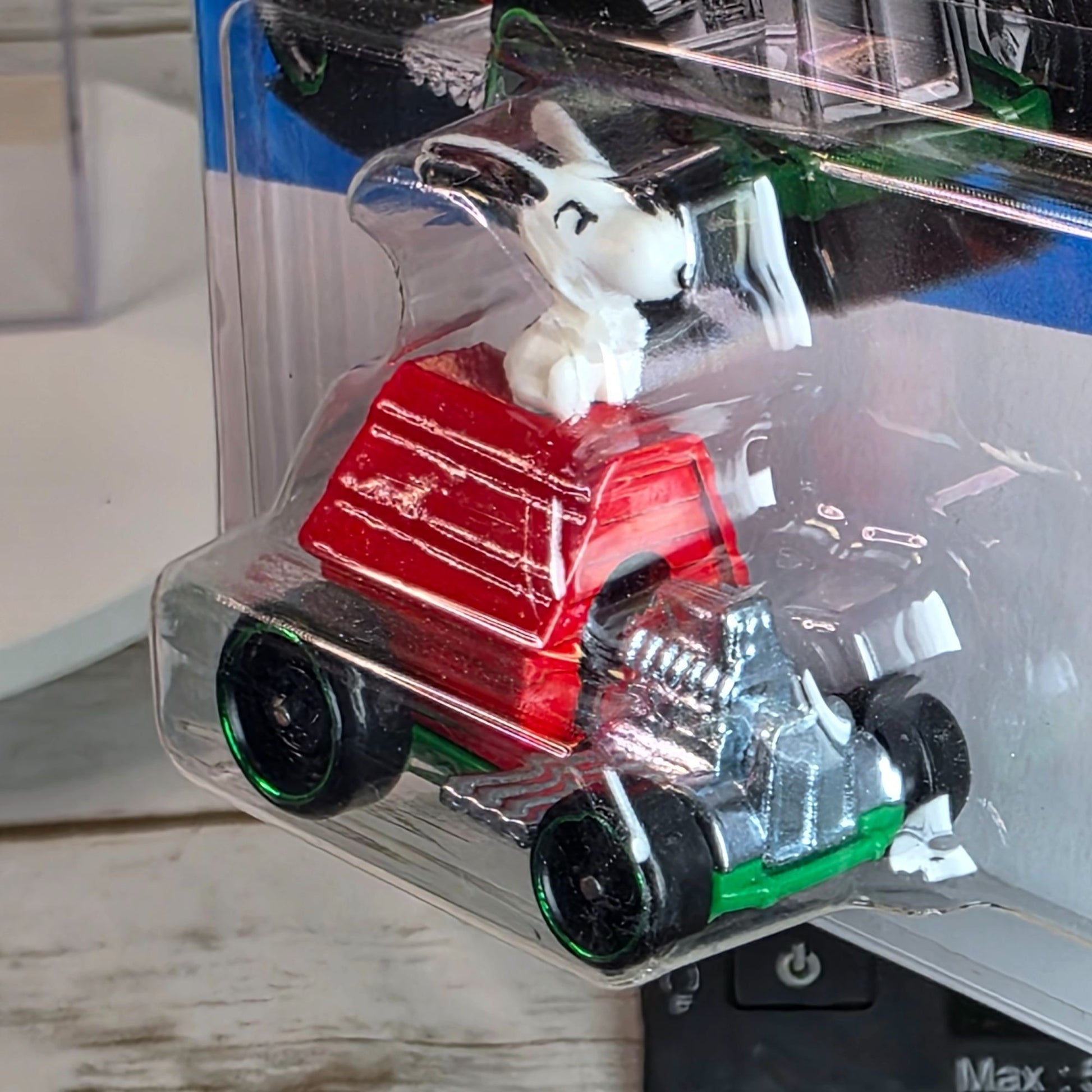 This collectible Hot Wheels Snoopy die-cast car from the HW Screen Time series captures the whimsy of the beloved Peanuts character in a creative design. Featuring Snoopy atop his iconic doghouse with vibrant red and green details, this limited edition piece is a must-have for enthusiasts and fans alike.