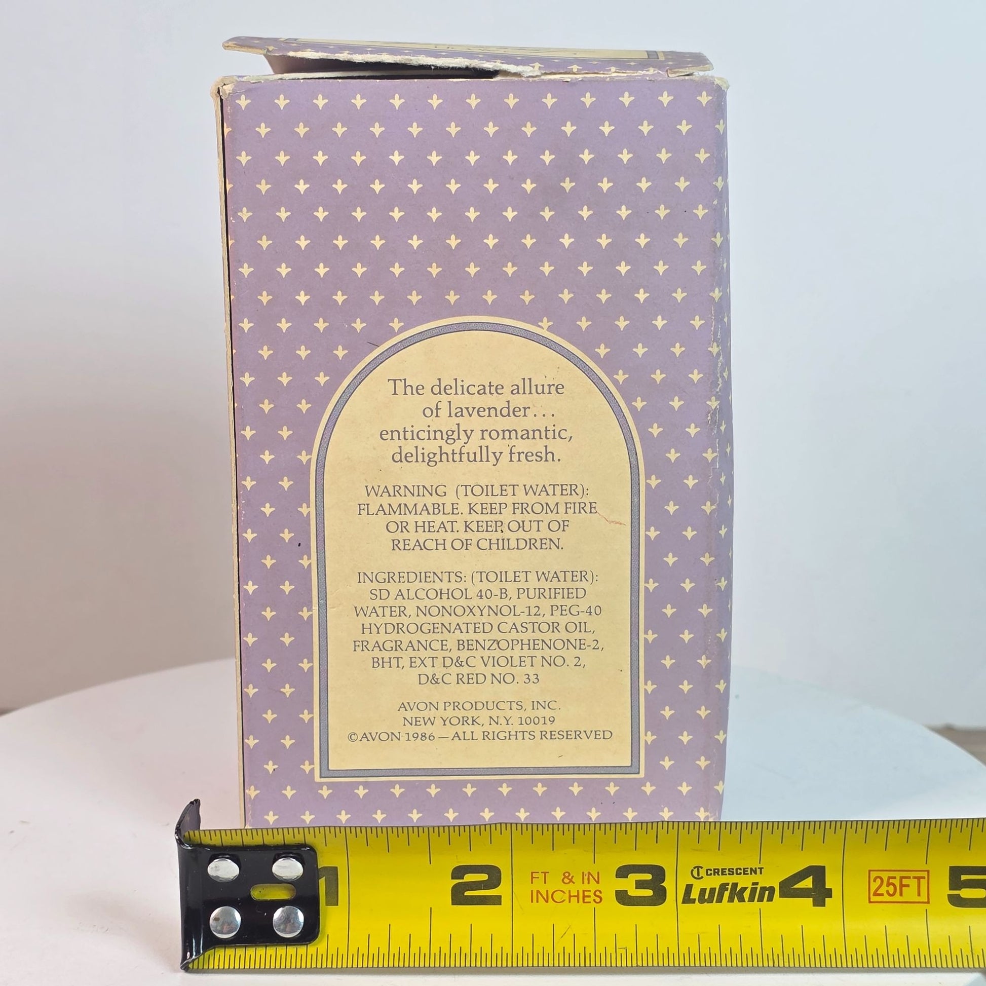 • • 4 FL OZ Toilet Water Bottle• 3 OZ Soap Bar• Romantic Lavender Fragrance• Vintage Avon Packaging• Elegant Gift Set