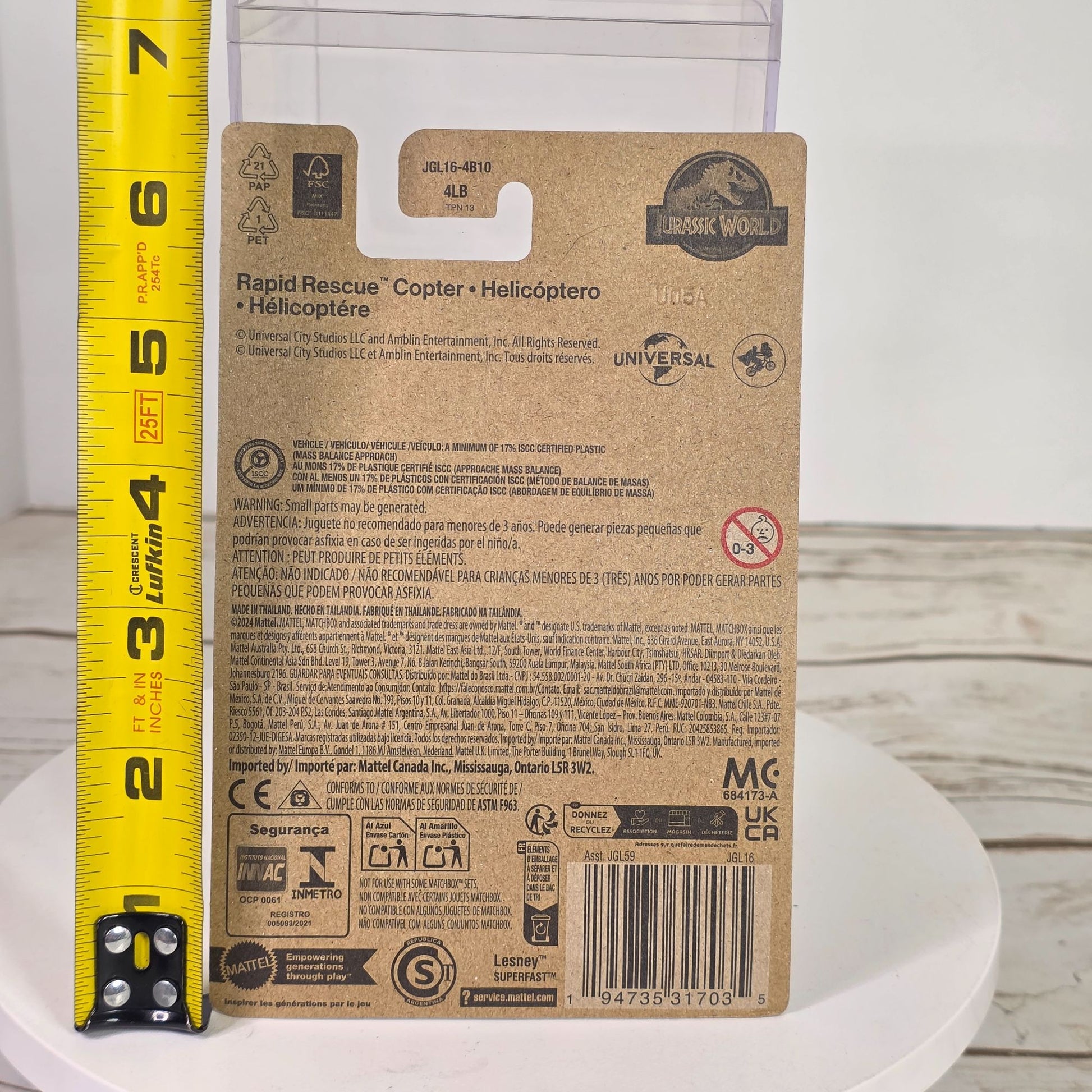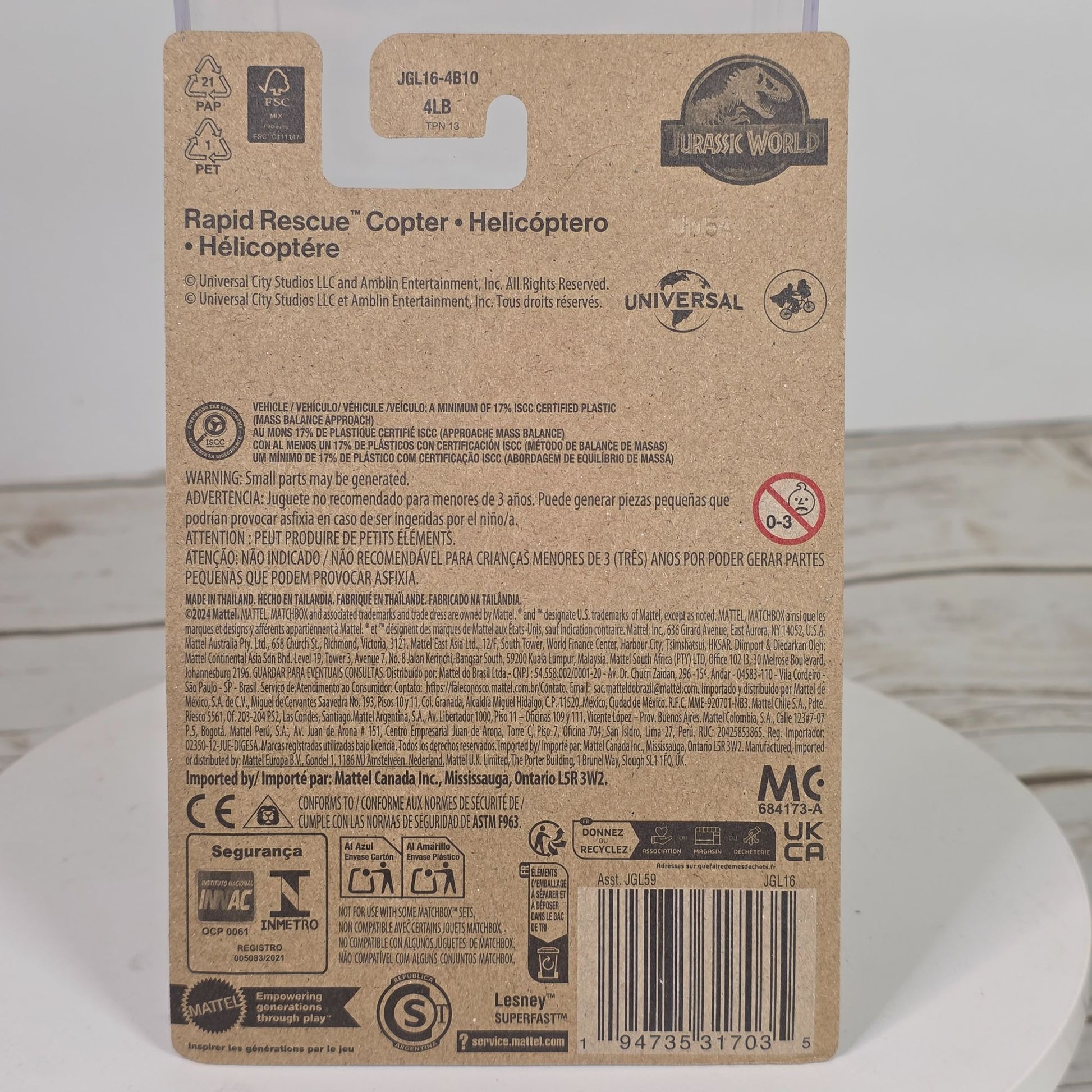 This Matchbox Rapid Rescue Copter offers a charming addition to any collection or playtime set. Designed to mirror Jurassic World's adventurous essence, its intricate details and durable craftsmanship ensure both display appeal and longevity in use. Perfectly scaled for imaginative play or display, this miniature helicopter encapsulates the thrill of rescue missions.
