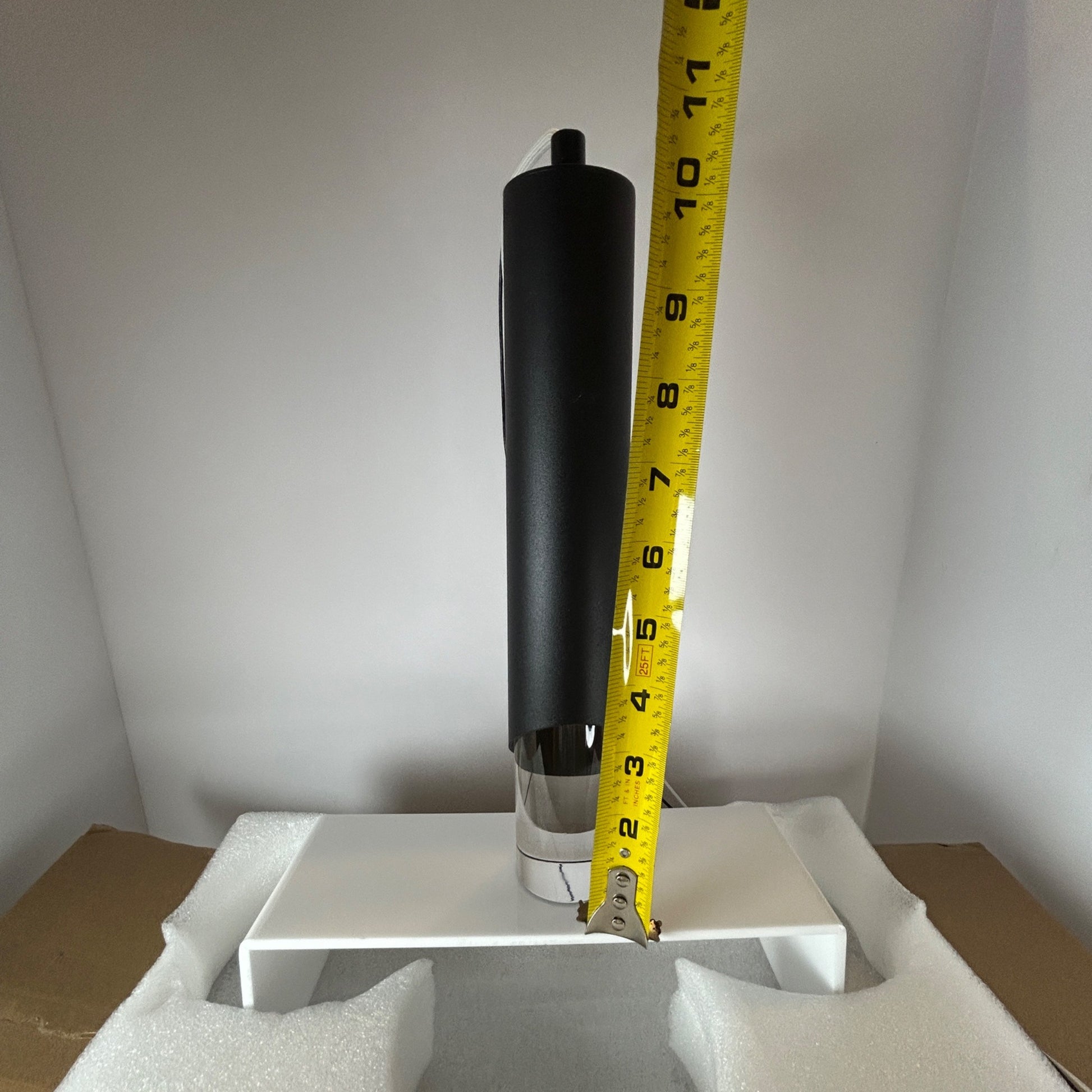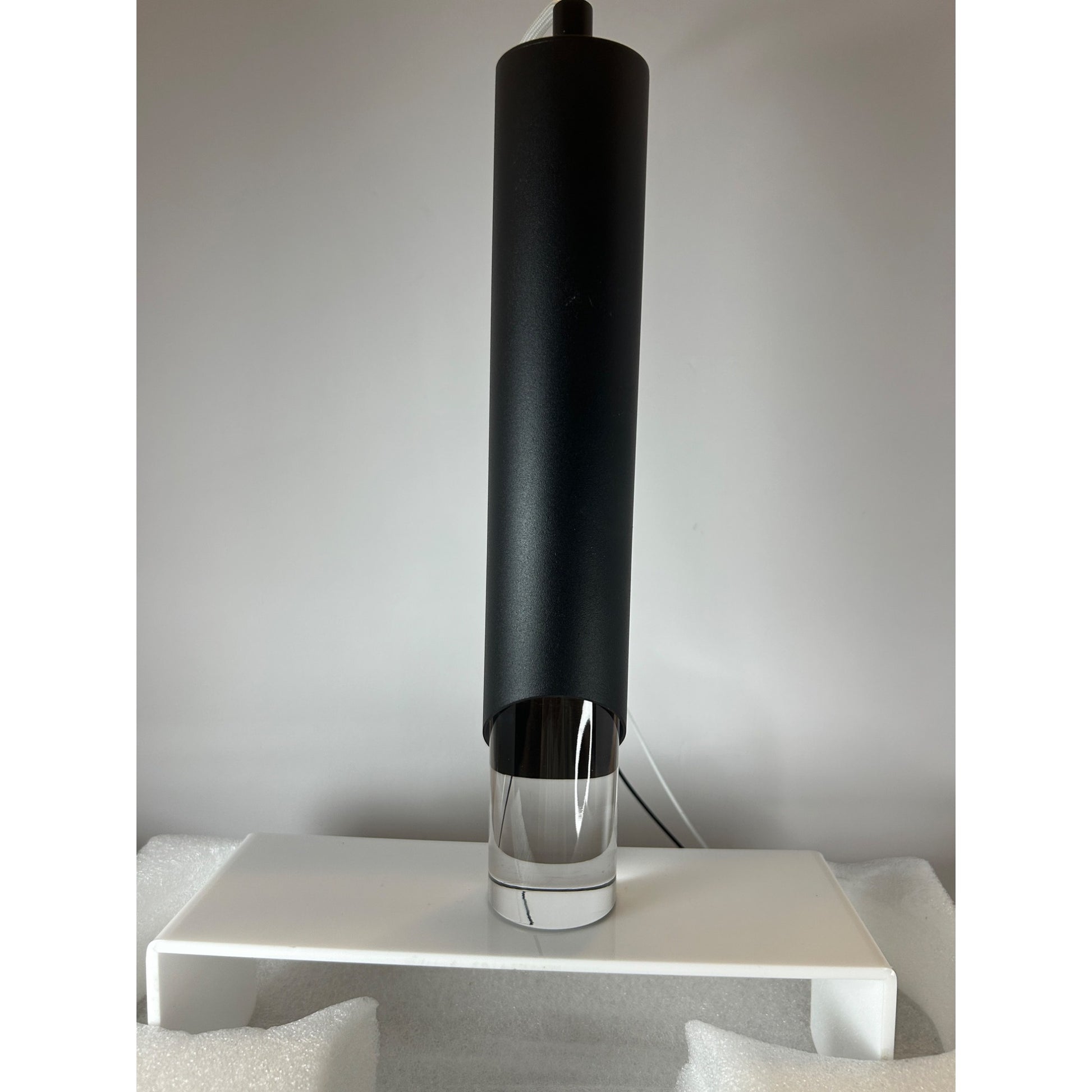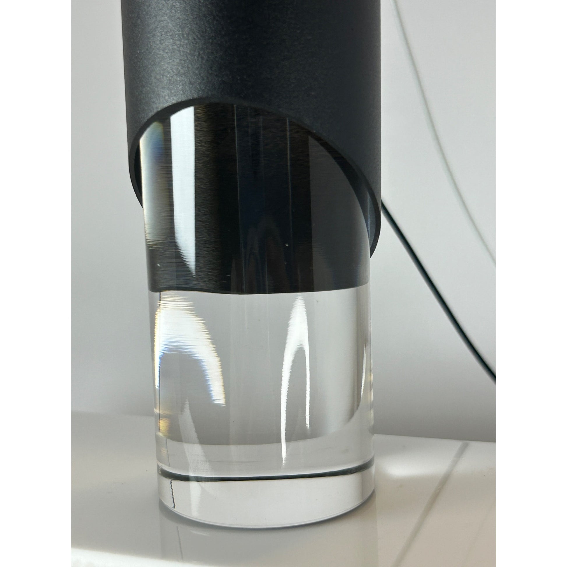 • Sleek black metal finish with clear acrylic bottom