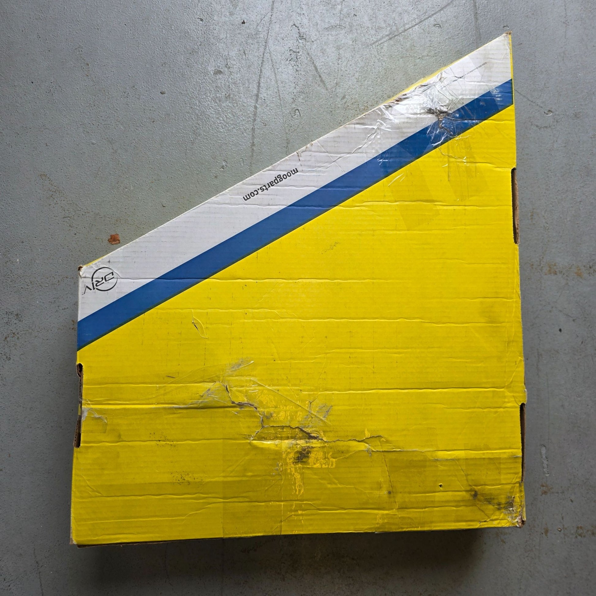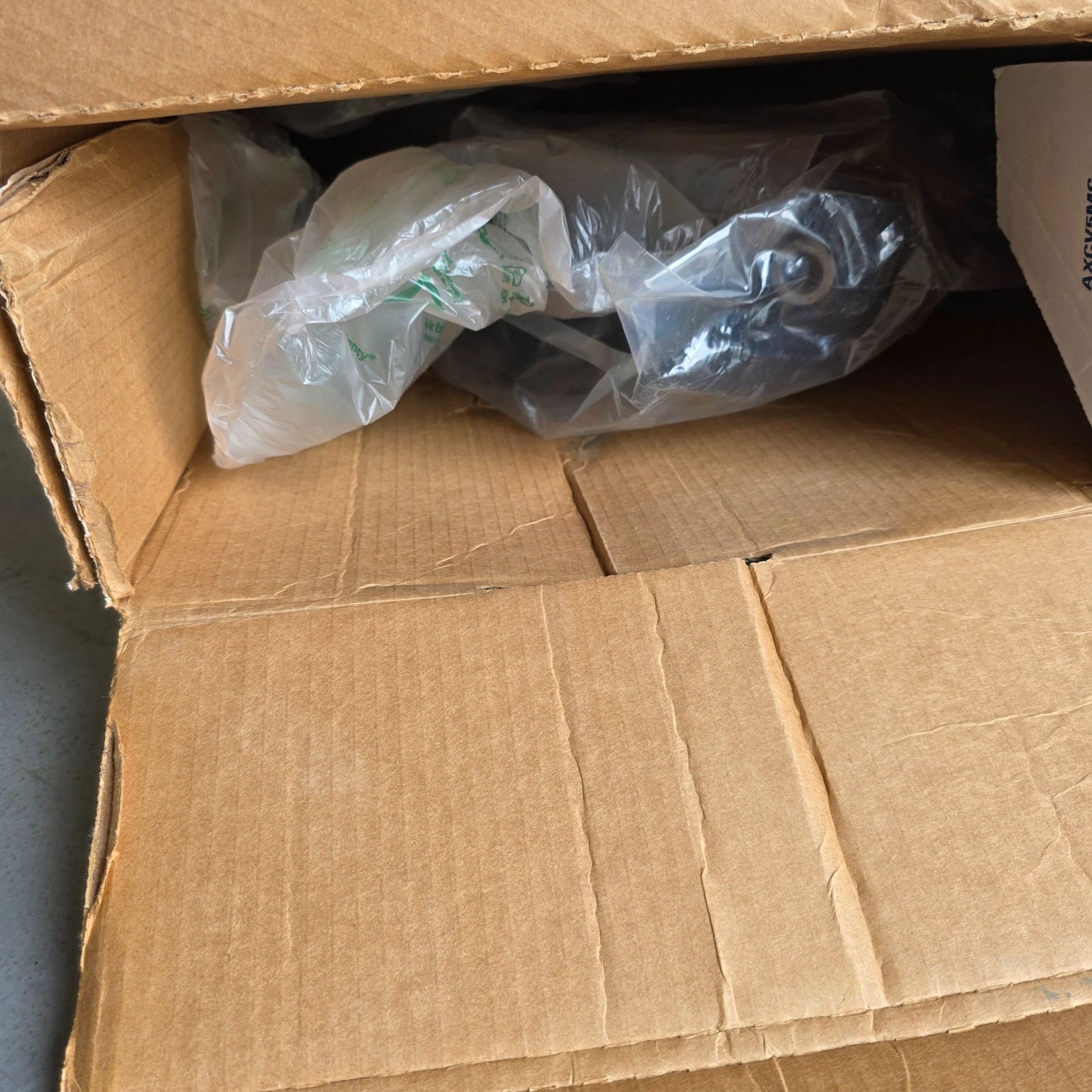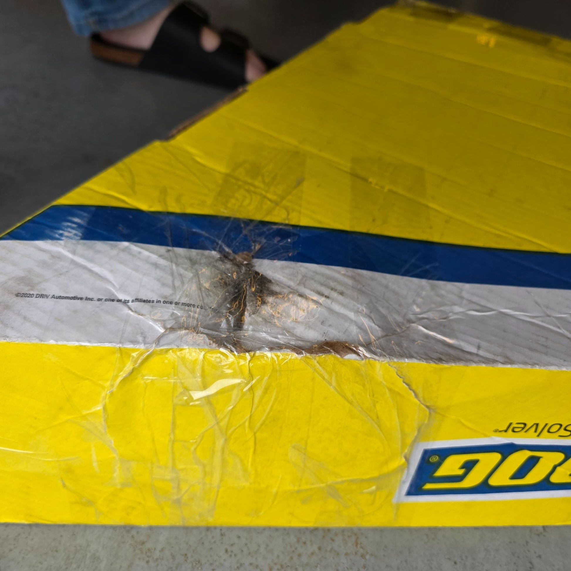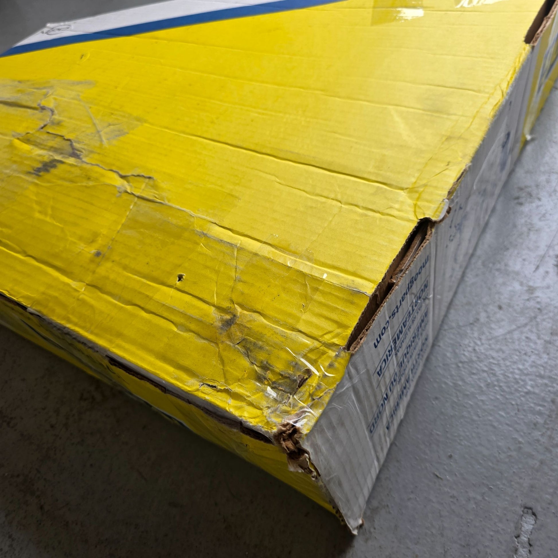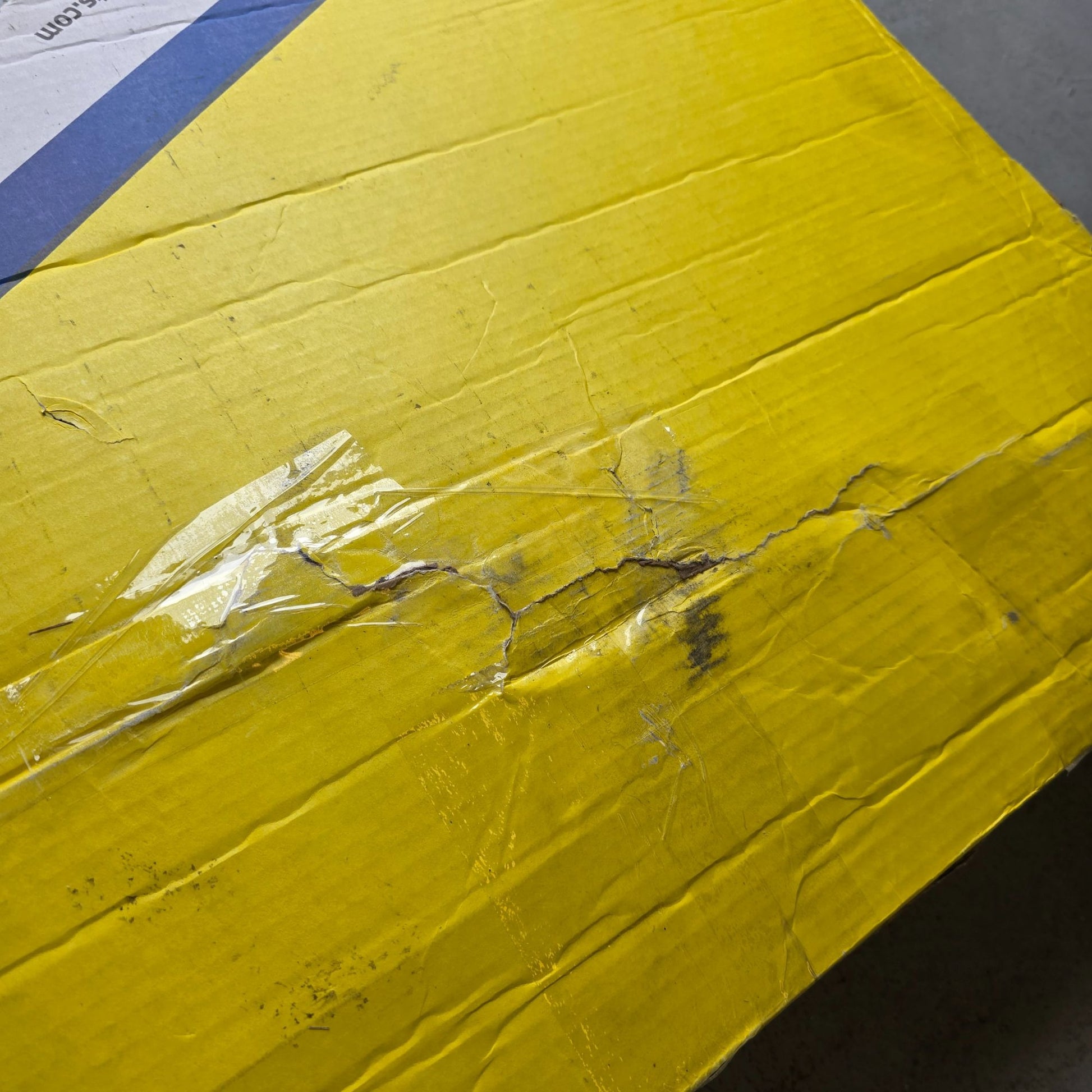 Box has visible dents and tears but contents appear unaffected. Box dimensions: approximately 21 x 14 x 5 inches.