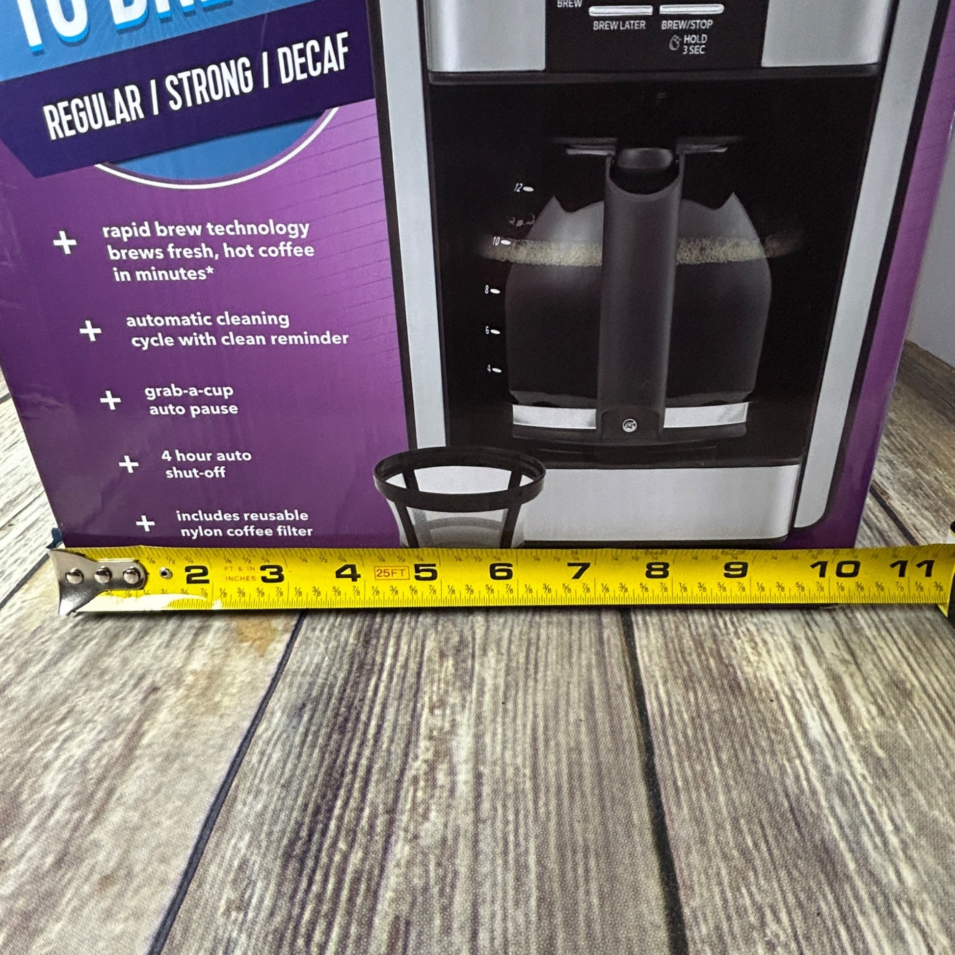 This Mr. Coffee machine boasts a 12-cup capacity, allowing the user to select between regular, strong, or decaf brew strength. The programmable features, including the brew later option, make it easy to wake up to freshly brewed coffee. Equipped with a reusable nylon coffee filter, it also features an automatic cleaning cycle.