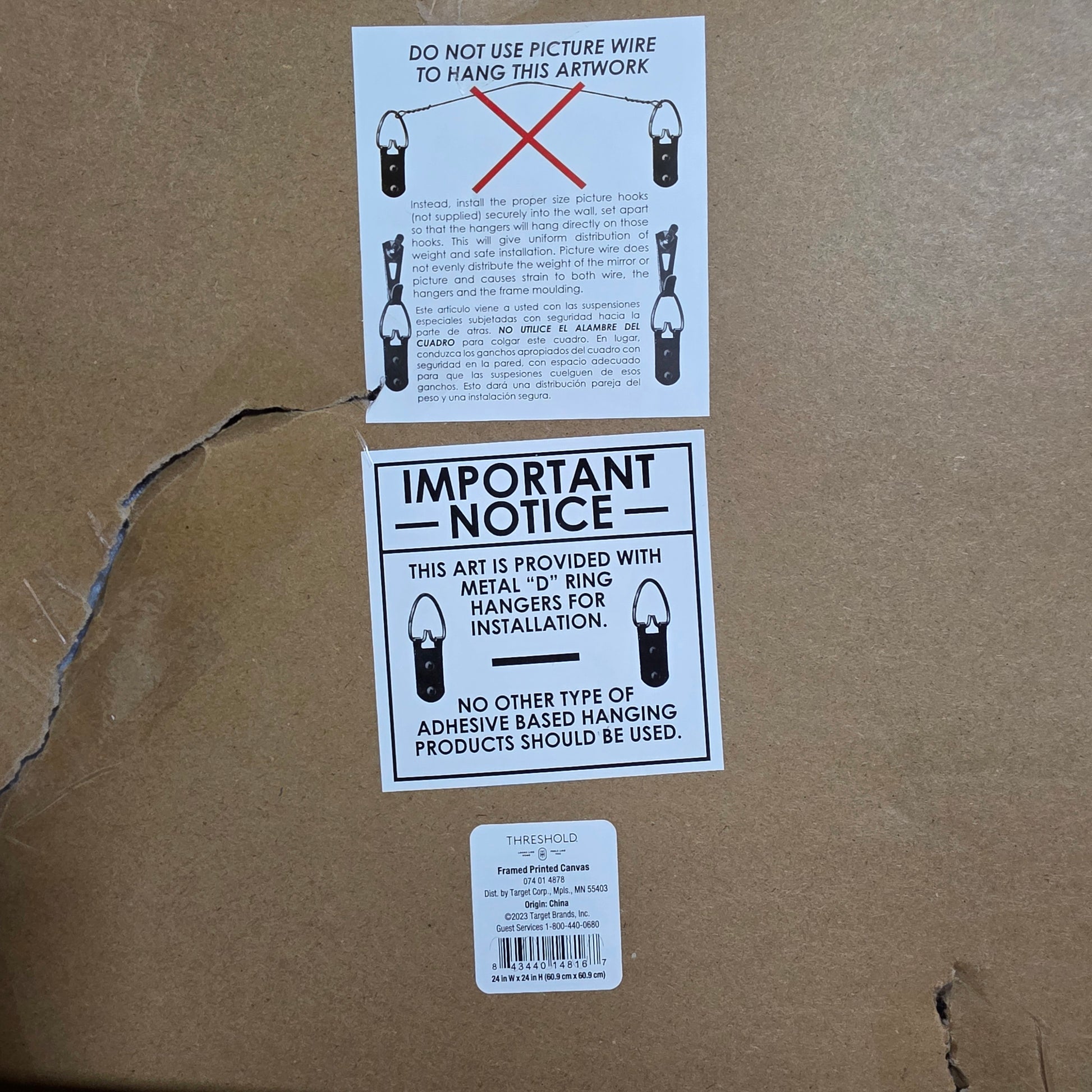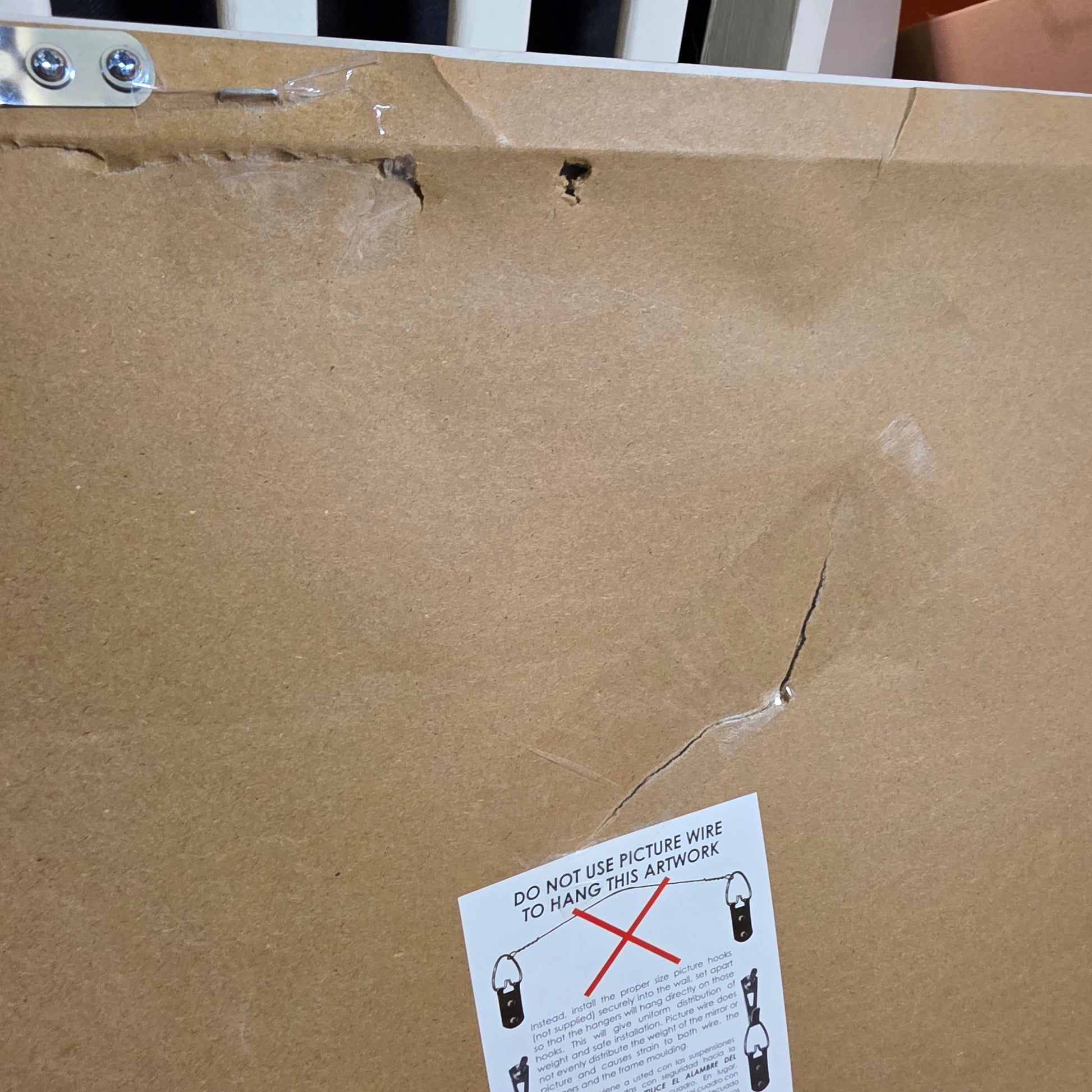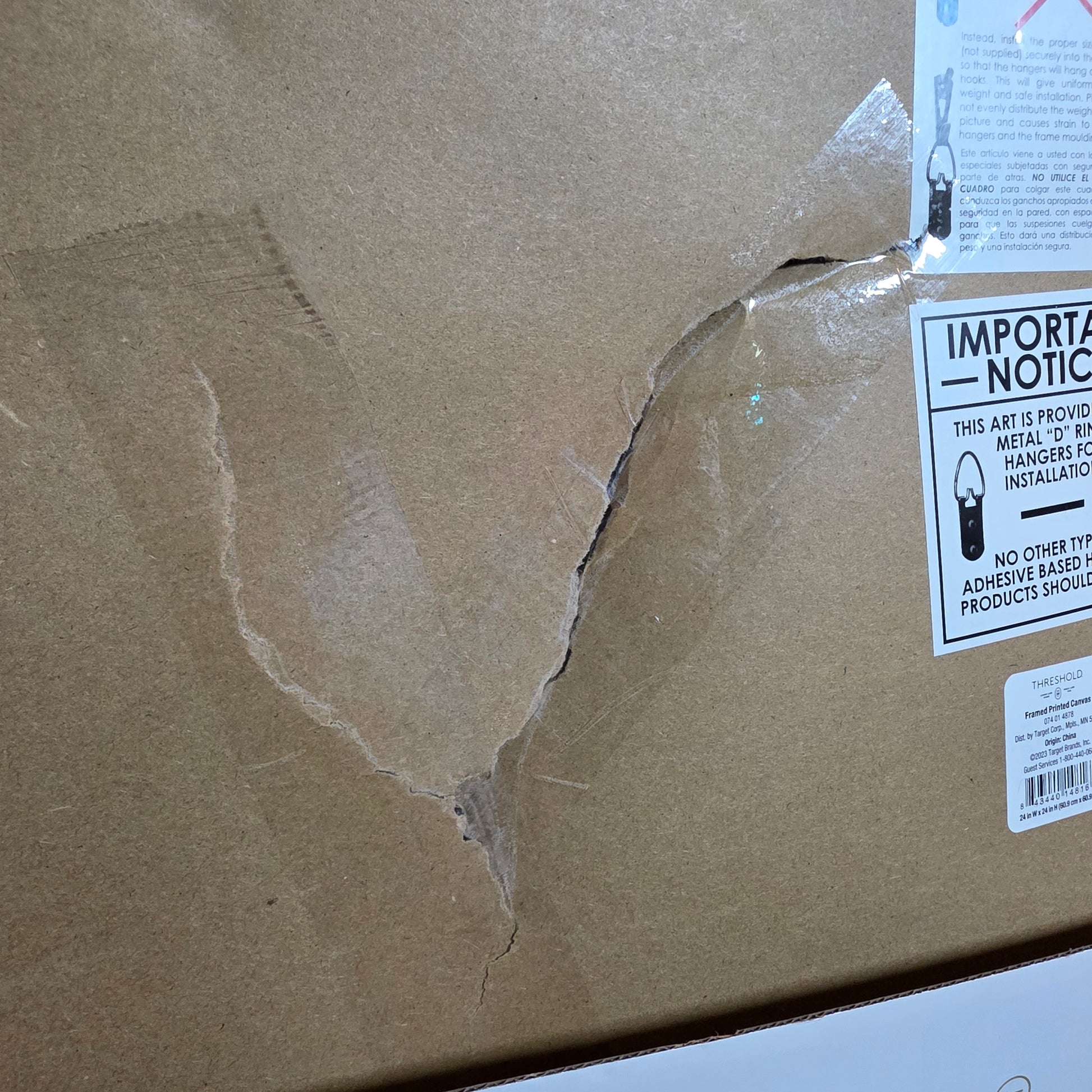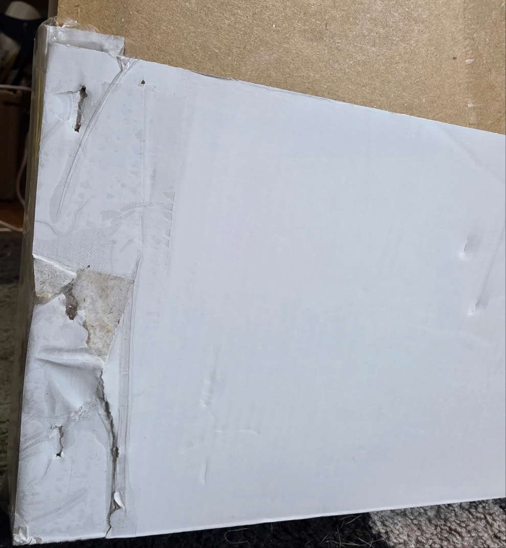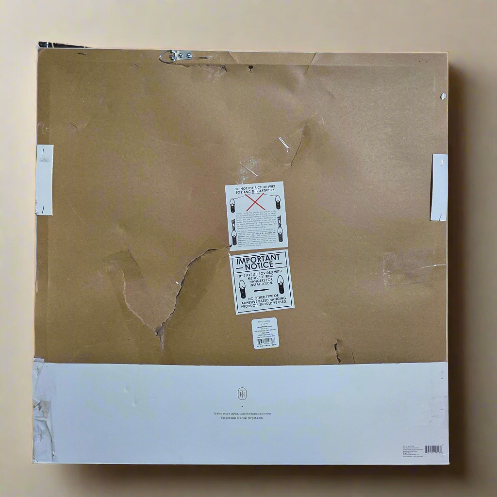 Original box packaging is damaged and has been taped. The canvas on the back is damaged and the paper backing was torn, but it has been taped to the best of my ability just to keep it cleaner. Please see photos for details.