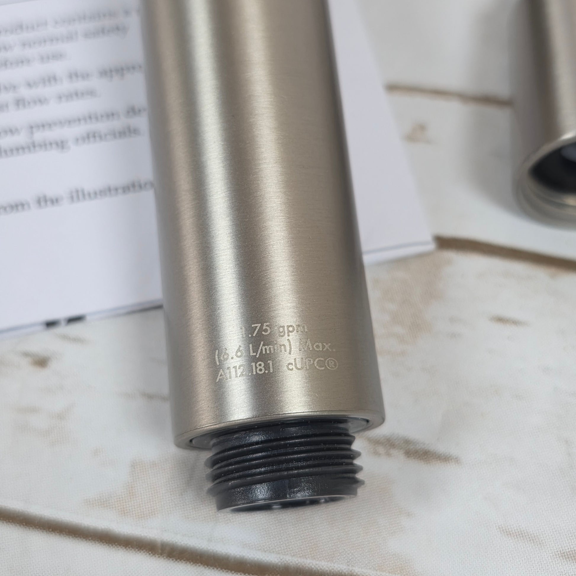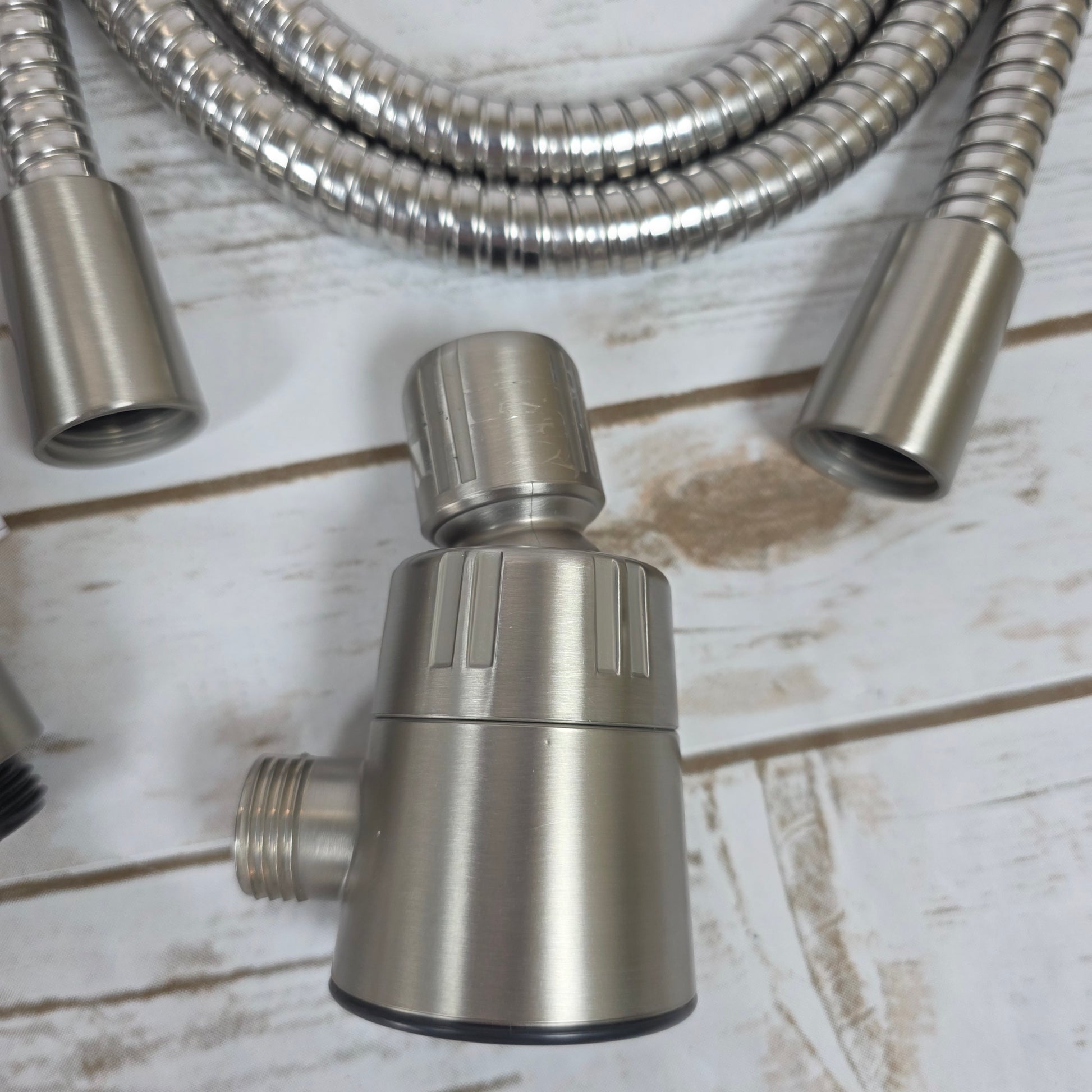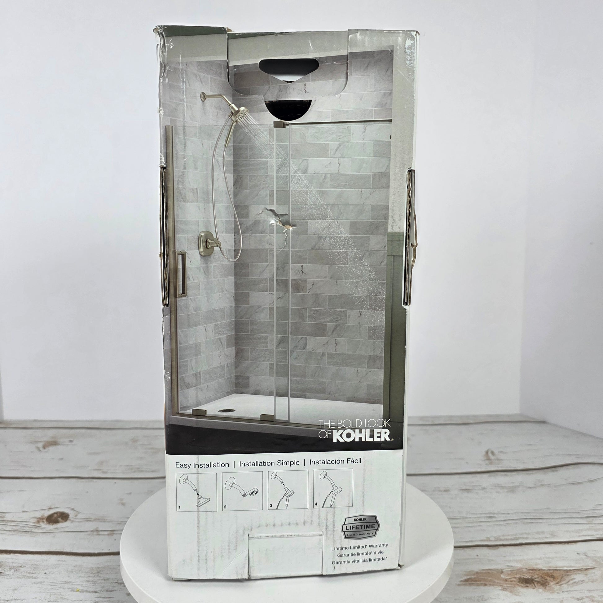 The NIOP New KOHLER Ashan Multifunction Handshower in Brushed Nickel provides versatility with its multiple spray patterns and a secure grip handle. Its brushed nickel finish adds a touch of elegance to any bathroom. Enhance your daily shower experience with this expertly designed and durable handshower. There are scratches around the neck of the one attachment, but it is clean and looks unused overall. Please see photos for details.