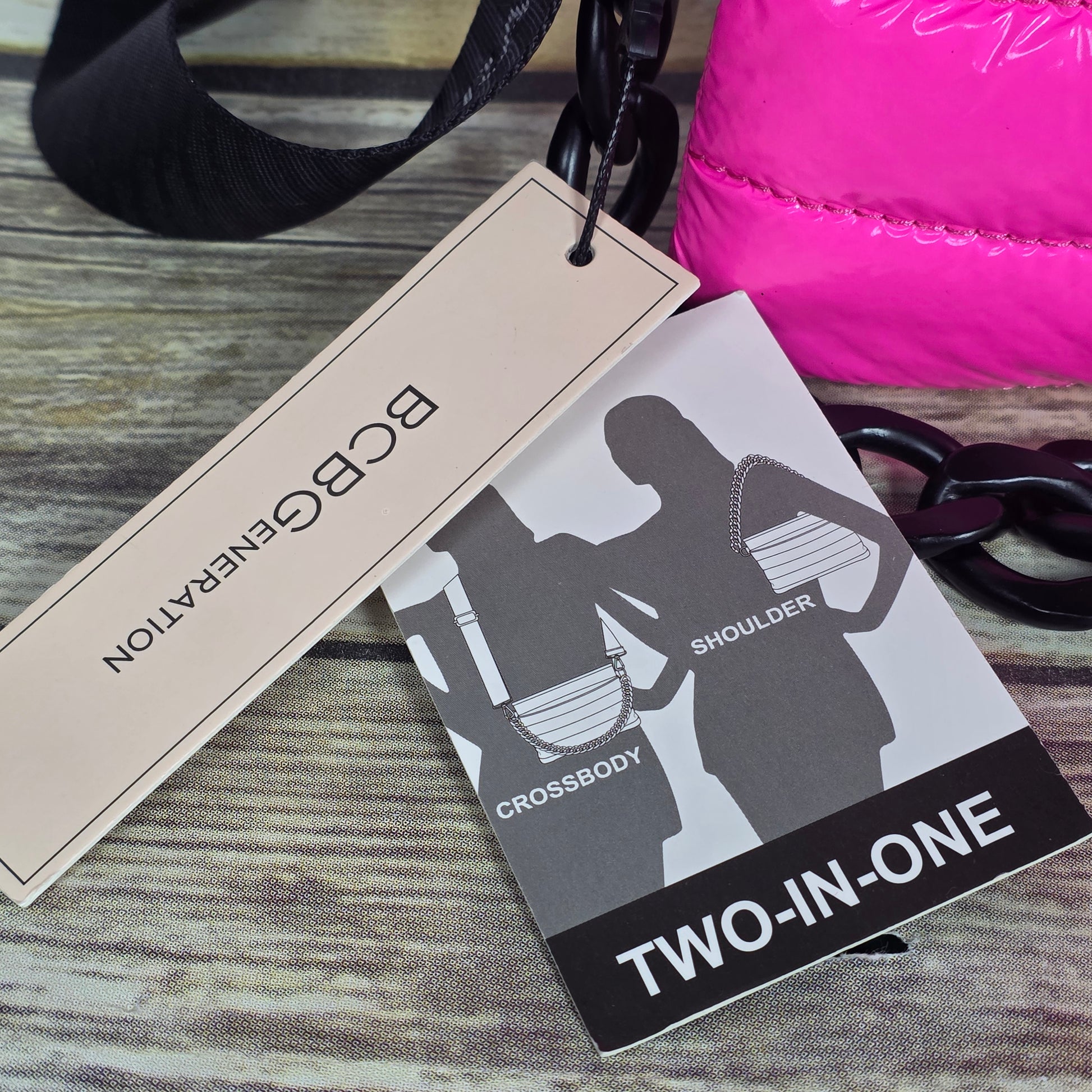 Introducing the NWT New BCBG Generation Hot Pink Puffy Vinyl GN22374 2-in-1 Convertible Bag! This bag is the perfect combination of style and functionality, with a hot pink puffy vinyl exterior and a convertible design that allows you to switch between a shoulder bag and a crossbody bag. Stay on-trend and effortlessly cool with this must-have accessory.