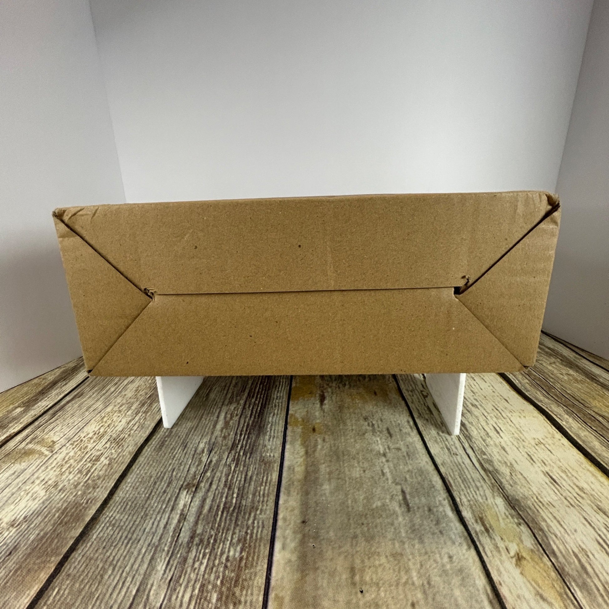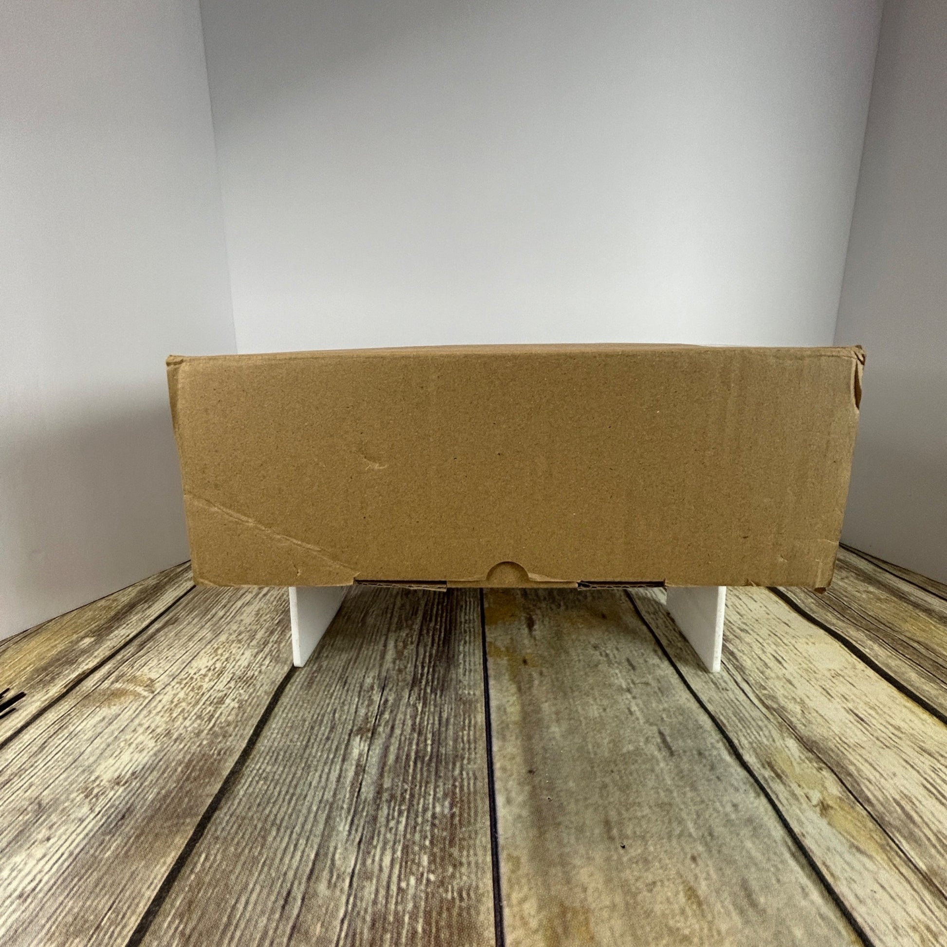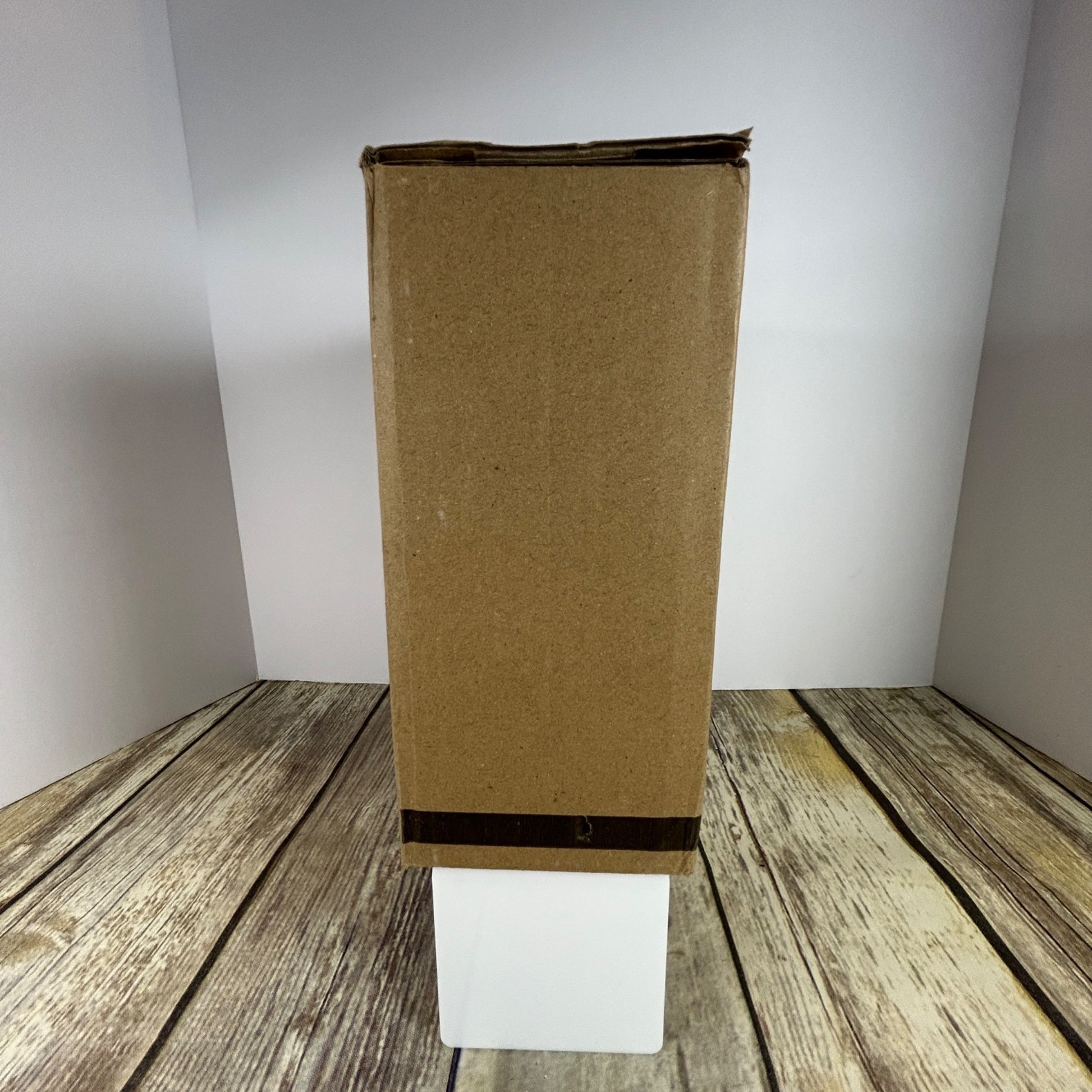 Box shows minor wear and dents, no apparent damage to the product inside. Box dimensions: top to bottom = 9.5 inches, side to side = 9.6 inches.