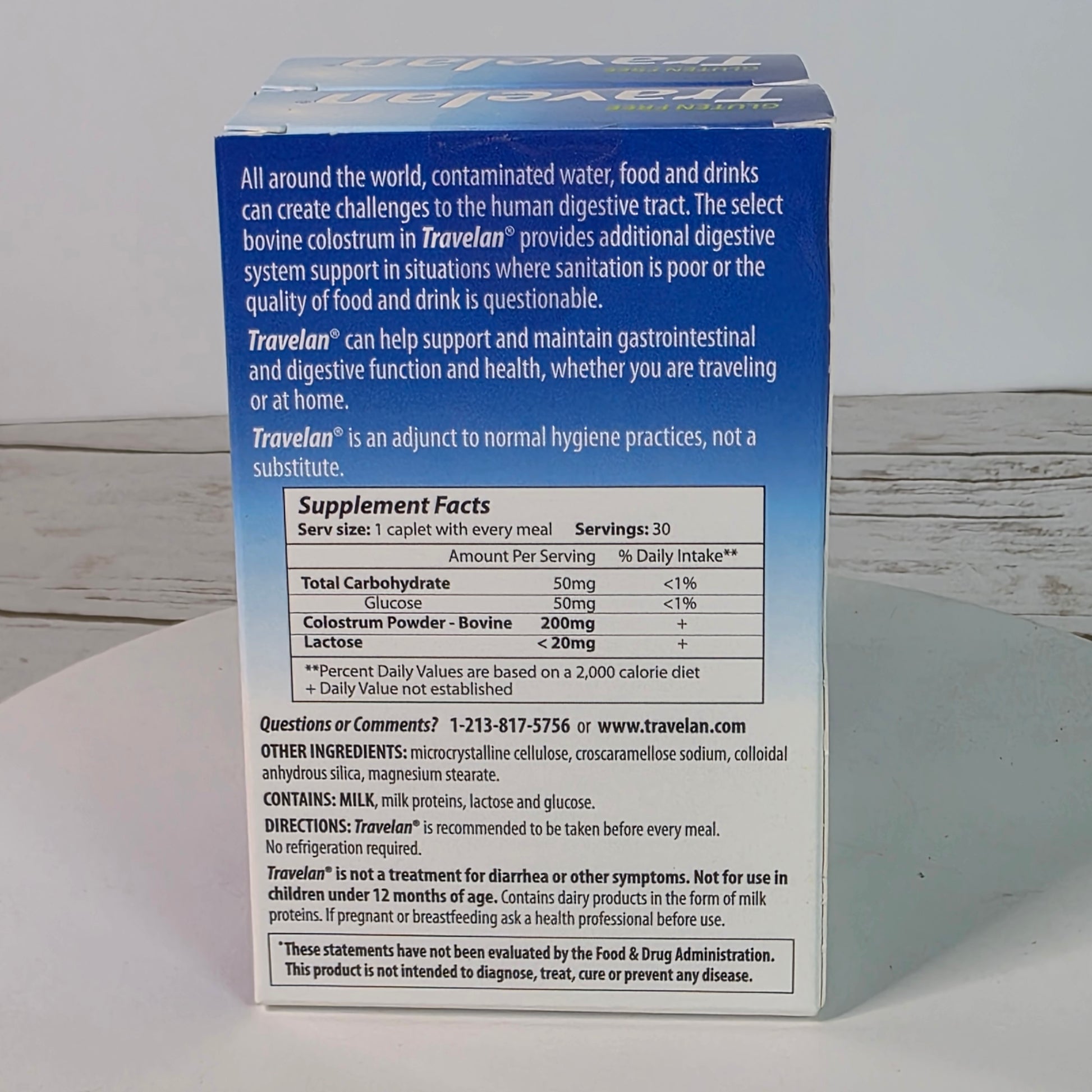 Boost your immune system and stay healthy while traveling with this set of 2 NIB New Travelan Bovine Colostrum Dietary Supplements. Each caplet contains 200mg of powerful colostrum to support your body's natural defense against infections. With 30 caplets per box, you'll have enough to keep you protected on all your adventures.