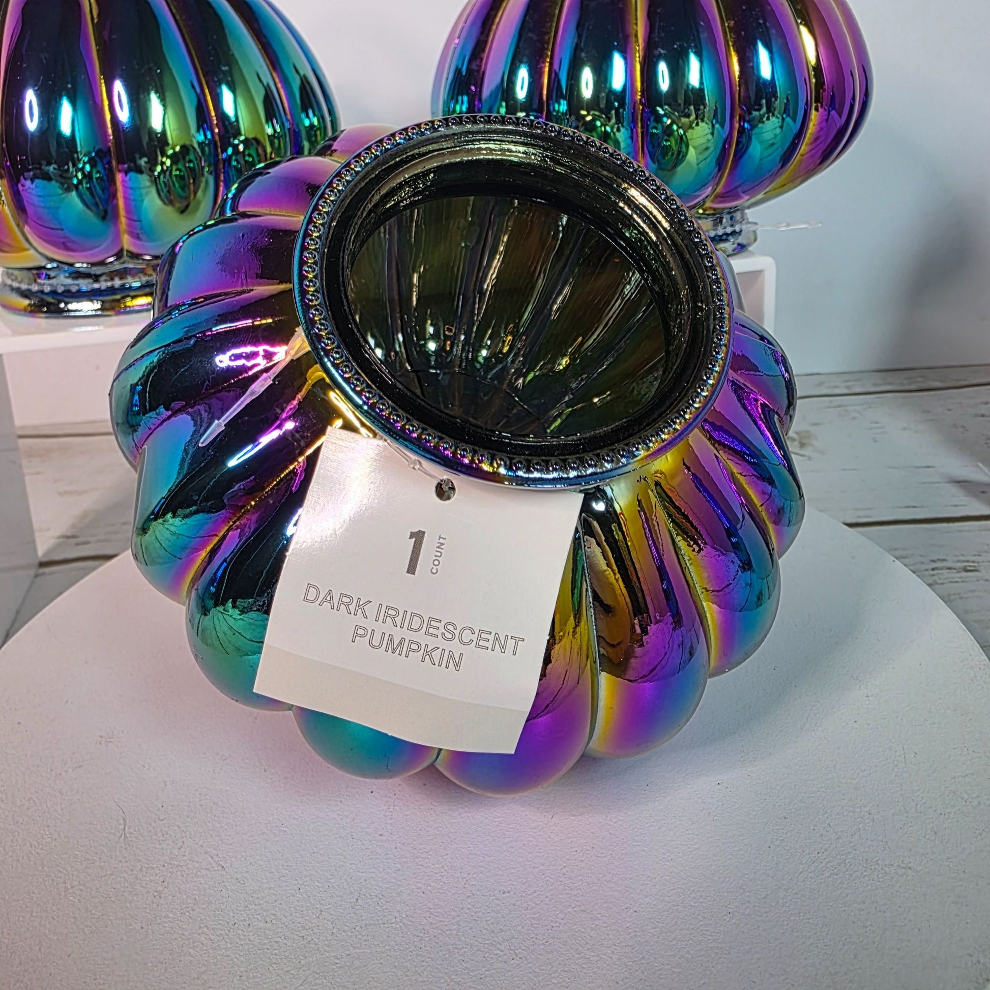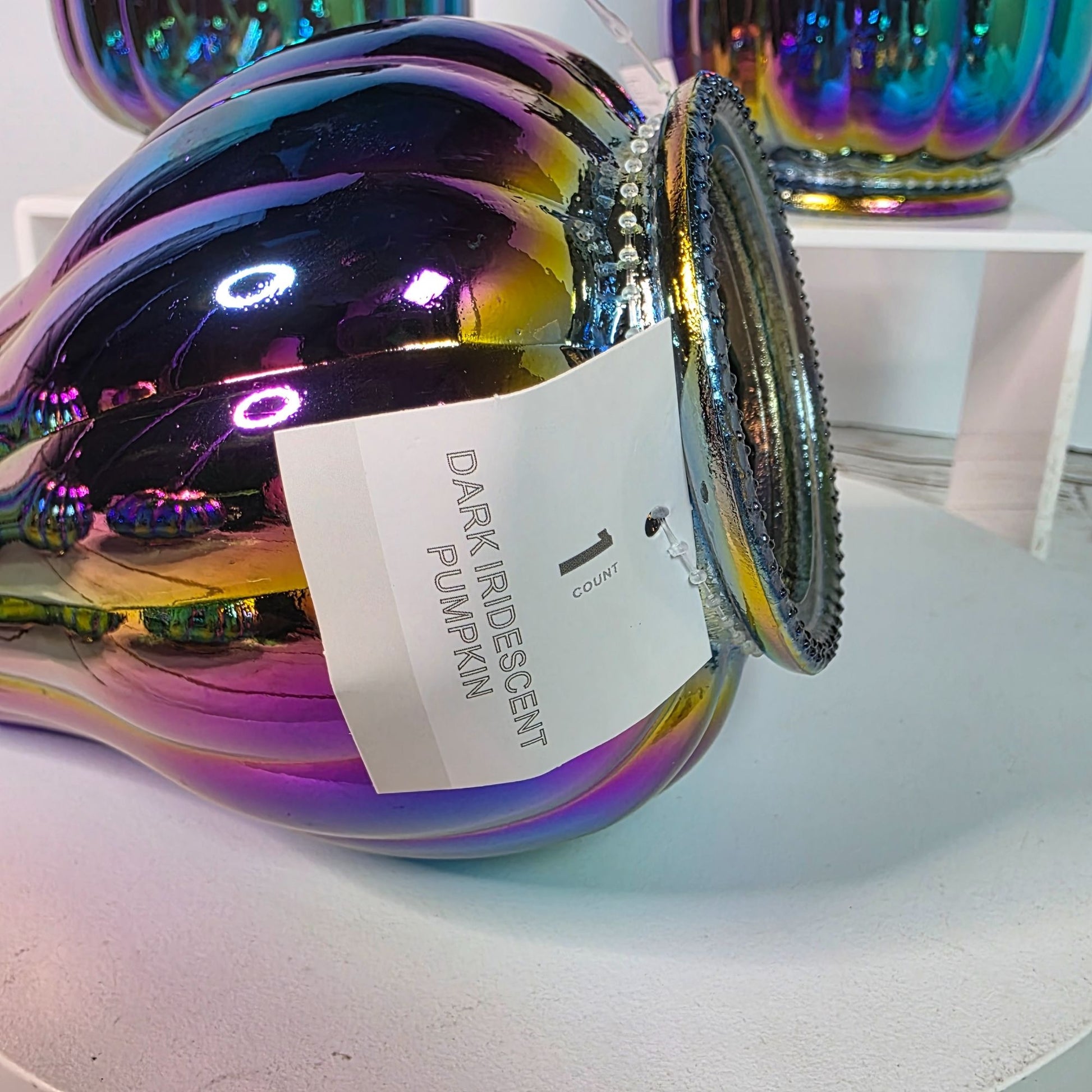 Enhance your Halloween decor with these dark iridescent pumpkins and gourds. Their shimmering surface adds a spooky yet elegant touch to your seasonal display.