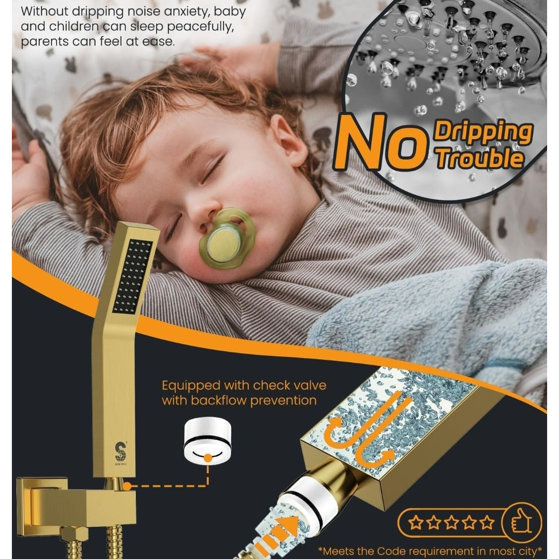 This luxurious rain shower system, crafted from H59 pure brass with a brushed gold finish, ensures durability and a sophisticated aesthetic. Designed with cUPC certification, it features a precision-engineered 2mm thick showerhead, providing an evenly distributed, immersive water flow. The handheld shower includes a backflow prevention valve, ensuring safety and convenience.