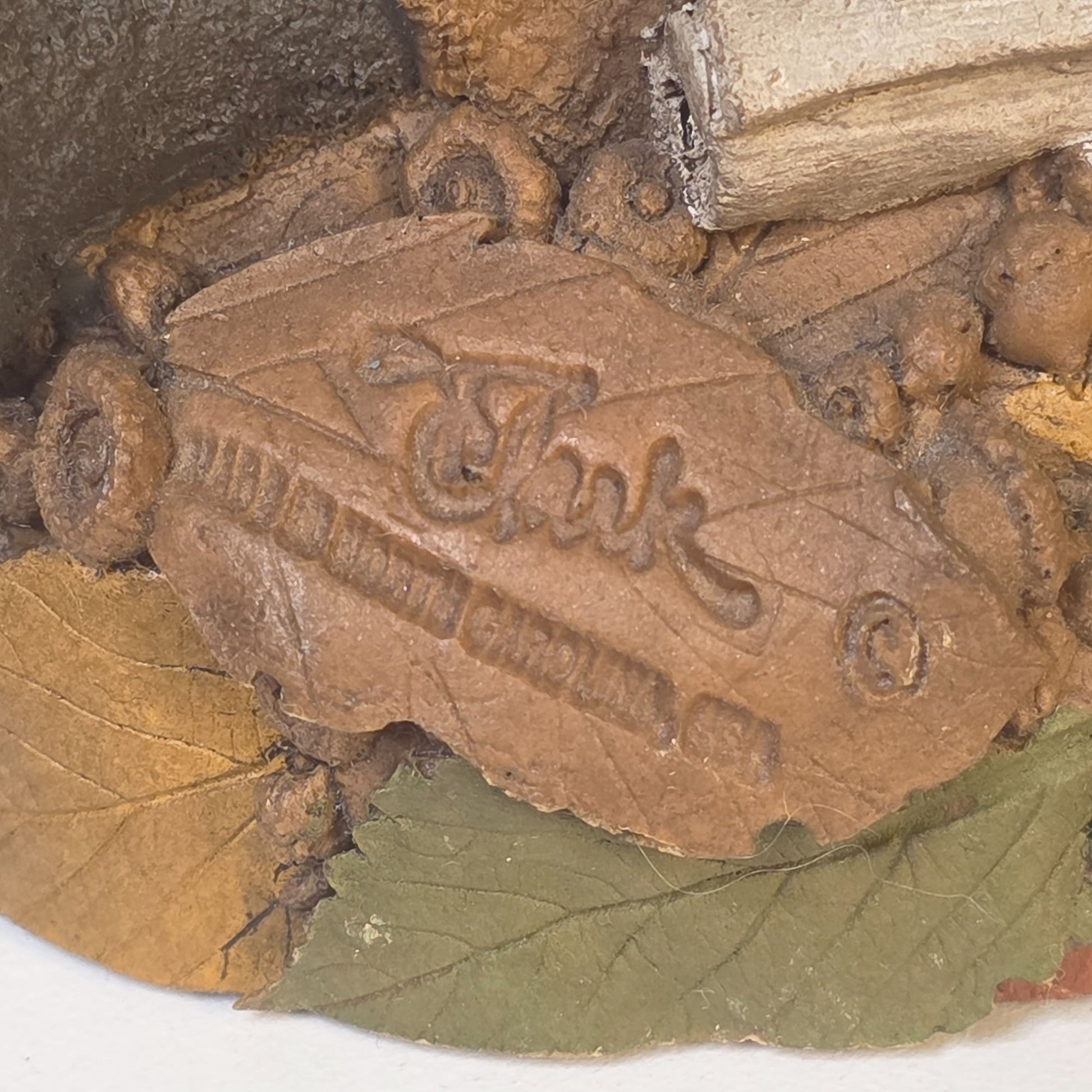 This charming figurine by renowned artist Tom Clark depicts a gnome reading a book under the gaze of a wise owl. Crafted with meticulous detail, it captures the essence of woodland wisdom. The intricate textures and earth-toned palette evoke a sense of nostalgia and whimsy, making it a treasured collectible for those who appreciate folk art.