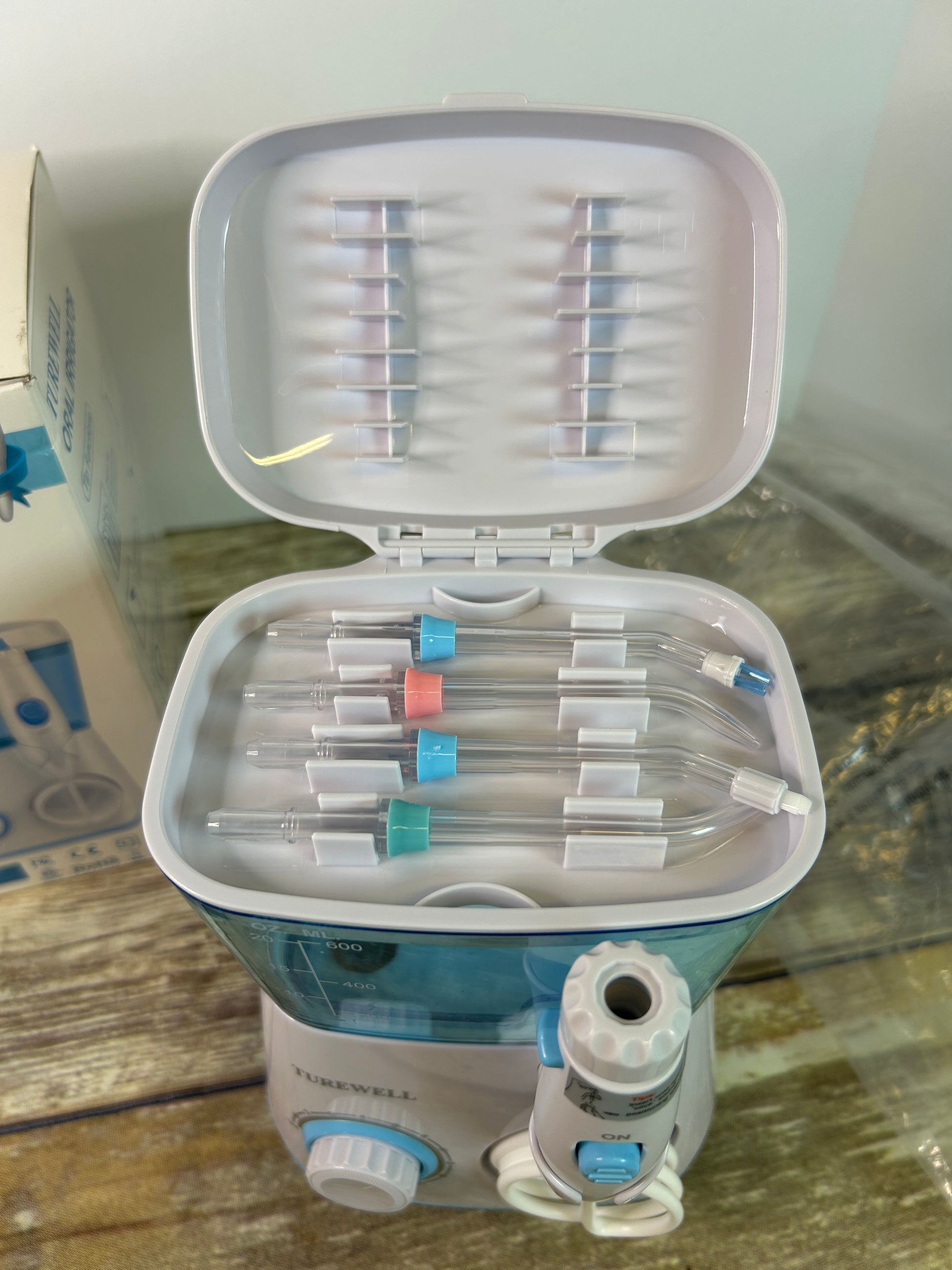 Achieve a confident and healthy smile with TUREWELL Water Flossing Oral Irrigator. This premium dental cleaner boasts 10 adjustable pressure settings and a 600ML capacity, ensuring a thorough and effective clean. With 8 replacement jet tips, this electric oral flosser is perfect for the whole family. Experience the luxury of a complete oral care routine.