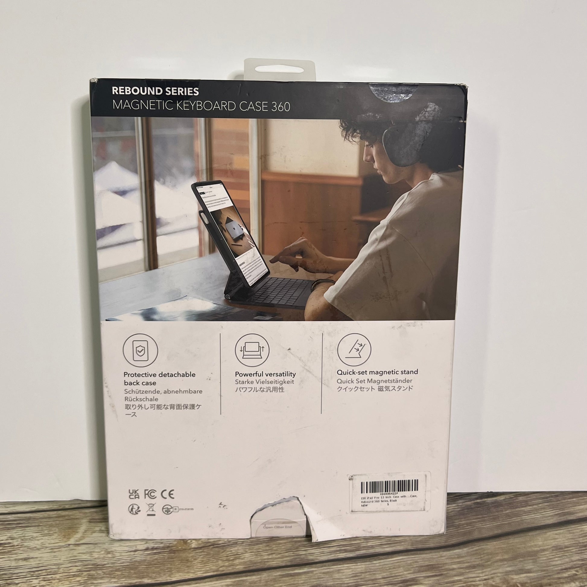 ESR Magnetic Keyboard Case 360 for iPad Pro 13 offers an easy-set magnetic stand that allows for both portrait and raised modes, providing versatile and adjustable options. The case is also removable for convenience and part of the durable Rebound 360 series. Perfect for the M4, 2024 iPad Pro 13 model. Box has some damage to the bottom opening of the box, see photos.
