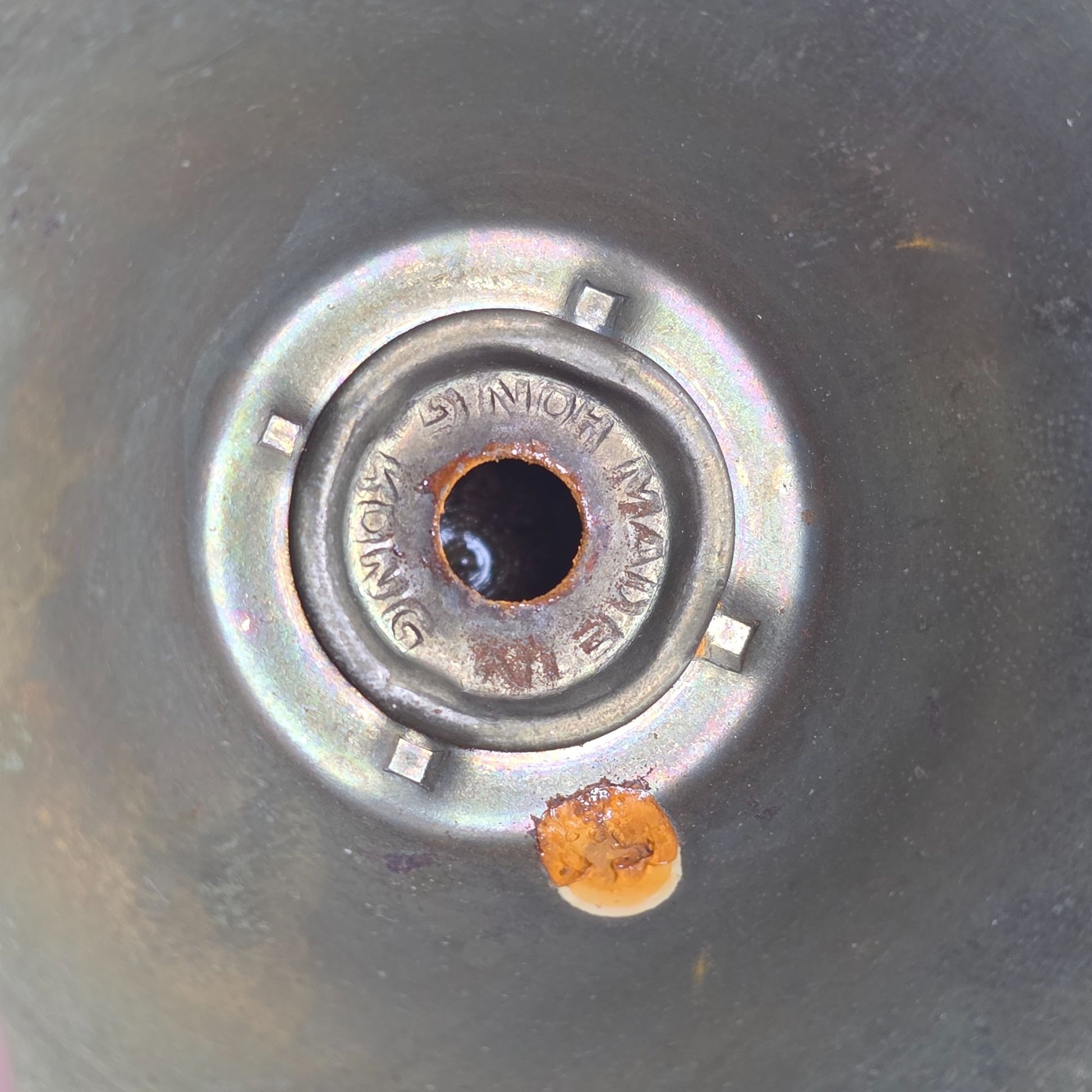 Metal shows rust and wear. Glass is in good condition with no visible cracks or chips. Top to bottom = 8 inches.