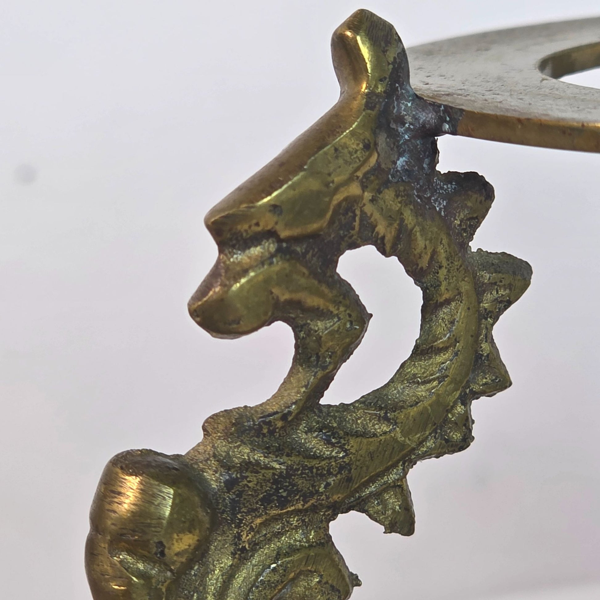 This exquisite vintage brass stand showcases a trio of intricately designed dragons, meticulously crafted to support a blown glass paperweight. The ornate dragon figures bring a touch of mythical grandeur, their detailed features echoing tales of ancient lore. The solid brass construction offers durability, while its distinguished patina adds a historical charm, making it both a functional and decorative artifact, perfect for enhancing any desktop or display area with its unique and timeless appeal.