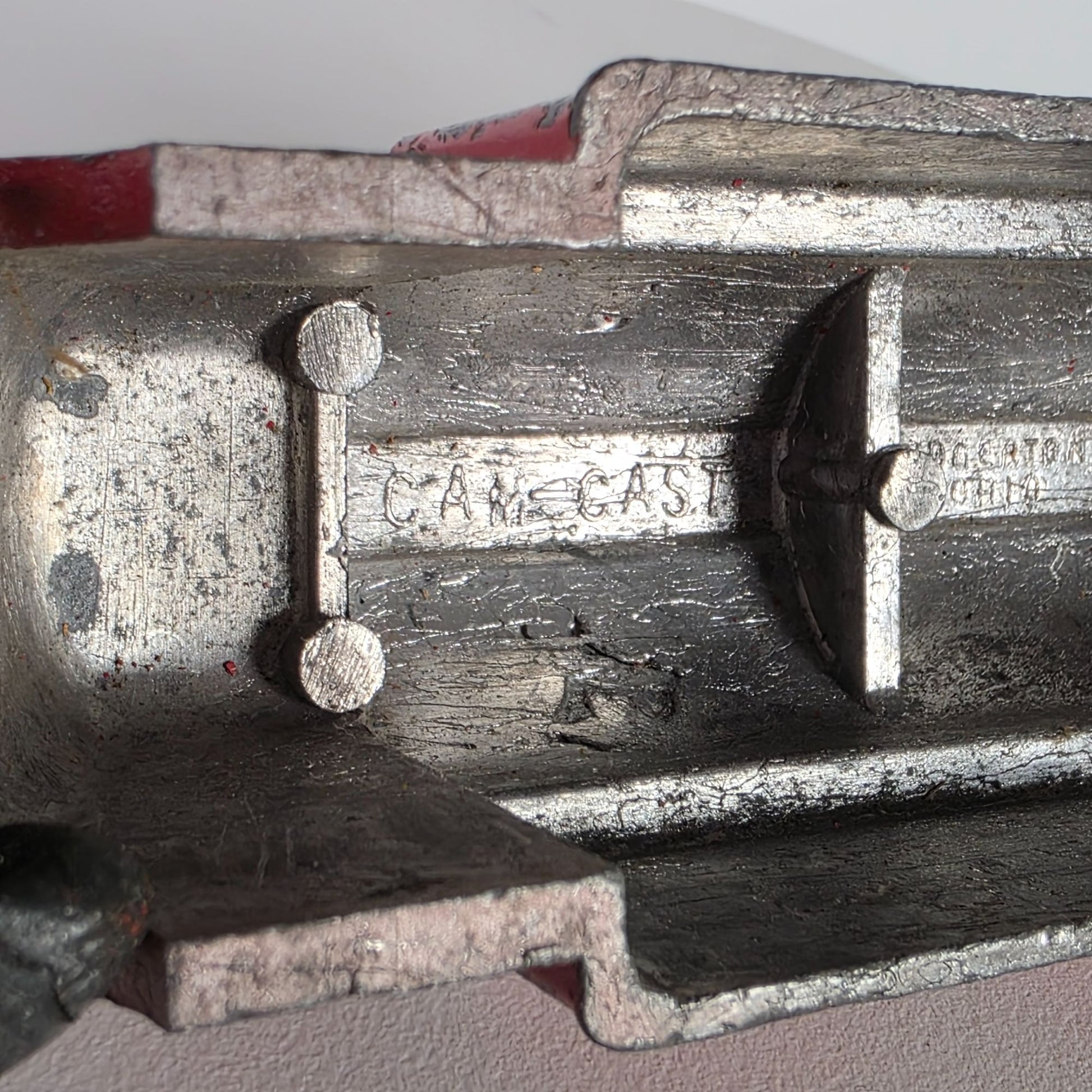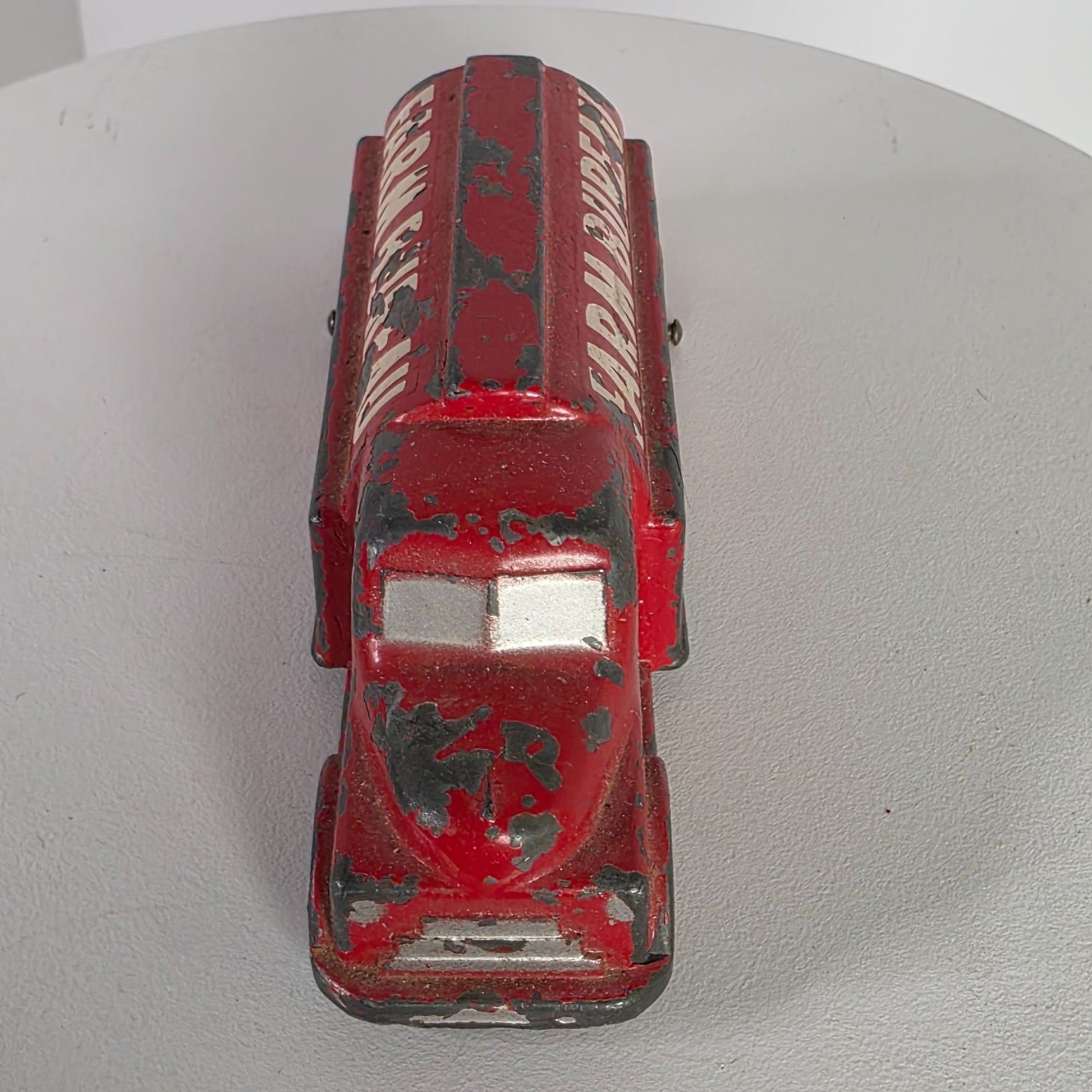 This rare vintage diecast Farm Bureau tanker truck, crafted by Cam Cast in Edgerton, Ohio, is a unique collector's find. Despite its as-is condition with missing wheels and one damaged wheel, it retains a distinctive charm. Its red finish, though weathered, hints at the rich history behind this 5-inch piece. An exemplar of mid-century toy craftsmanship, this truck offers an irreplaceable glimpse into the past, making it a rare addition to any collection.