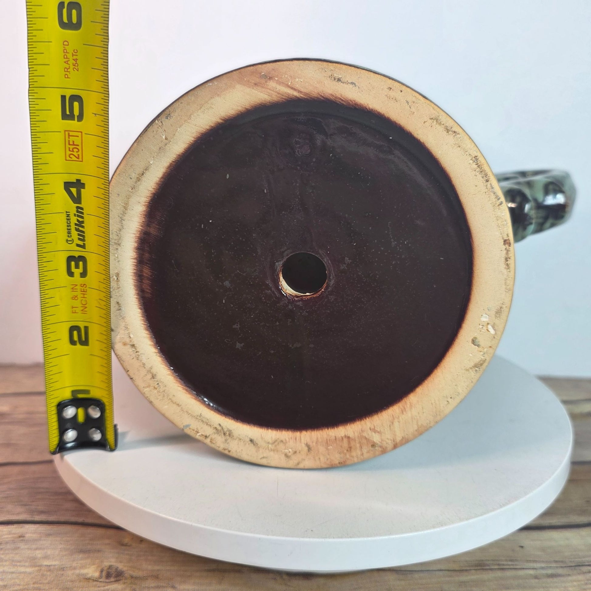 • • Double handles for easy carrying • Intricate textured design • Sturdy ceramic construction • Versatile size for display or planting • Mid-century aesthetic appeal
