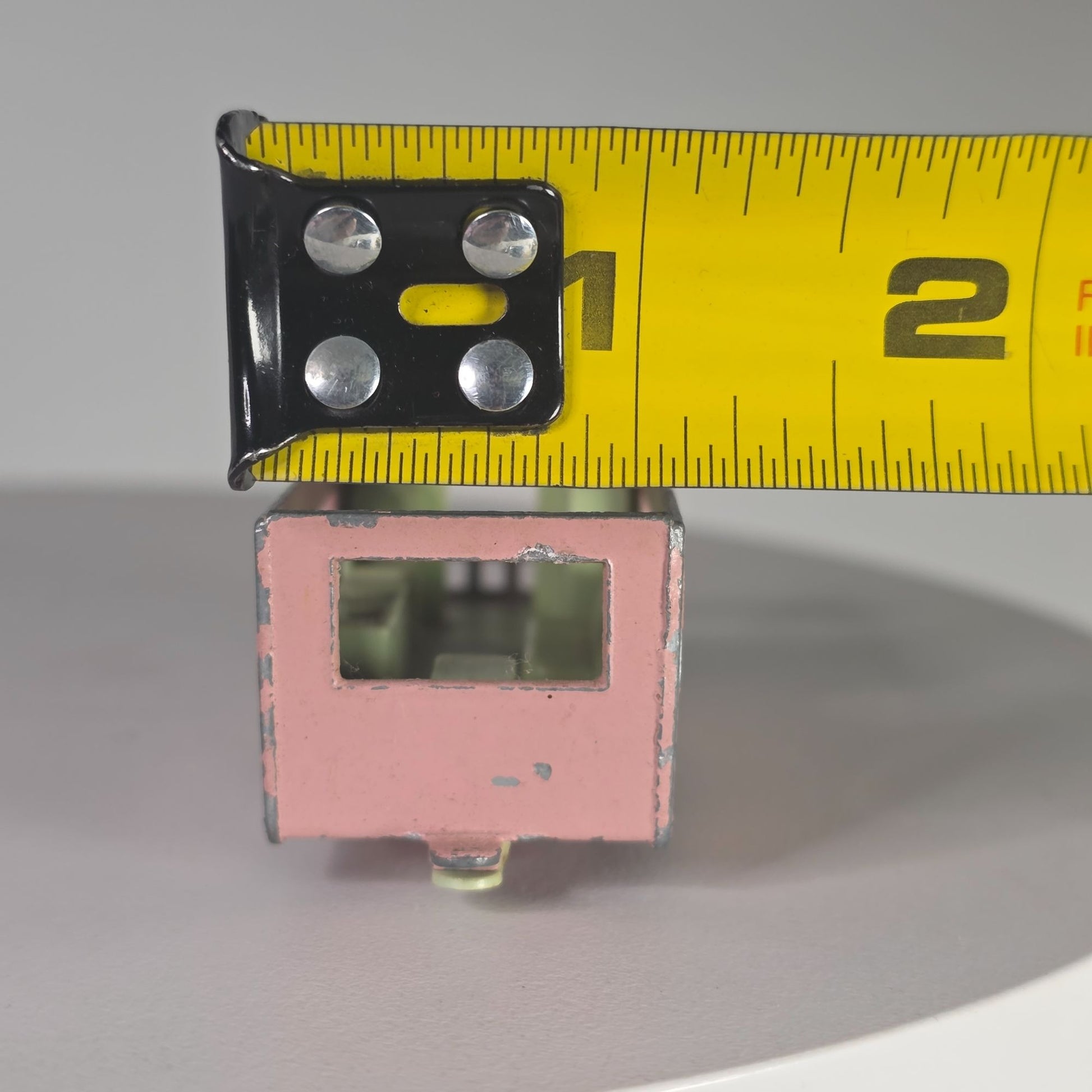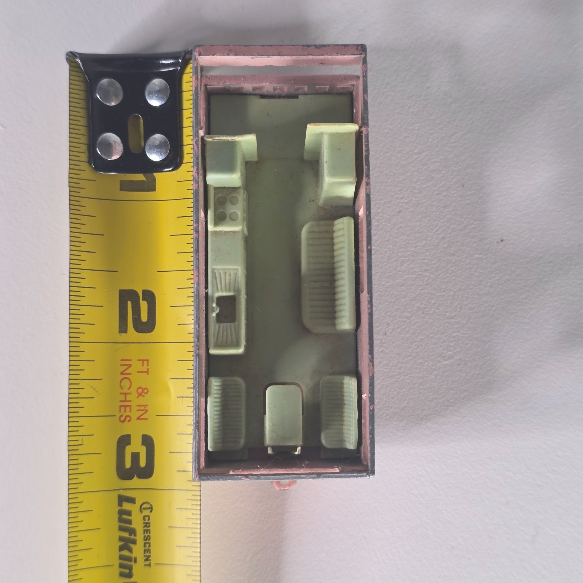 Scratches and paint wear visible on exterior. Measurements: Length = 2.5 inches, Height = 1 inch, Width = 1 inch.