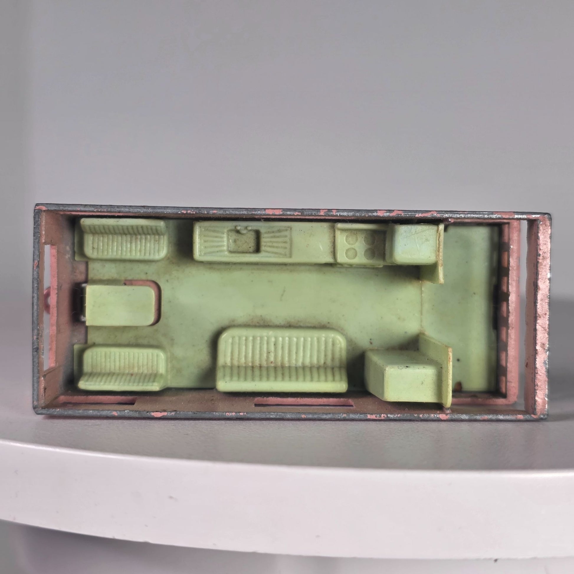 This charming vintage Lesney Matchbox Series No. 23 trailer caravan is a delightful collectible piece. Crafted with precision, its pink exterior is complemented by a quaint interior, providing a nostalgic glimpse into mid-20th-century toy design. Its petite size allows for easy display, making it a cherished addition to any collection.