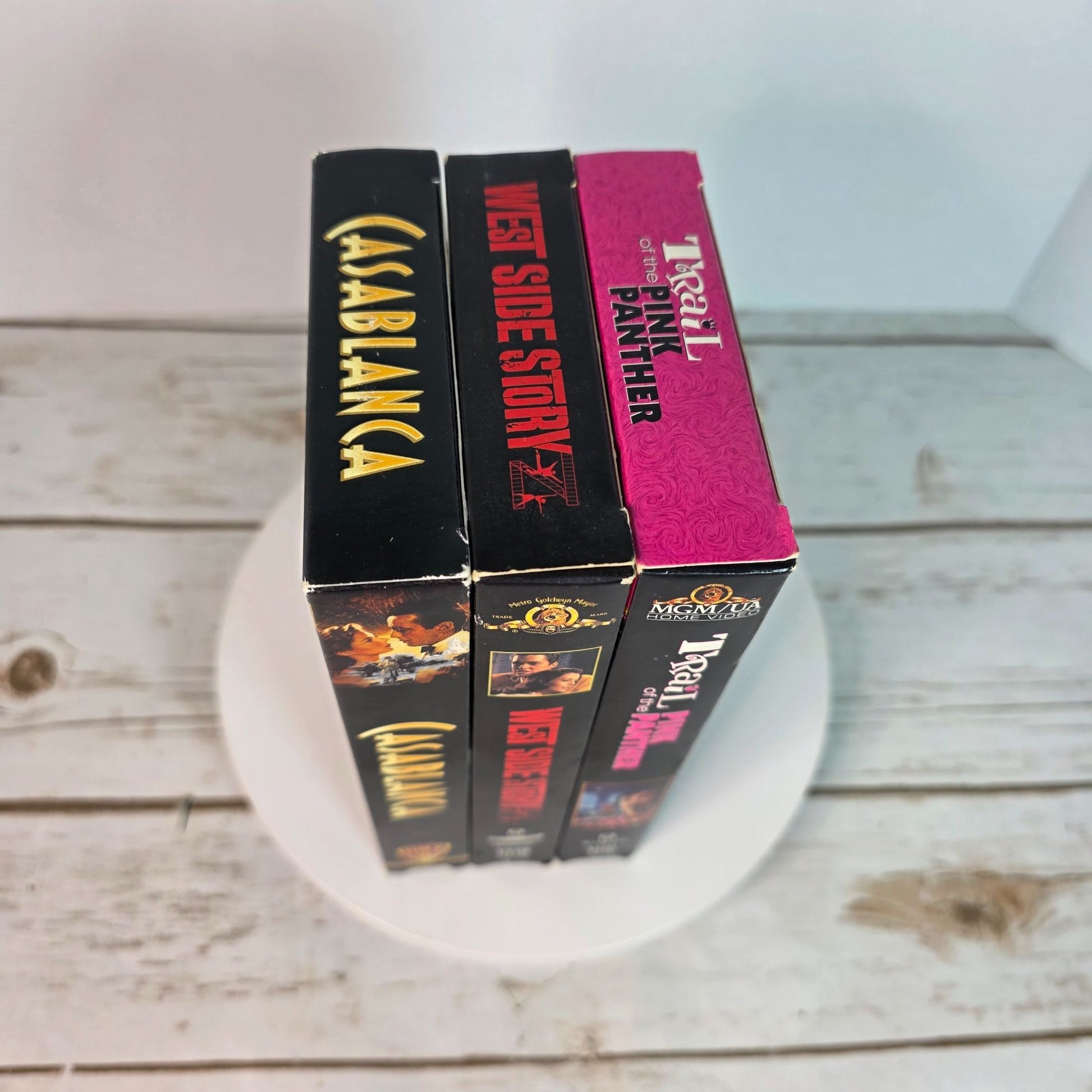 Step into a nostalgic journey with this trio of classic films on VHS. Relive the romance of "Casablanca," the passion of "West Side Story," and the humor of "Trail Of The Pink Panther." Each tape captures the essence of timeless storytelling, evoking emotions and memories from a golden era of cinema.