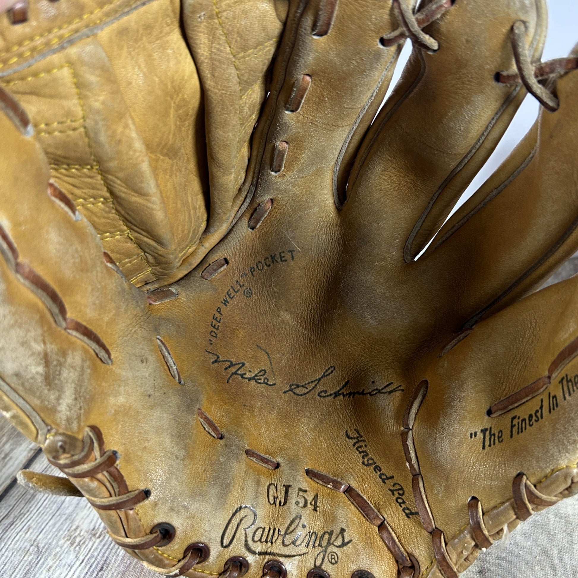 An exquisite collection of vintage baseball gloves showcasing Rawlings' craftsmanship, including the rare GJ54 Mike Schmidt model. A nostalgic treasure for collectors.